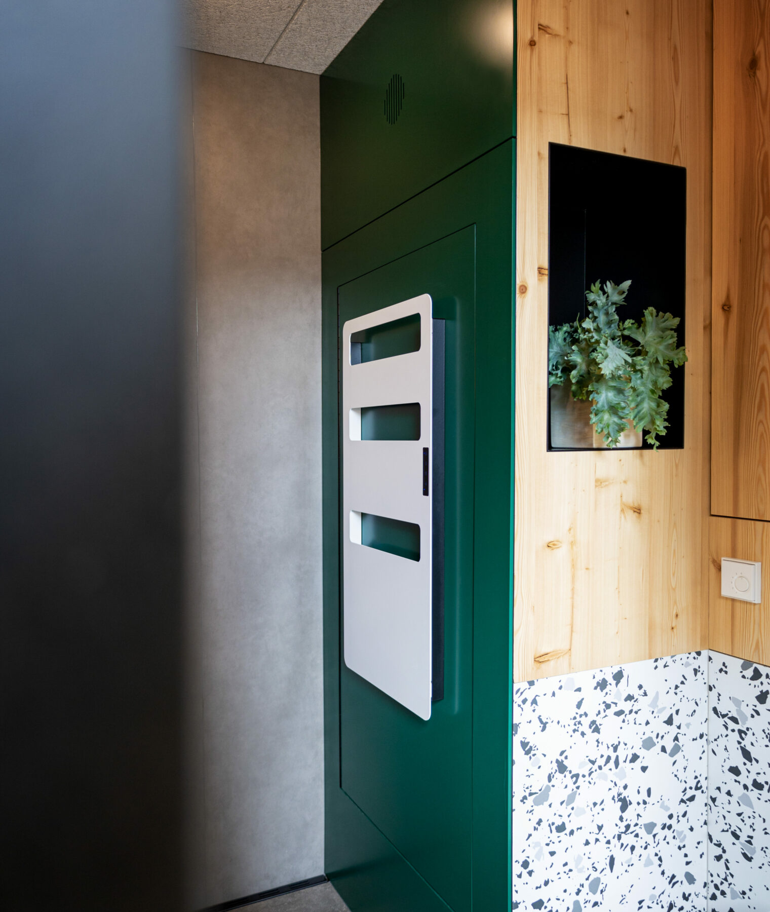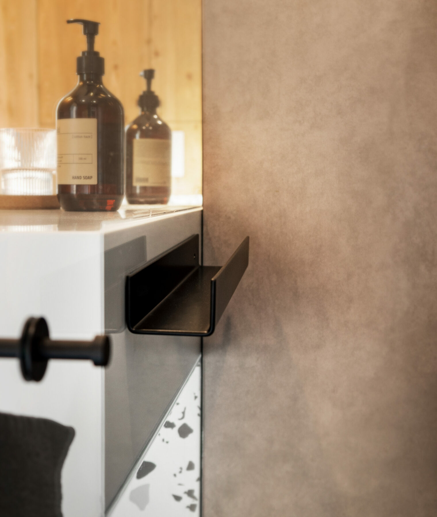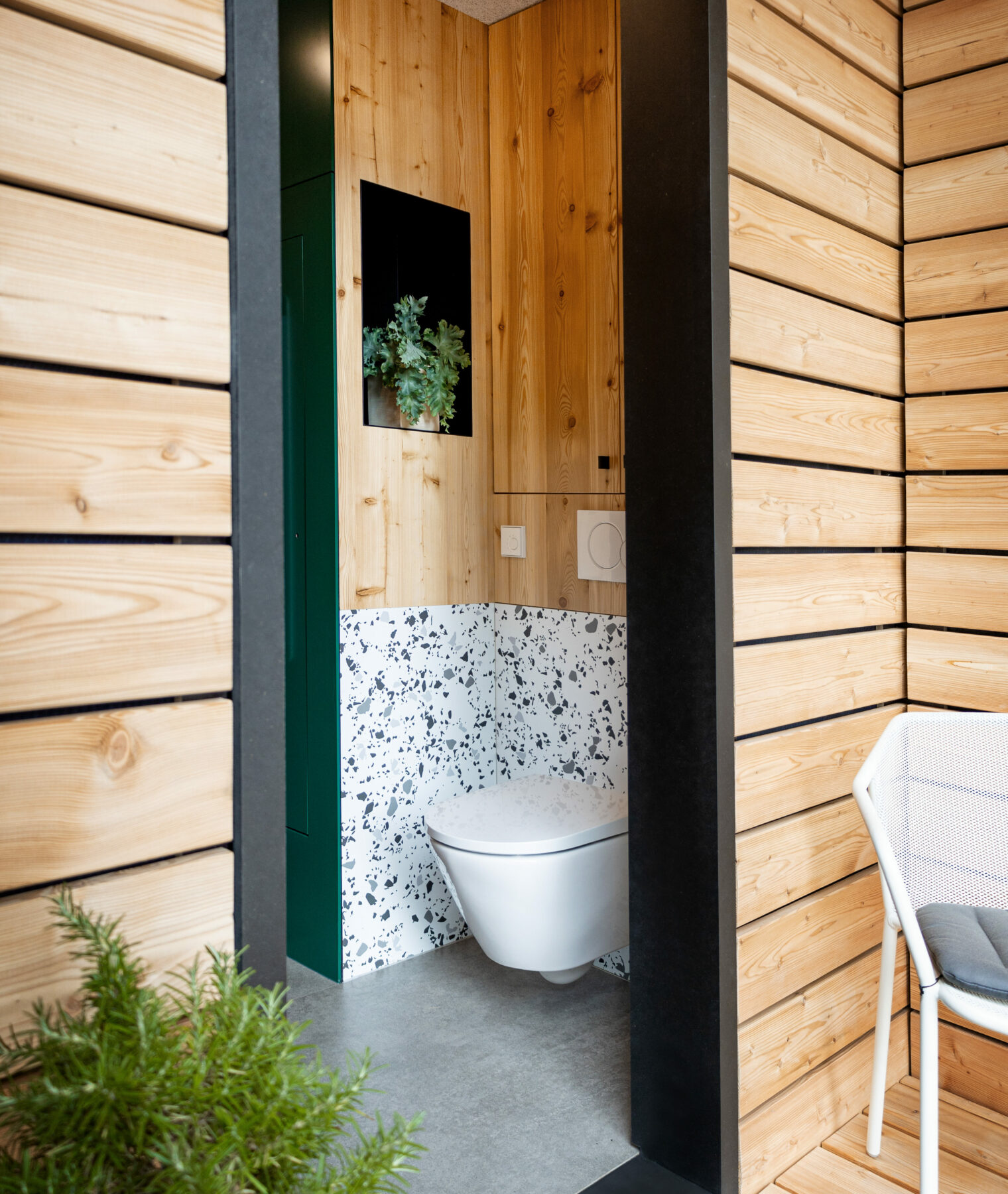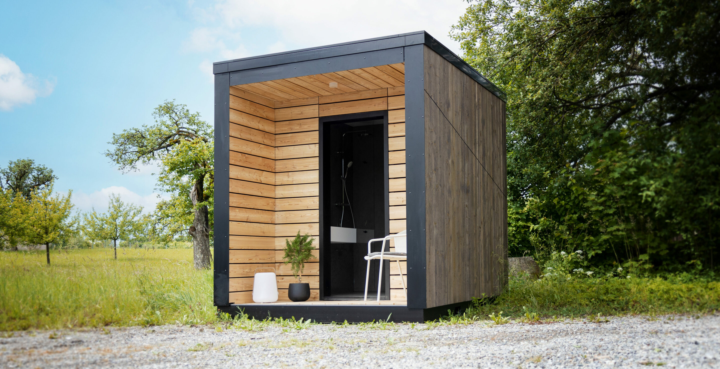 A bathroom container that guests rent exclusively for their stay. Or as a bathroom for you alone. At your favourite place. Or for events. Or… or… Simply for wherever a bathroom is still missing. WC, washbasin, shower, towel dryer, built-in cupboard – everything on approx. 7 sqm. An ingenious room concept makes it possible. A USB Au charging station and other gadgets are on top.