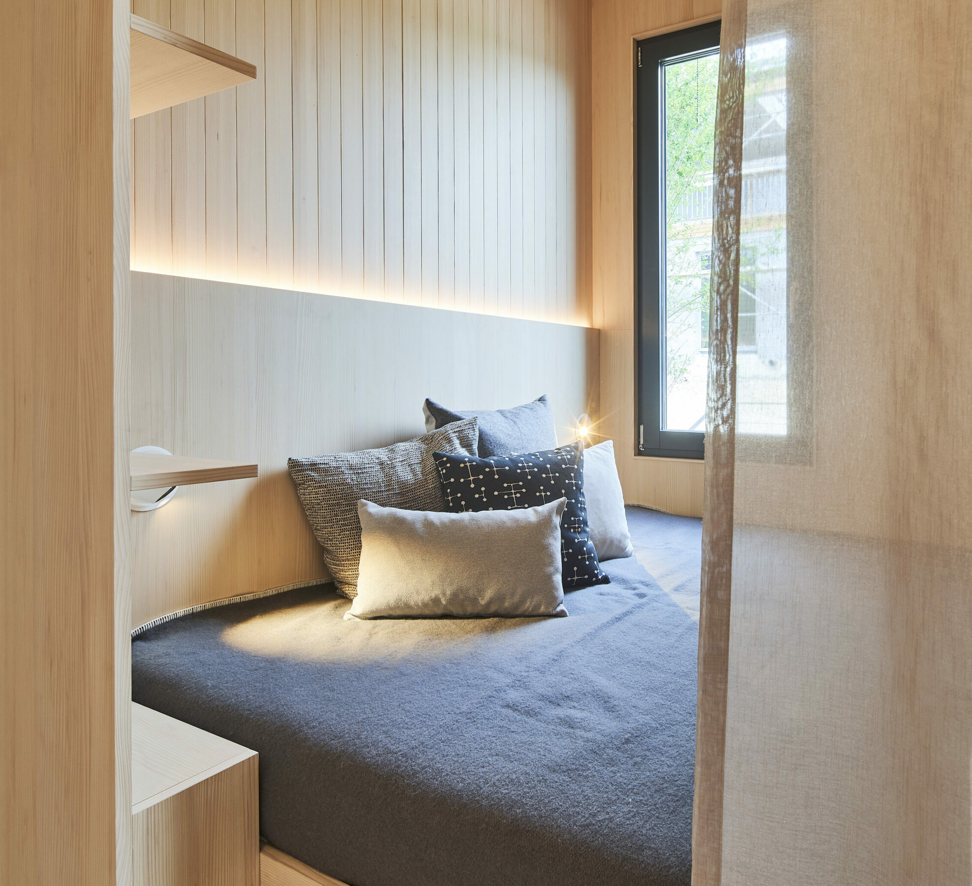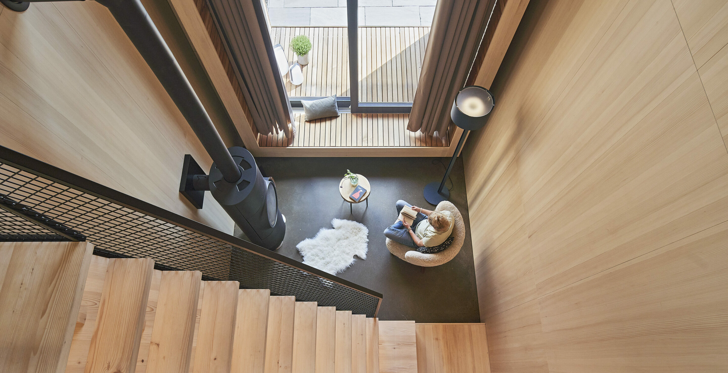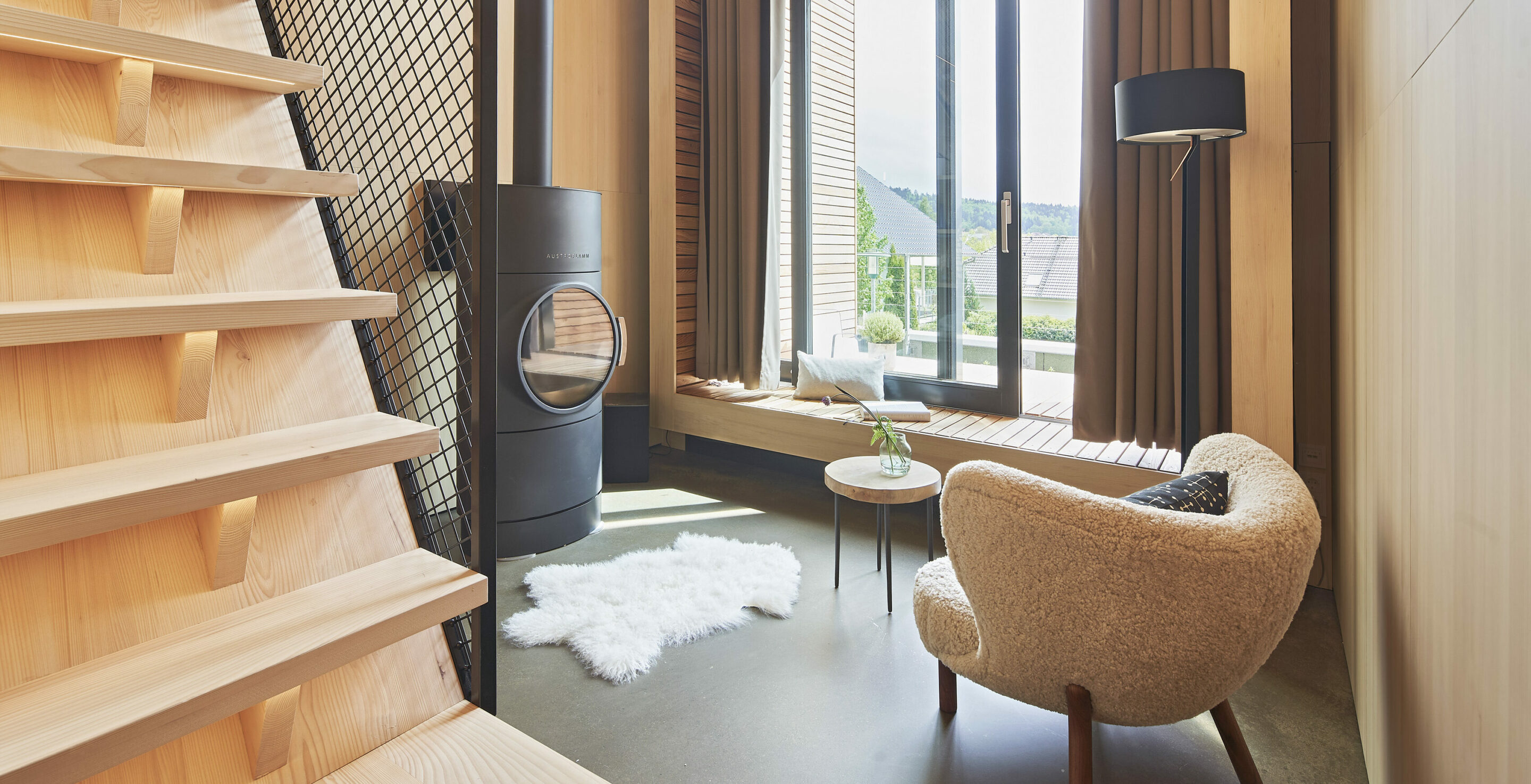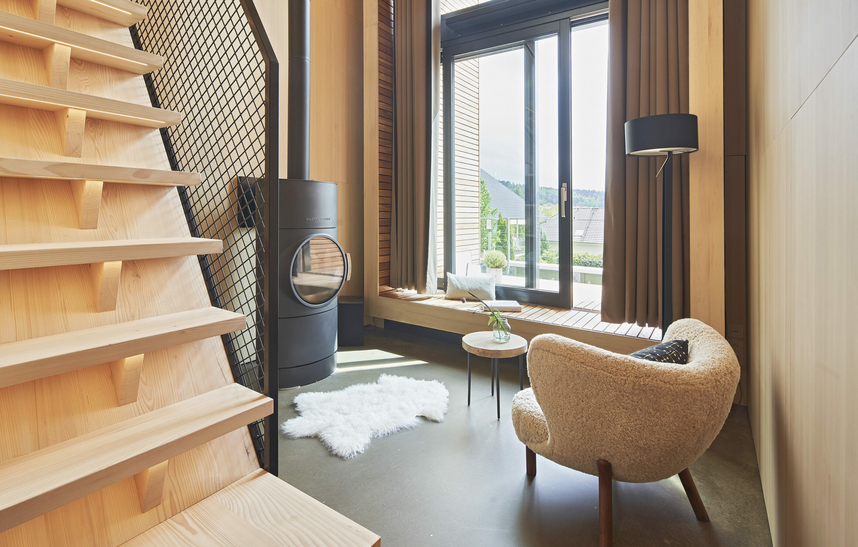 In addition to the bunk with double bed, which is separated from the living area by a curtain, there are two further beds on the first level (approx. 8 m²) and a fifth sleeping place on the second level (approx. 5 m²). Towards the window front, the living area, equipped with a cosy armchair and a wood-burning stove, is open to the roof at a height of more than five metres. The floor-to-ceiling window elements open onto the terrace, which is integrated into the façade by a wooden frame. Whatever the season, a short stay in the guesthouse promises muse and diversion. It is the few and restrained materials that radiate calm and comfort in equal measure: Silver fir on the walls, floors and fixtures, exposed screed in the living area and large sand-coloured tiles in the bathroom. By the way, there is no kitchen in the guest house. Cooking and eating are done together in the family home.