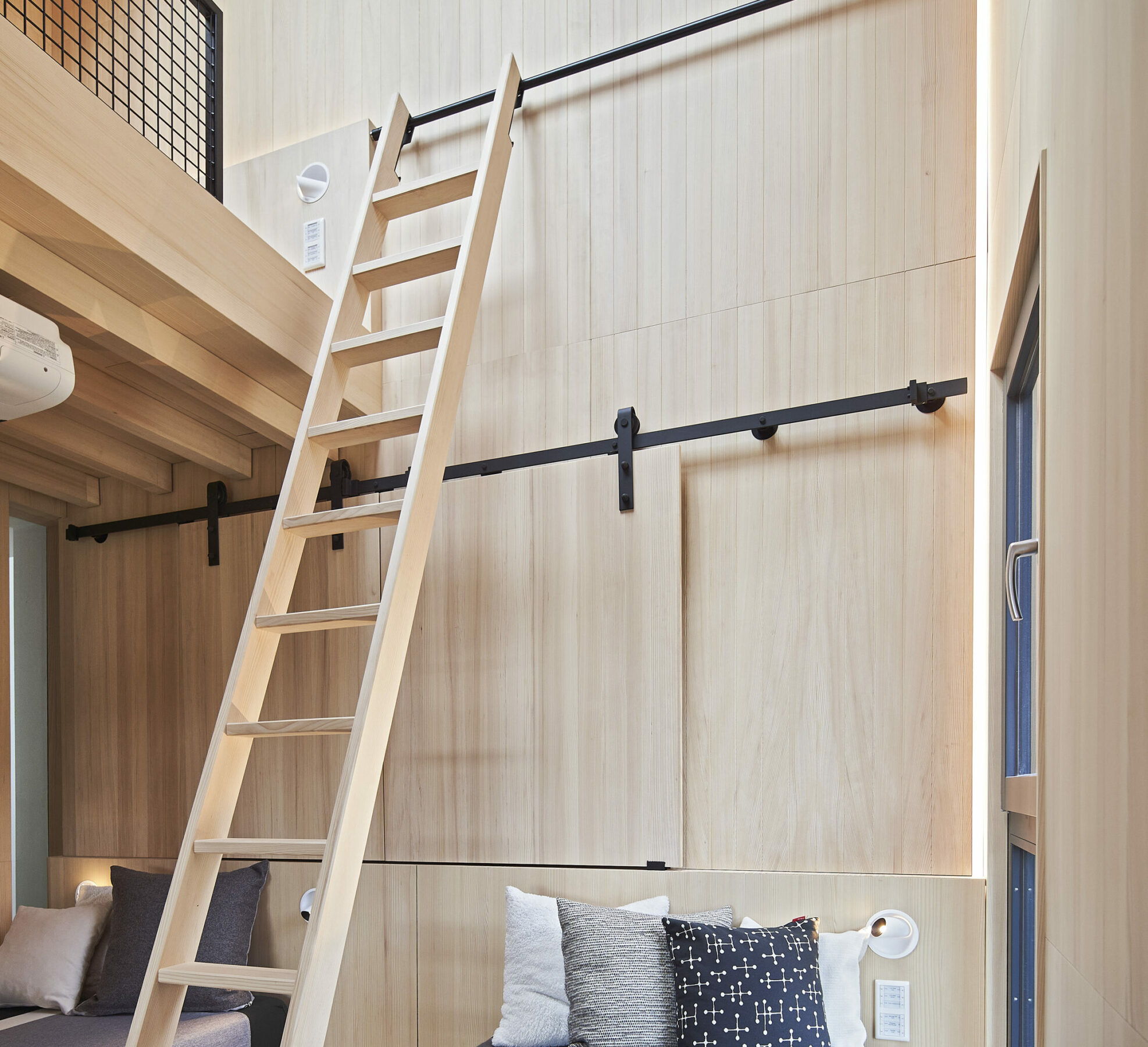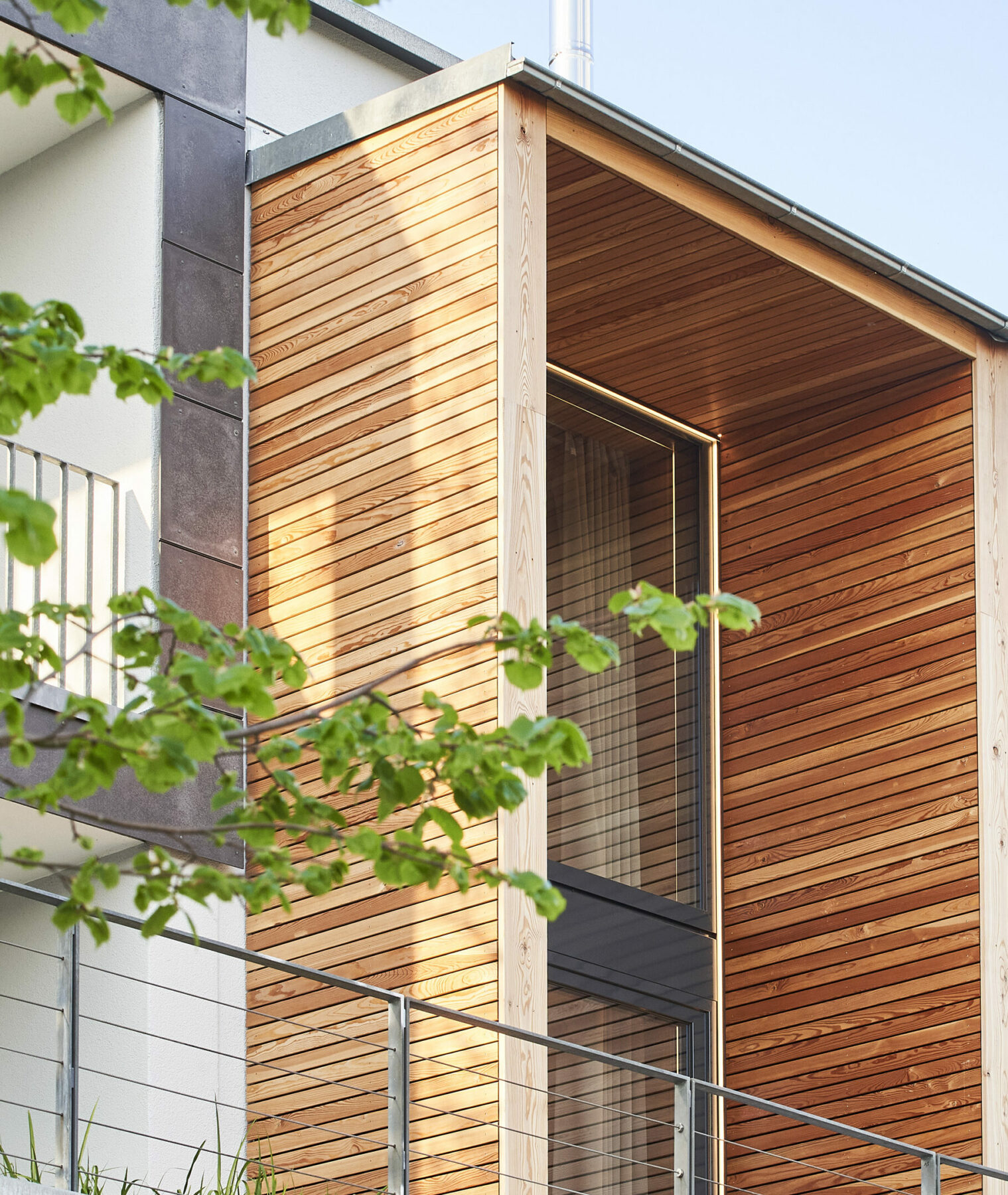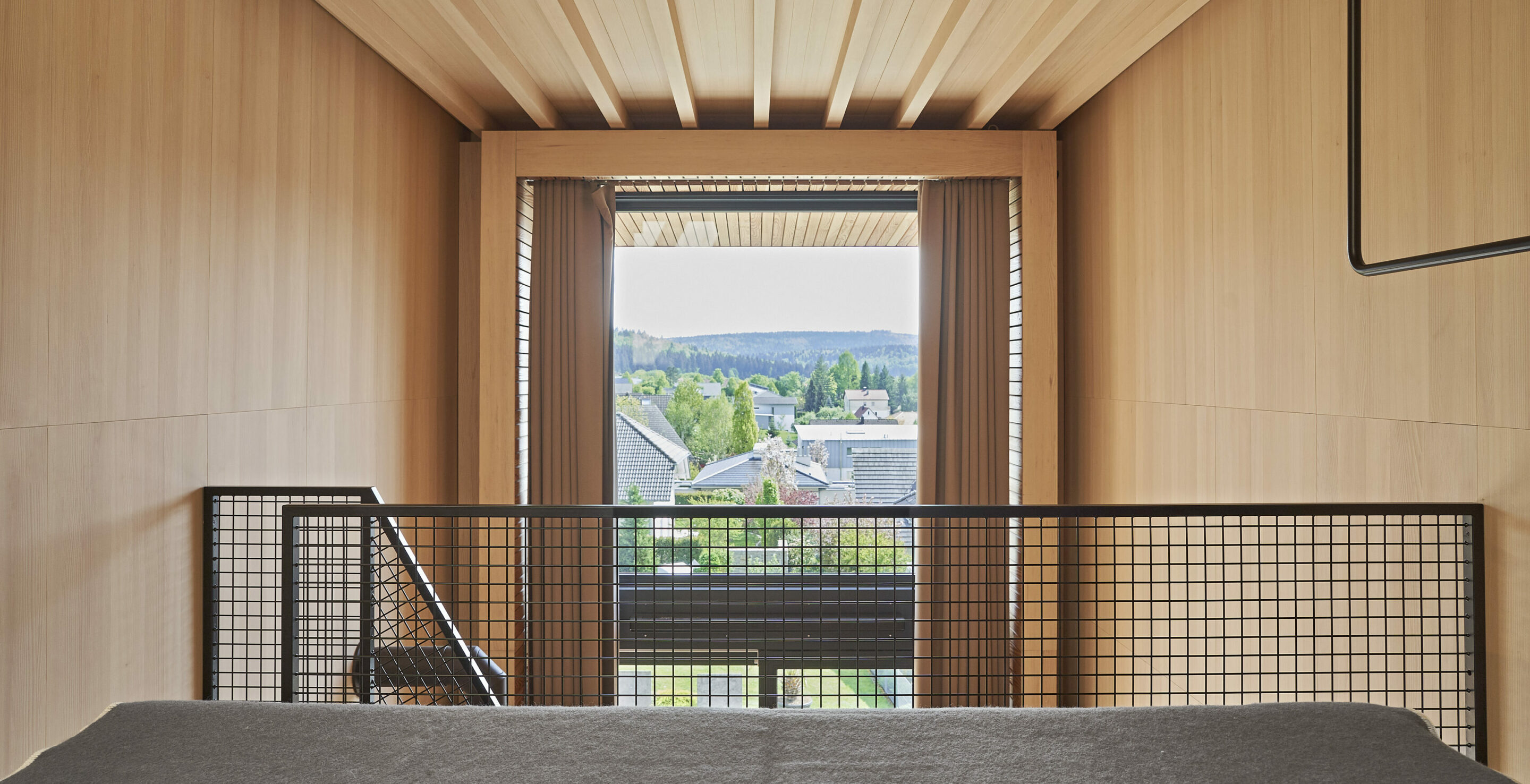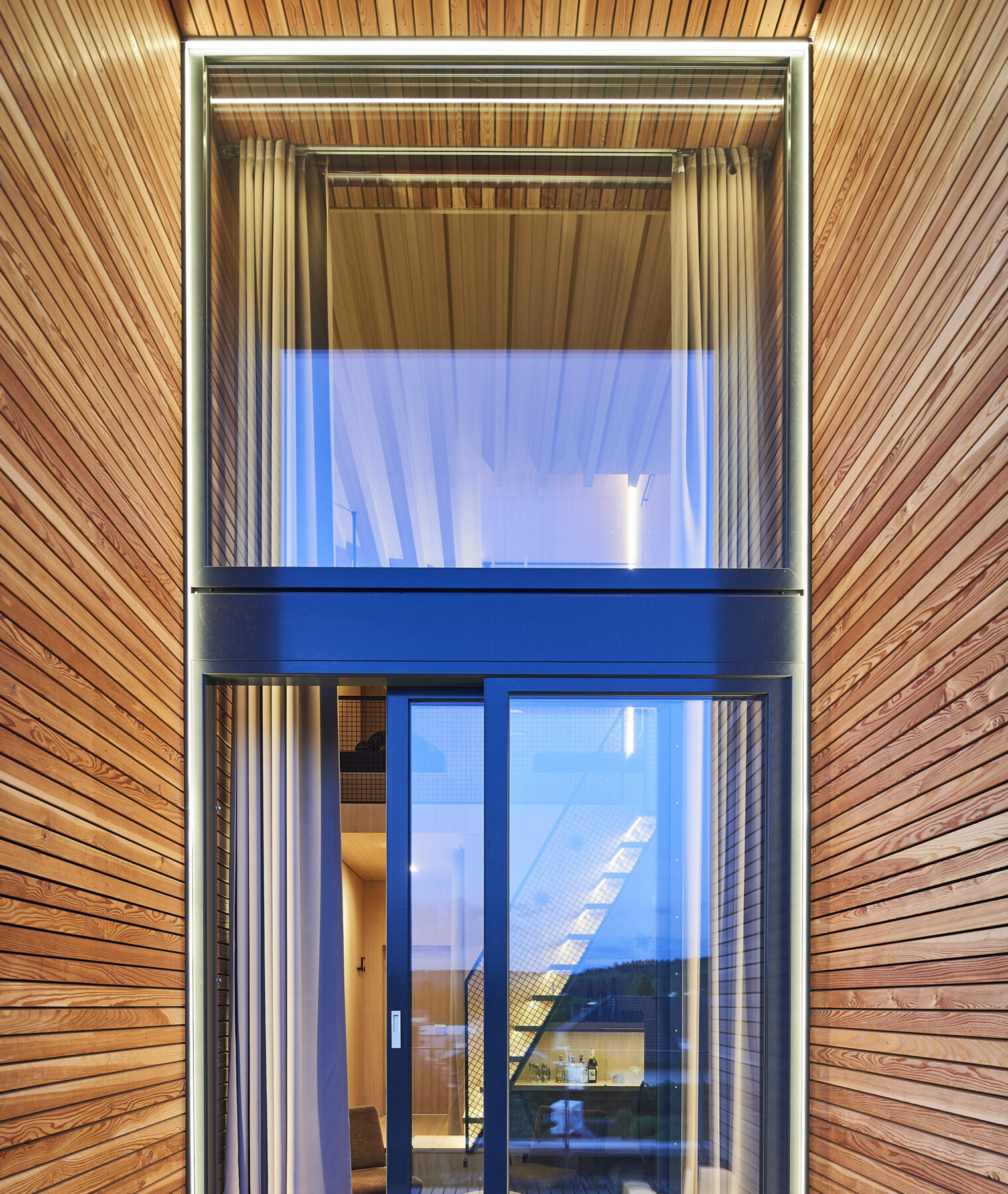In addition to the bunk with double bed, which is separated from the living area by a curtain, there are two further beds on the first level (approx. 8 m²) and a fifth sleeping place on the second level (approx. 5 m²). Towards the window front, the living area, equipped with a cosy armchair and a wood-burning stove, is open to the roof at a height of more than five metres. The floor-to-ceiling window elements open onto the terrace, which is integrated into the façade by a wooden frame. Whatever the season, a short stay in the guesthouse promises muse and diversion. It is the few and restrained materials that radiate calm and comfort in equal measure: Silver fir on the walls, floors and fixtures, exposed screed in the living area and large sand-coloured tiles in the bathroom. By the way, there is no kitchen in the guest house. Cooking and eating are done together in the family home.