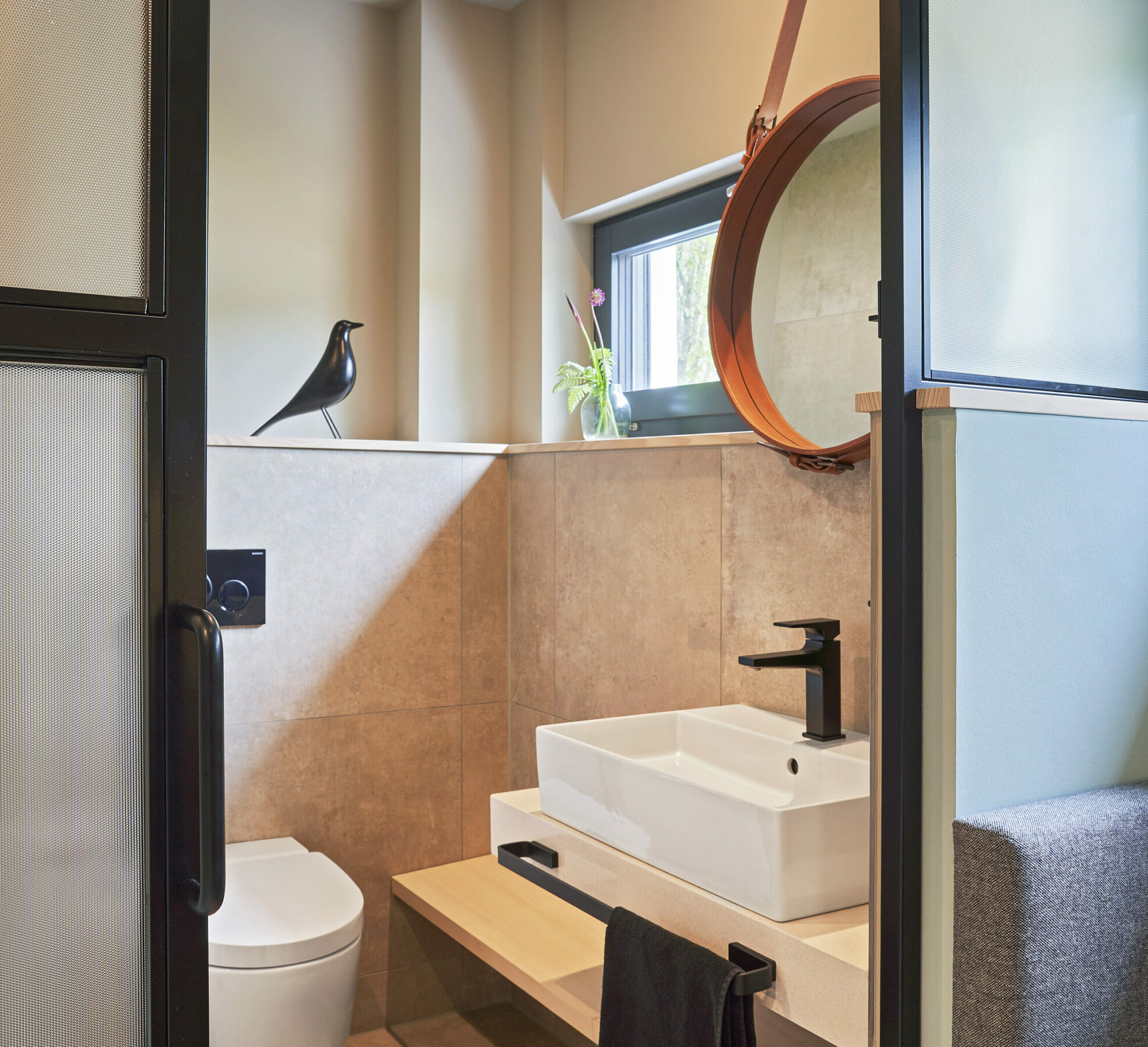 The guest bathroom and the entrance hall with its integrated workspace are located in the existing building and represent the only access to the new building. For this reason, both rooms already speak its interior design language: friendly colours, natural materials and straight-lined furnishings characterise the homey feel of the retreat.