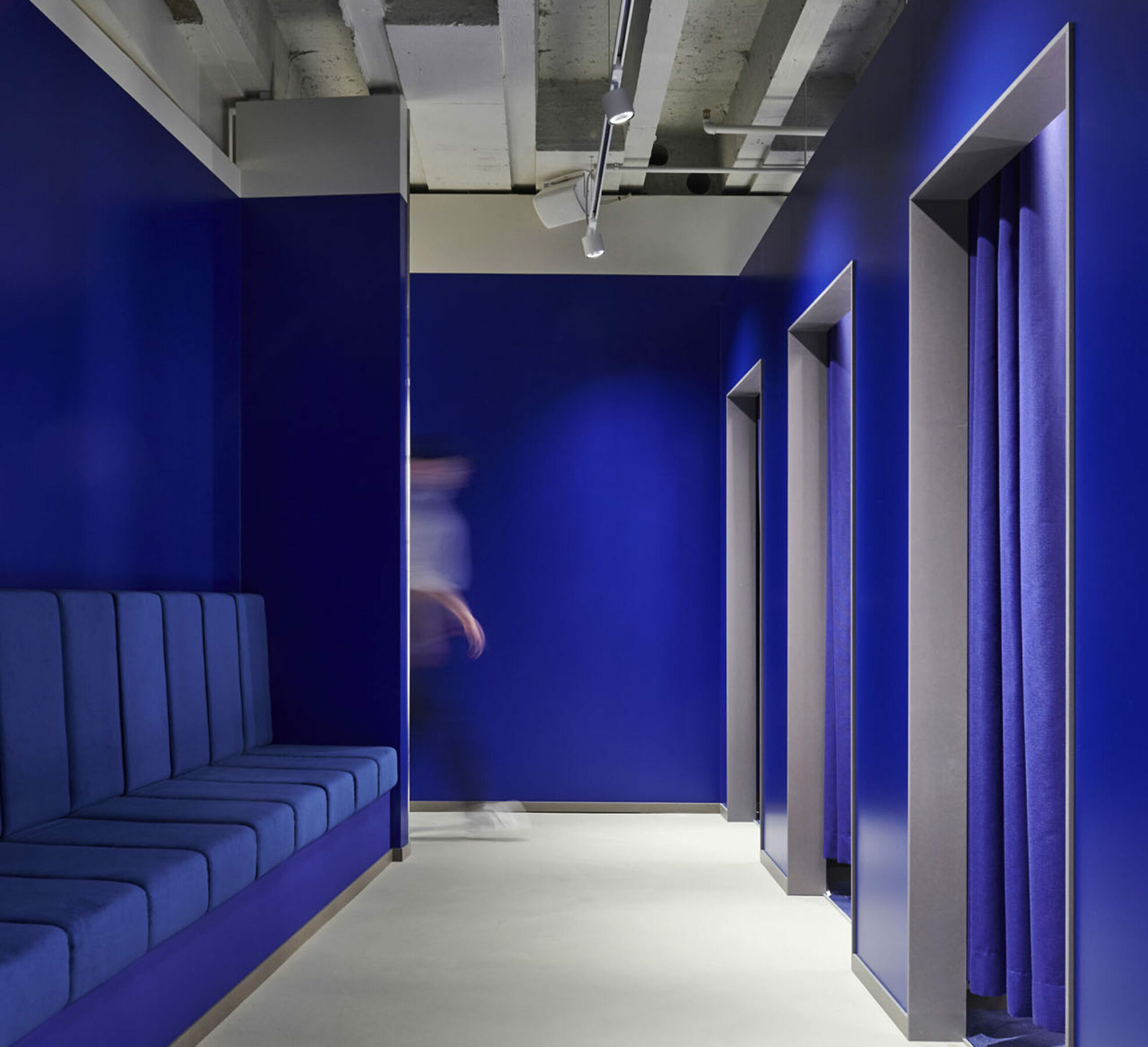 The urban gray of the floor, ceiling and furniture paired with calm pine wood sets the tone. However again and again self-confident, bright colors flash through. Rich blue, orange and yellow define the different areas and at the same time convey an irresistible nonchalance. Huge photographs and illustrations provide a pinch of big city flair à la Berlin, Paris and London. Here and there, small groups of seats that say with a wink: “Hey, make yourself comfortable – sit down, relax and enjoy life” While the bare concrete pillars and the openly laid ventilation pipes and cable ducts set the right counterpoint and show with unobtrusive clarity what really matters. Reduce to the max.