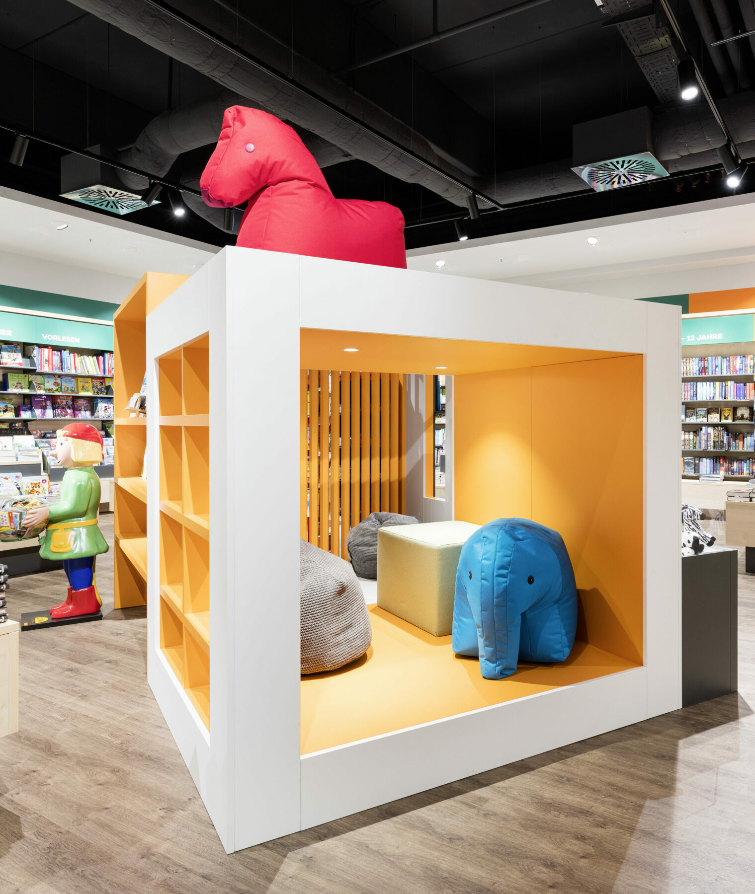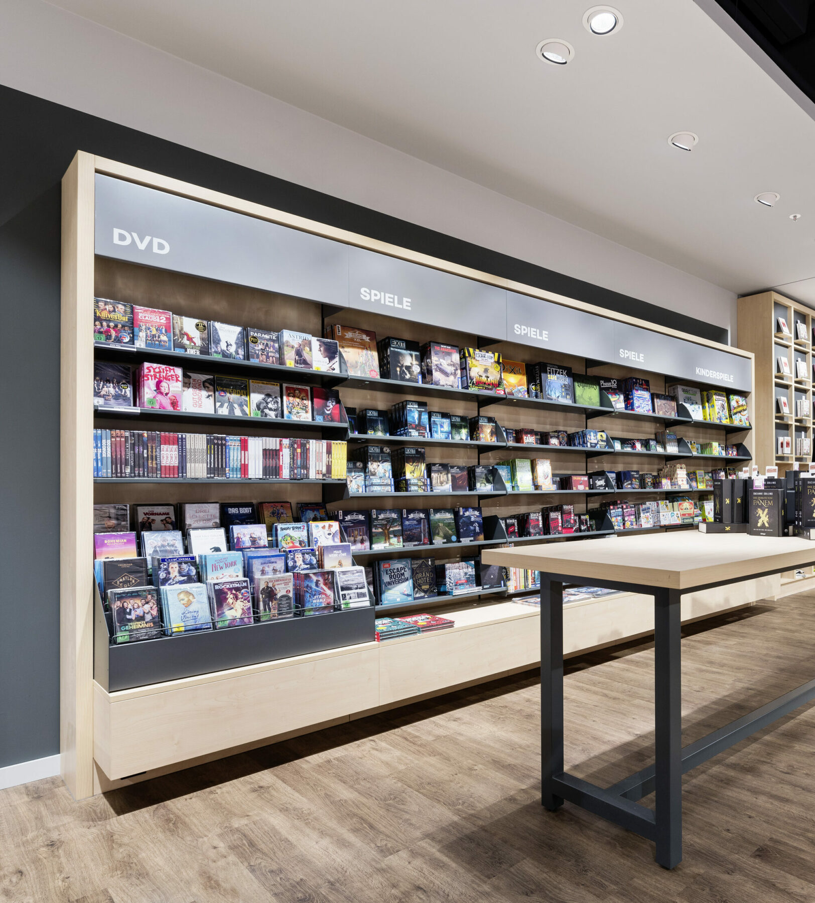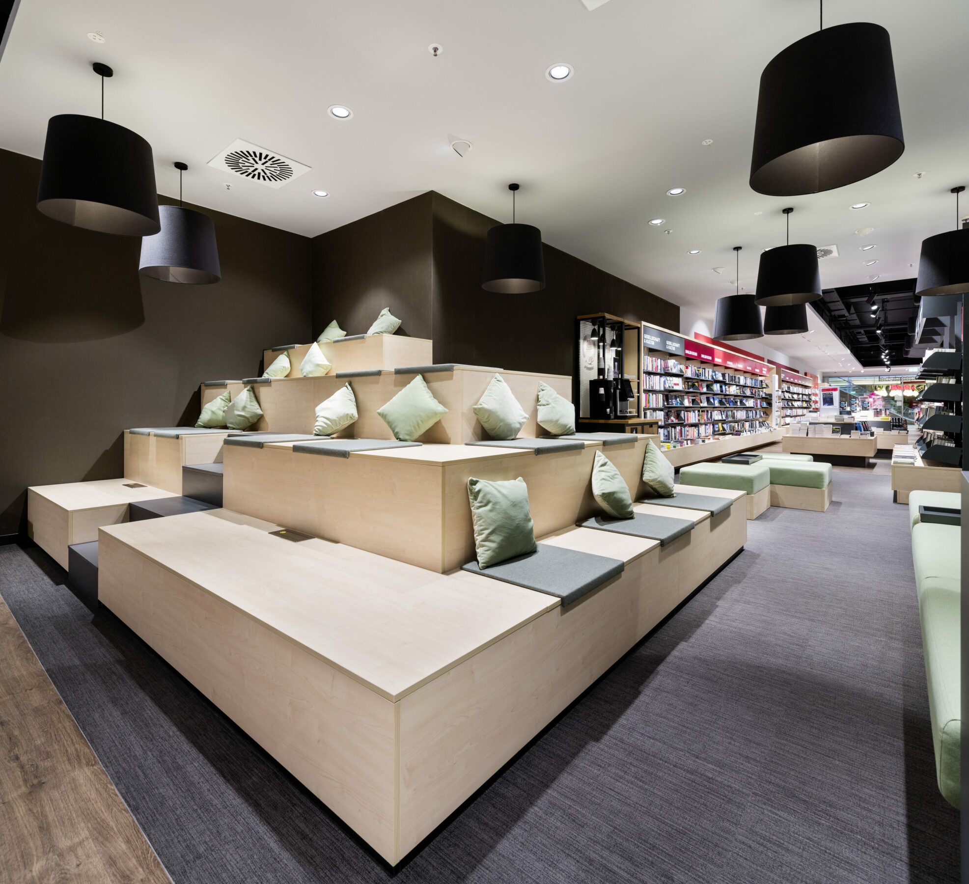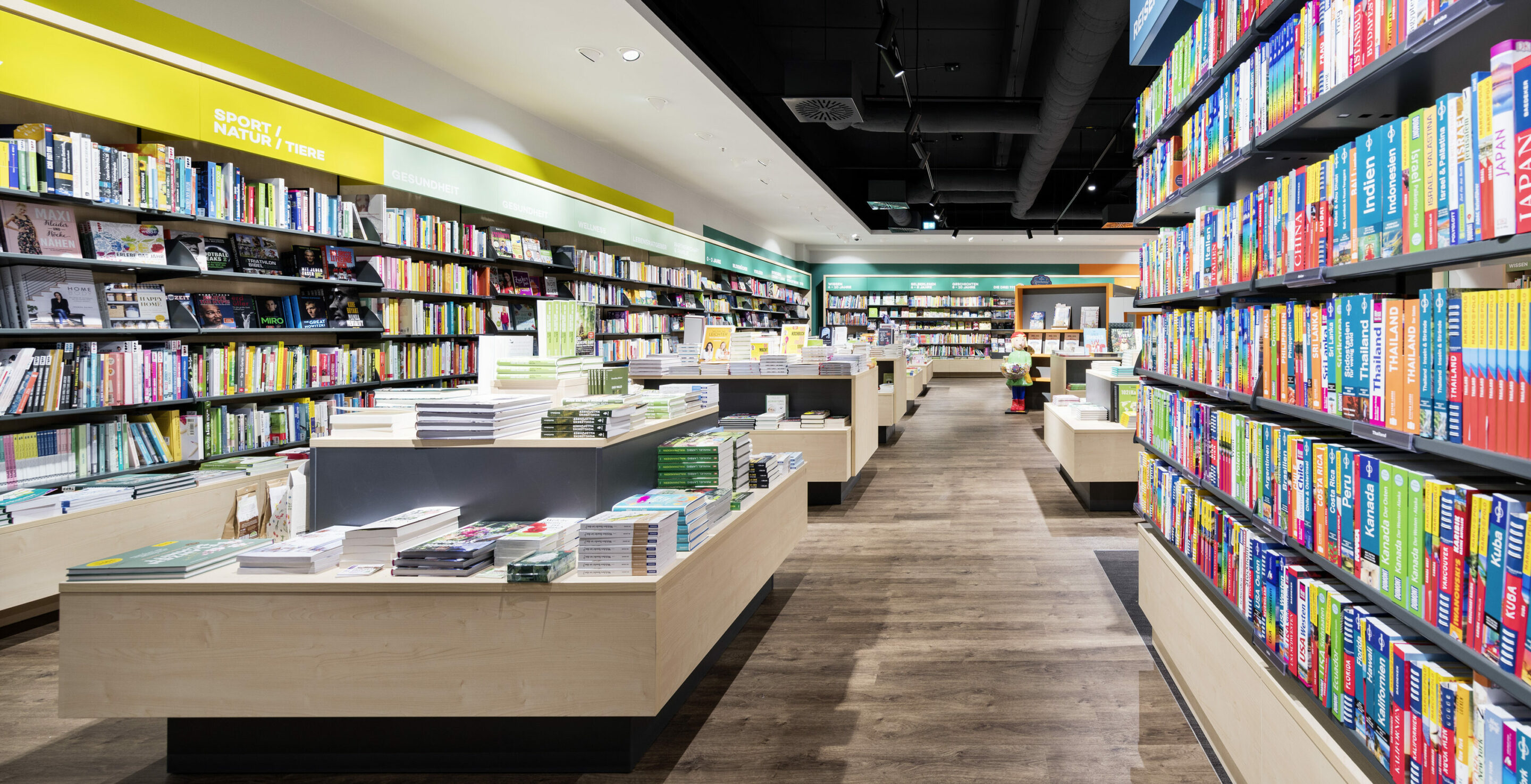With a new concept, Hugendubel presents the whole world of books. Light wood, long shelves and spacious tables invite customers to browse. Colored markings and conspicuously contrasting highlight walls make it easier to find your way around the comprehensive range. The lounge area with coffee bar is coated in muted colors in velvety nuances, while the play area for children is dipped in bright orange.
