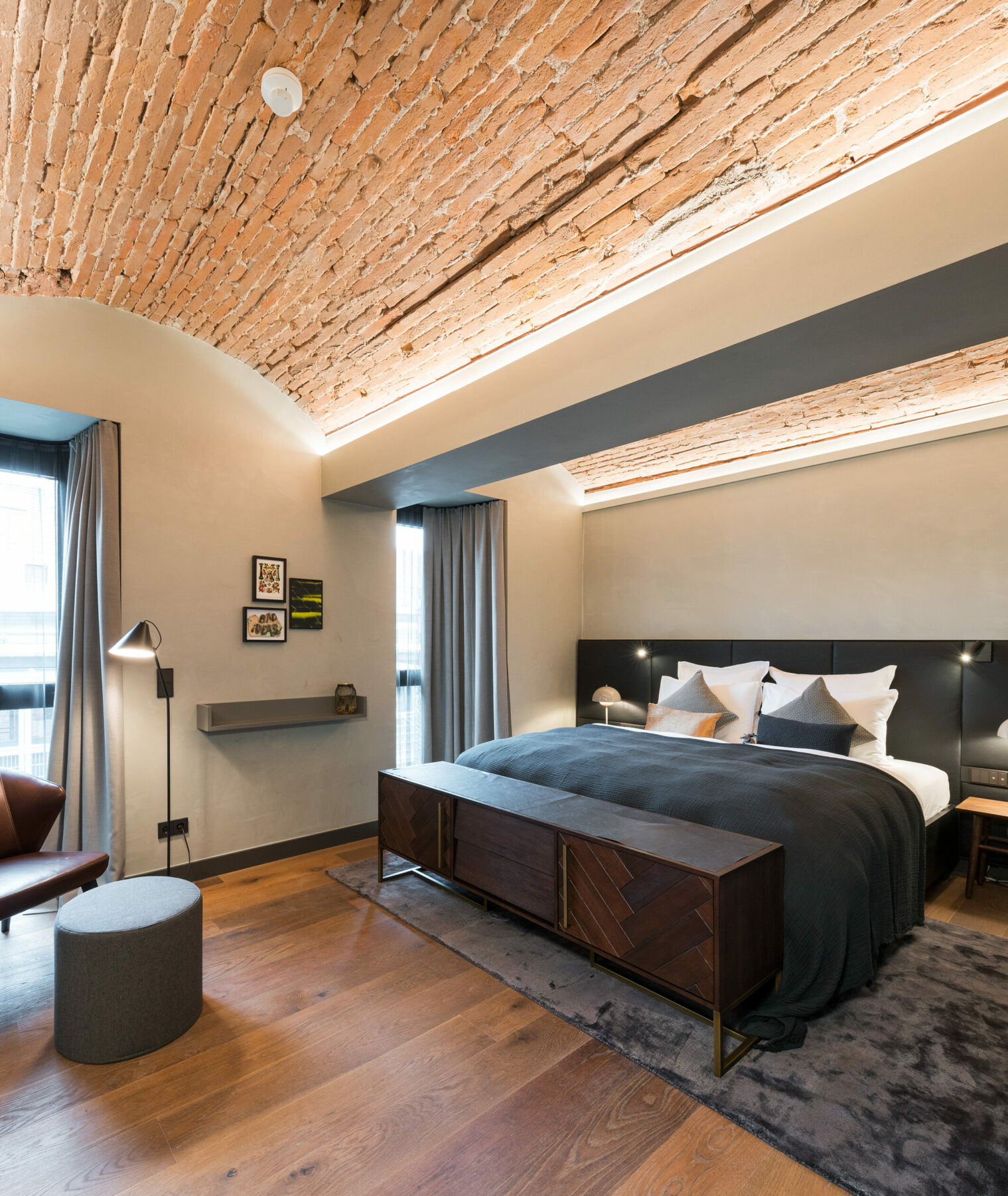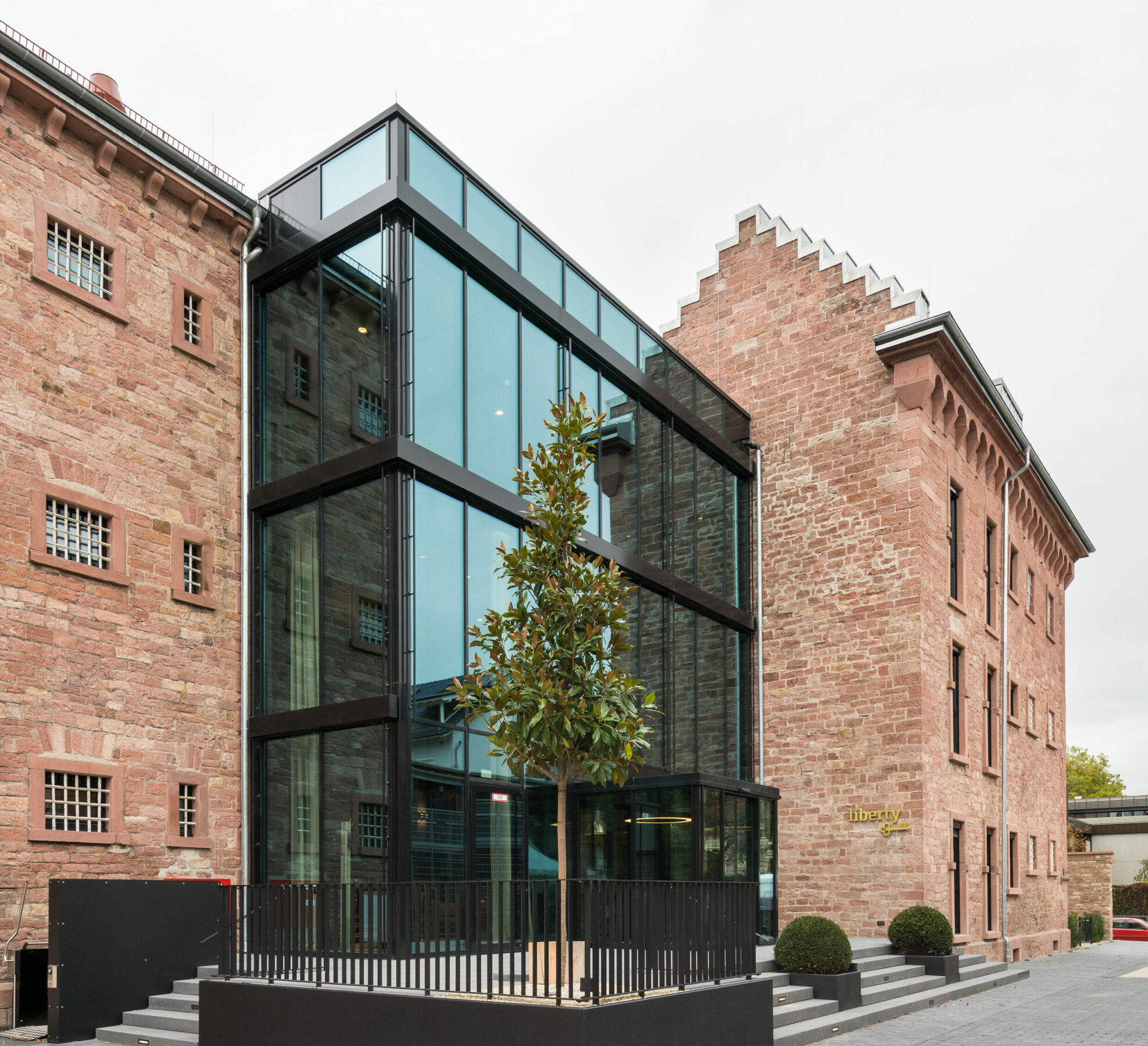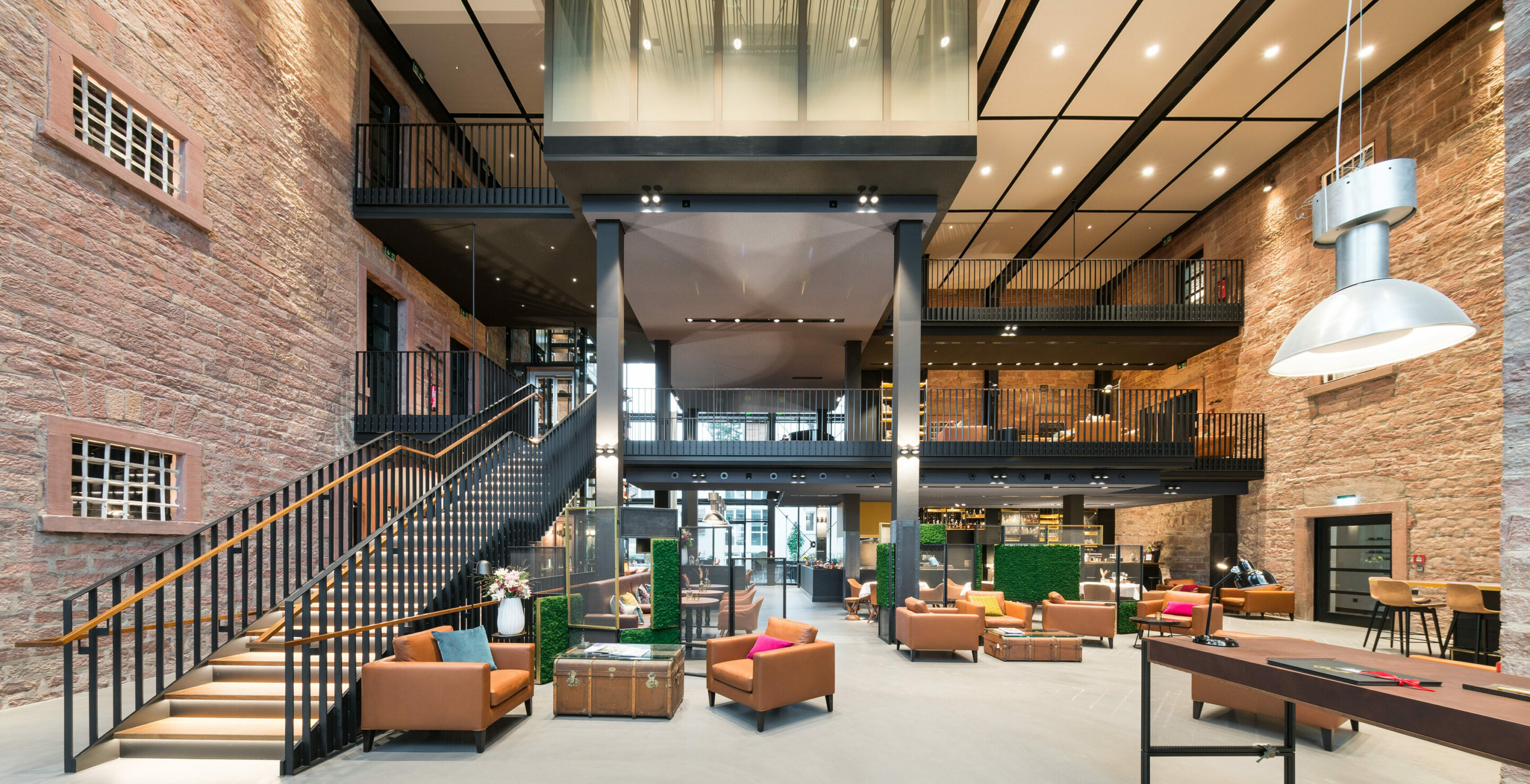 The hotel consists of two separate buildings and a new intermediate building. The rooms and suites are distributed in the buildings, the public area with restaurant, bar and lobby is located in the large glass cube sitting in between. On the one hand, it is a visual link between the two hotel wings, but it also symbolises the former prison yard. On an intermediate level, a living room for the hotel guests was built in, based on the former common room of the prisoners.