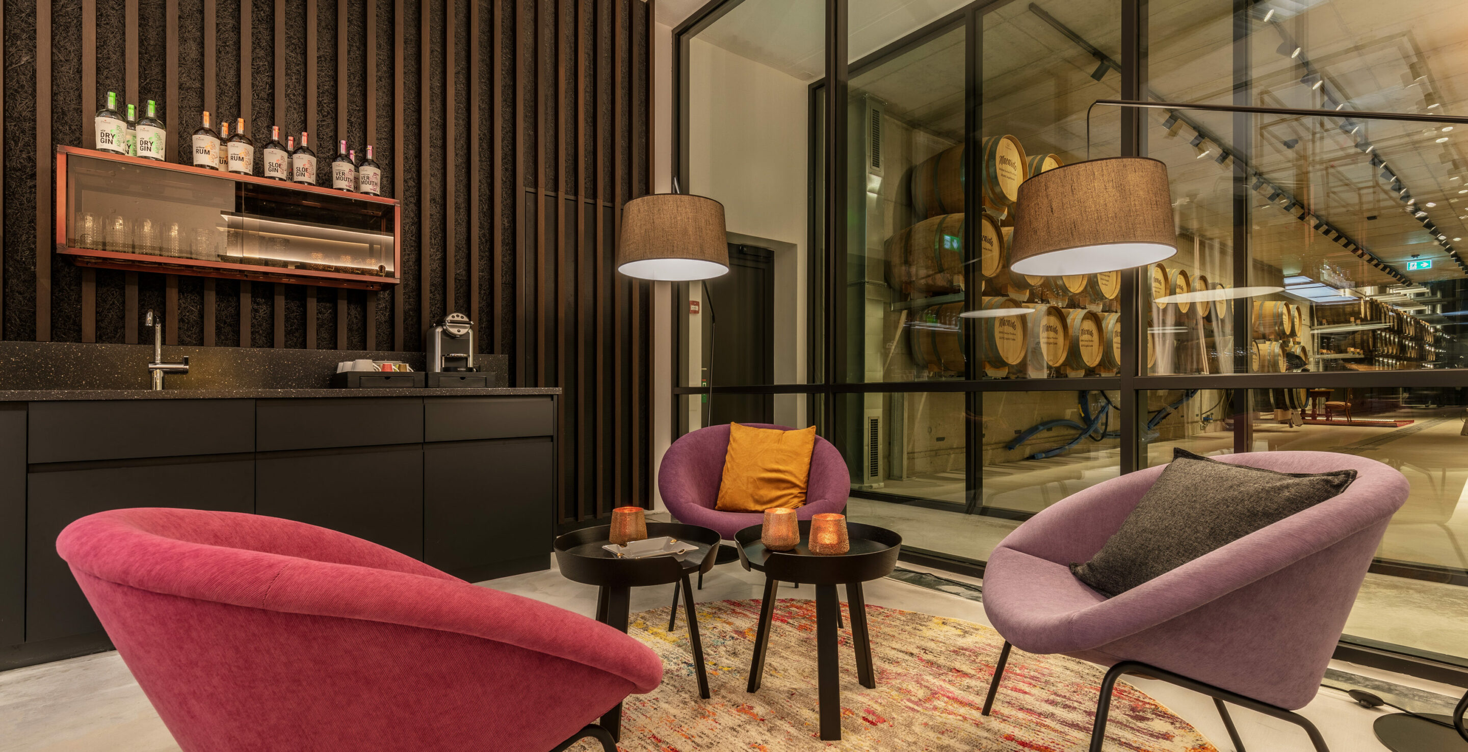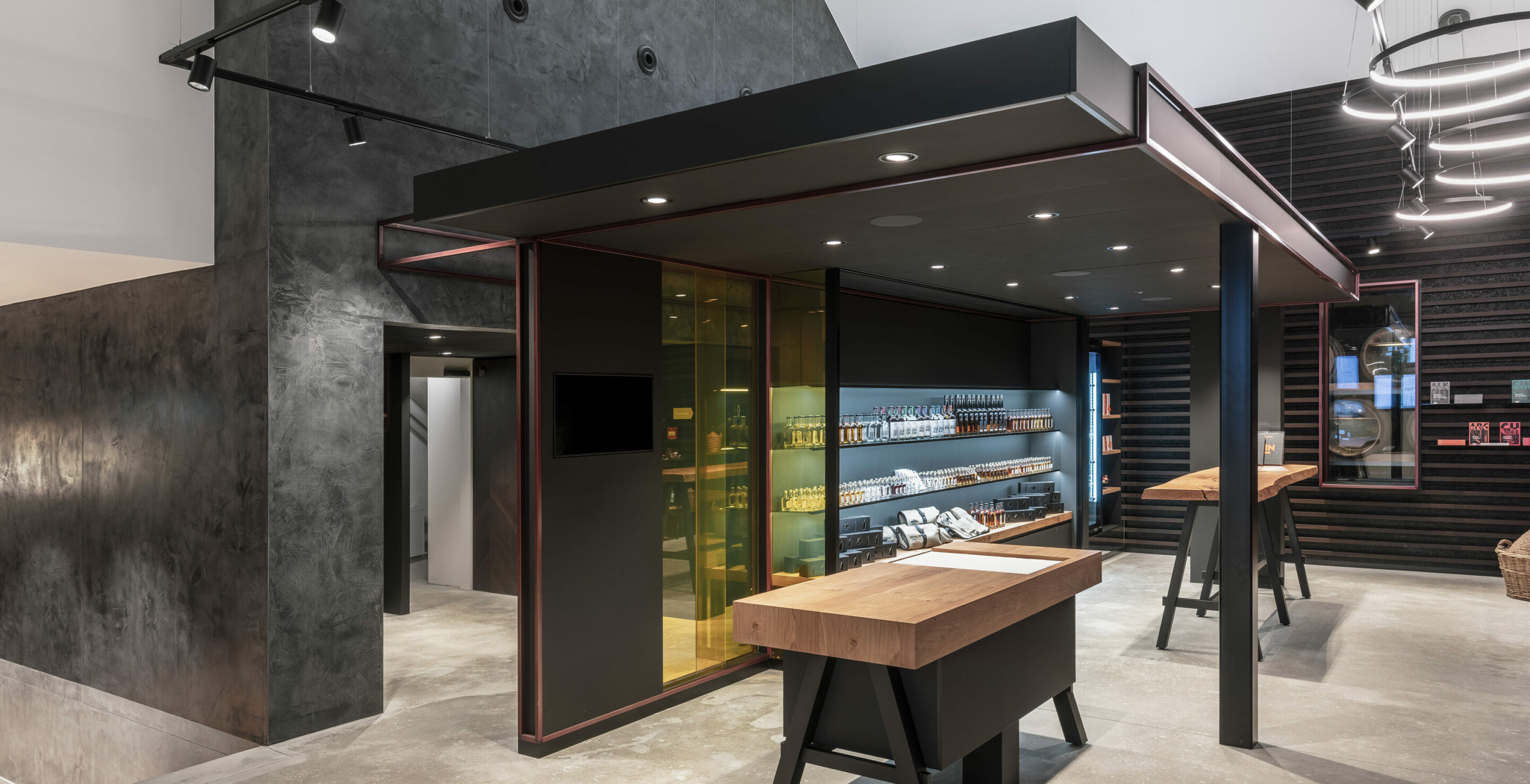 When it came to the interior design concept, we stayed very close to the actual Macardo product. We took a closer look at the oak barrels and the distillates and drew conclusions about the design.