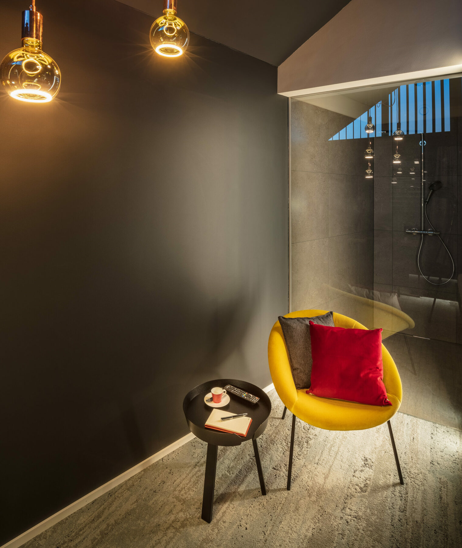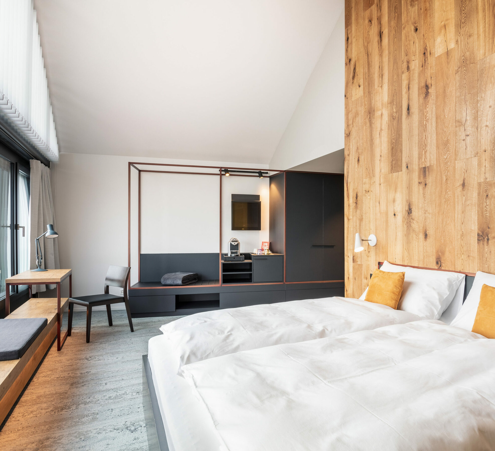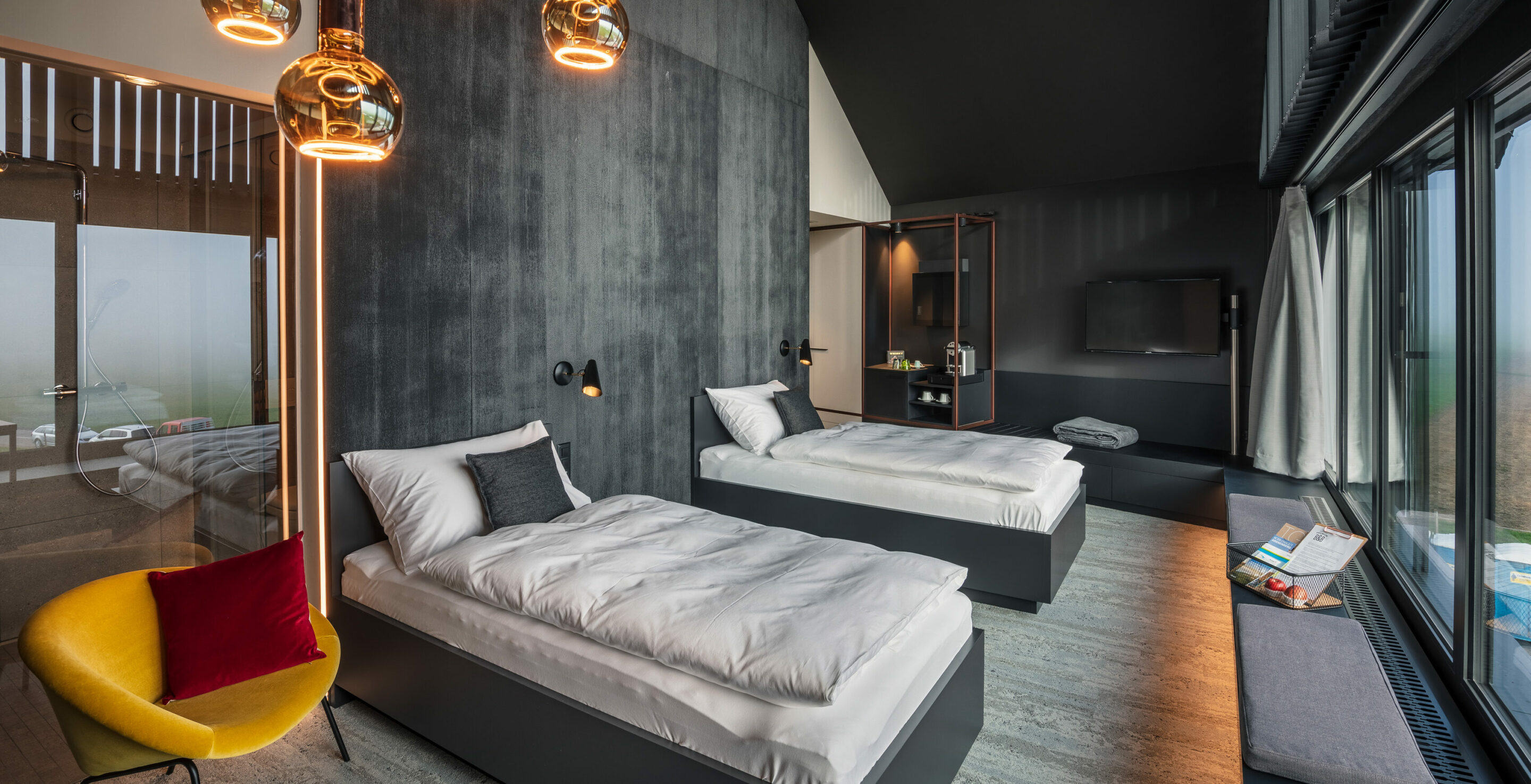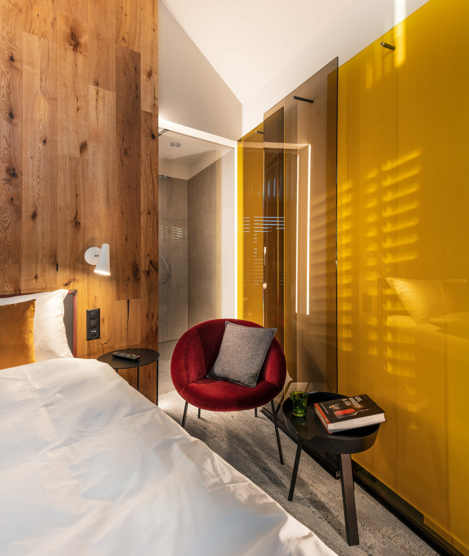 Just as the wood inside the oak barrel refines the taste of a whiskey, it also gives the room its own note. The different characters of natural and burnt oak represent the most important design element. The light and almost black woods run through all areas and are weighted more or less depending on the desired atmosphere. The staggered glass panes in shades of yellow create a colored accent as room dividers. They shape an optical depth effect that is intensified by shining sunlight and are reminiscent of the multi-layered distillate in the swivel of a glass.