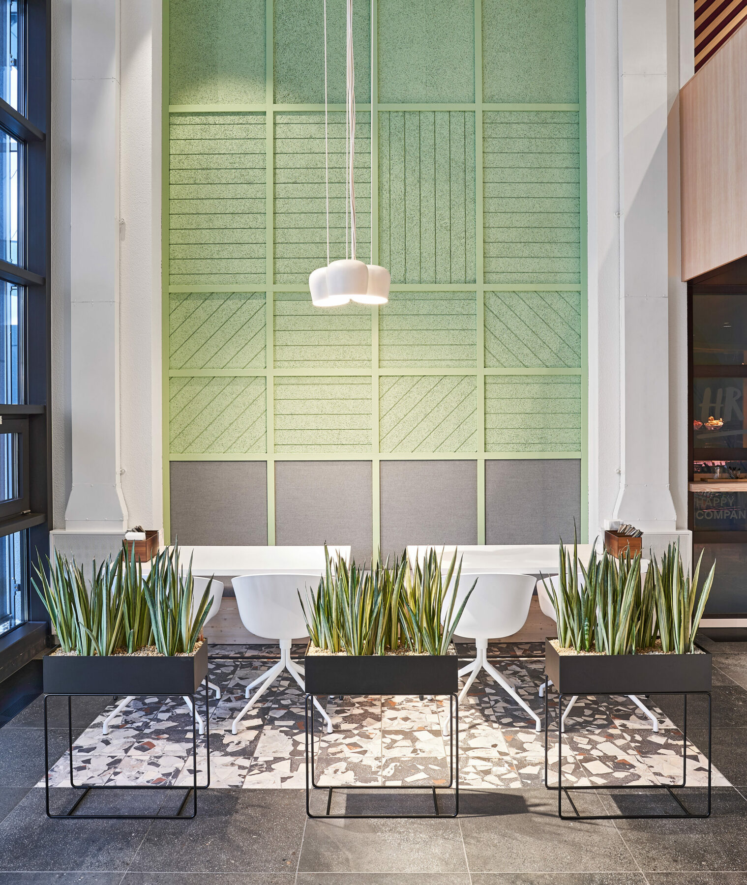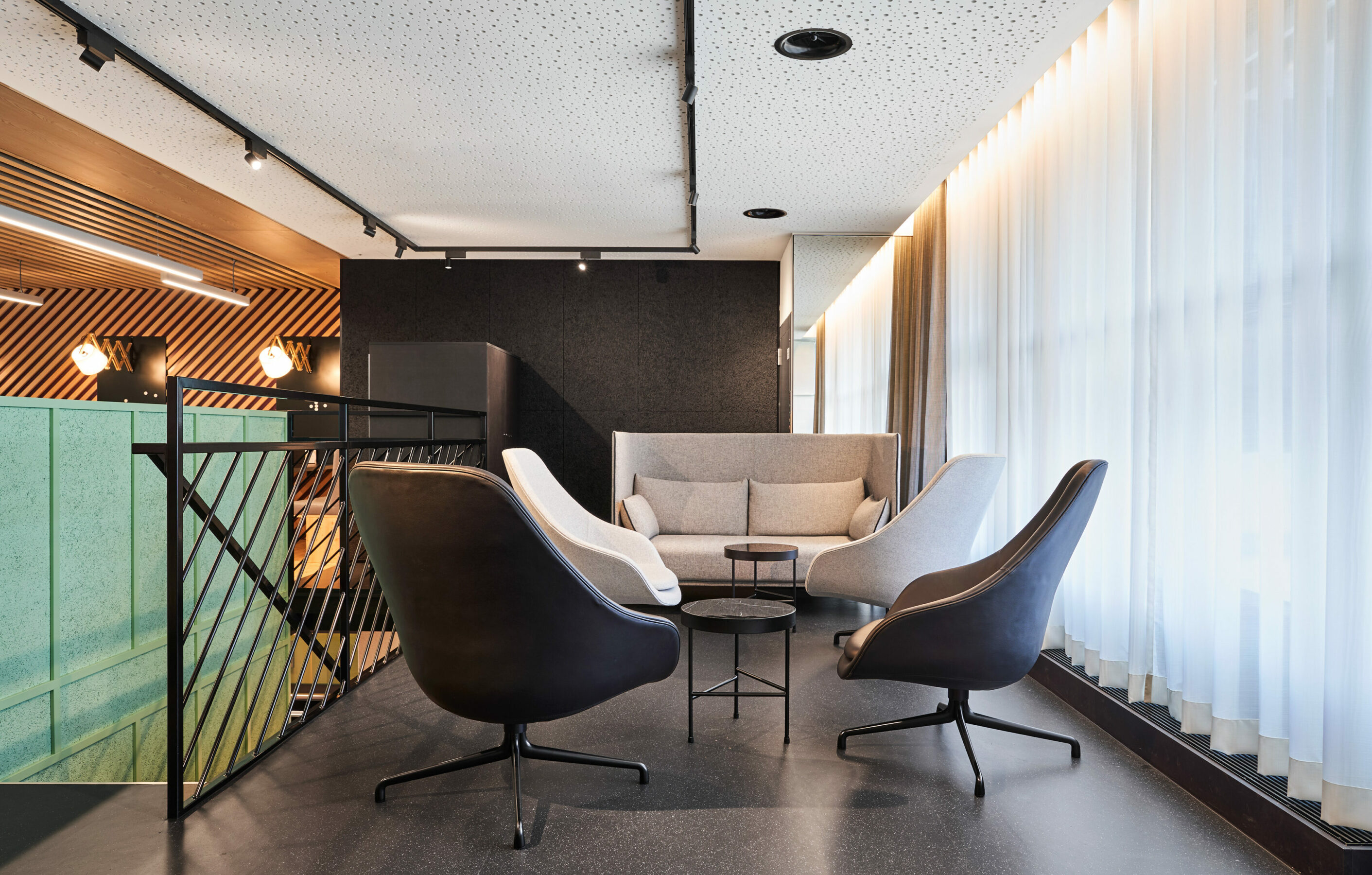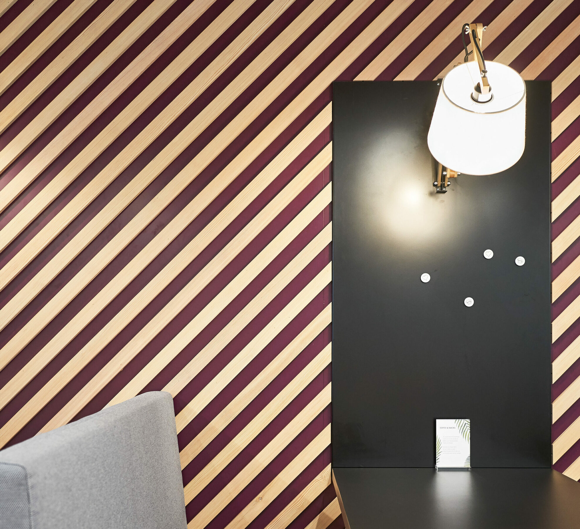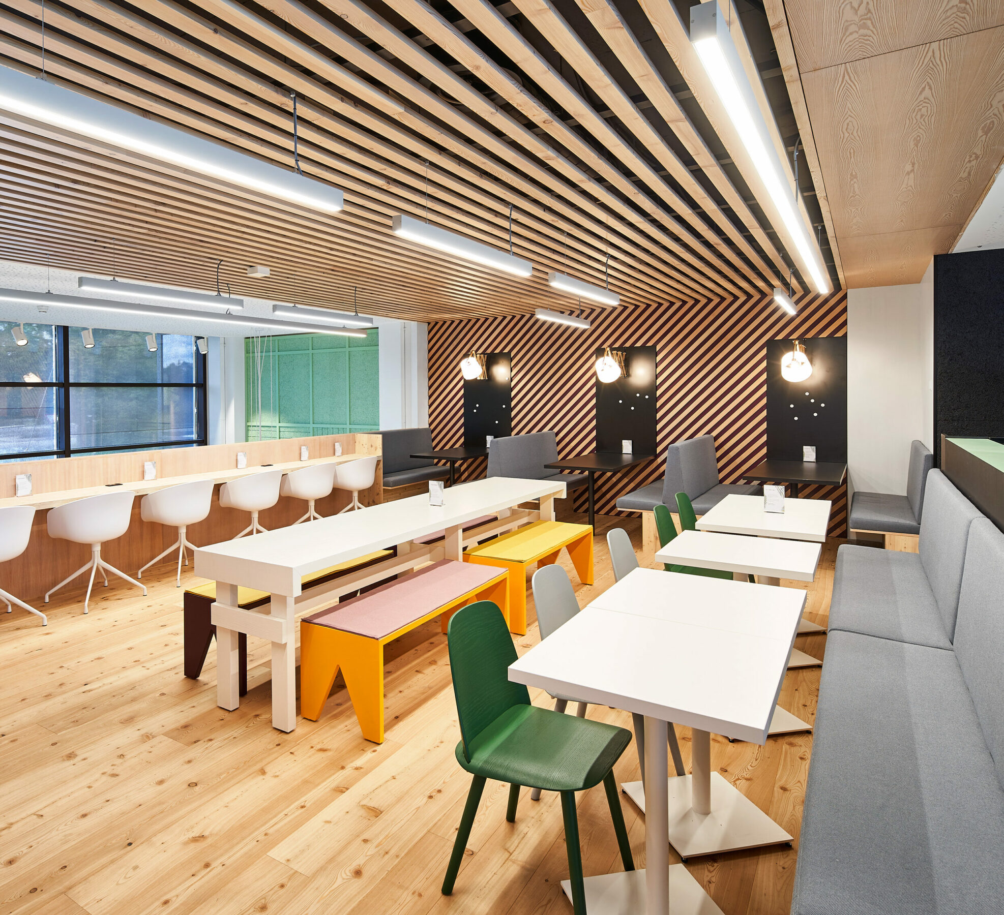 The space was there, especially since the almost 130 square meters large lobby was hardly used. Thereafter, the uninviting entrance area turned into a colorful meeting place for employees. The seven-person kitchen team pampers their colleagues with hot meals, bowls and fresh snacks. Coffee, tea and cold drinks are always available to the team.