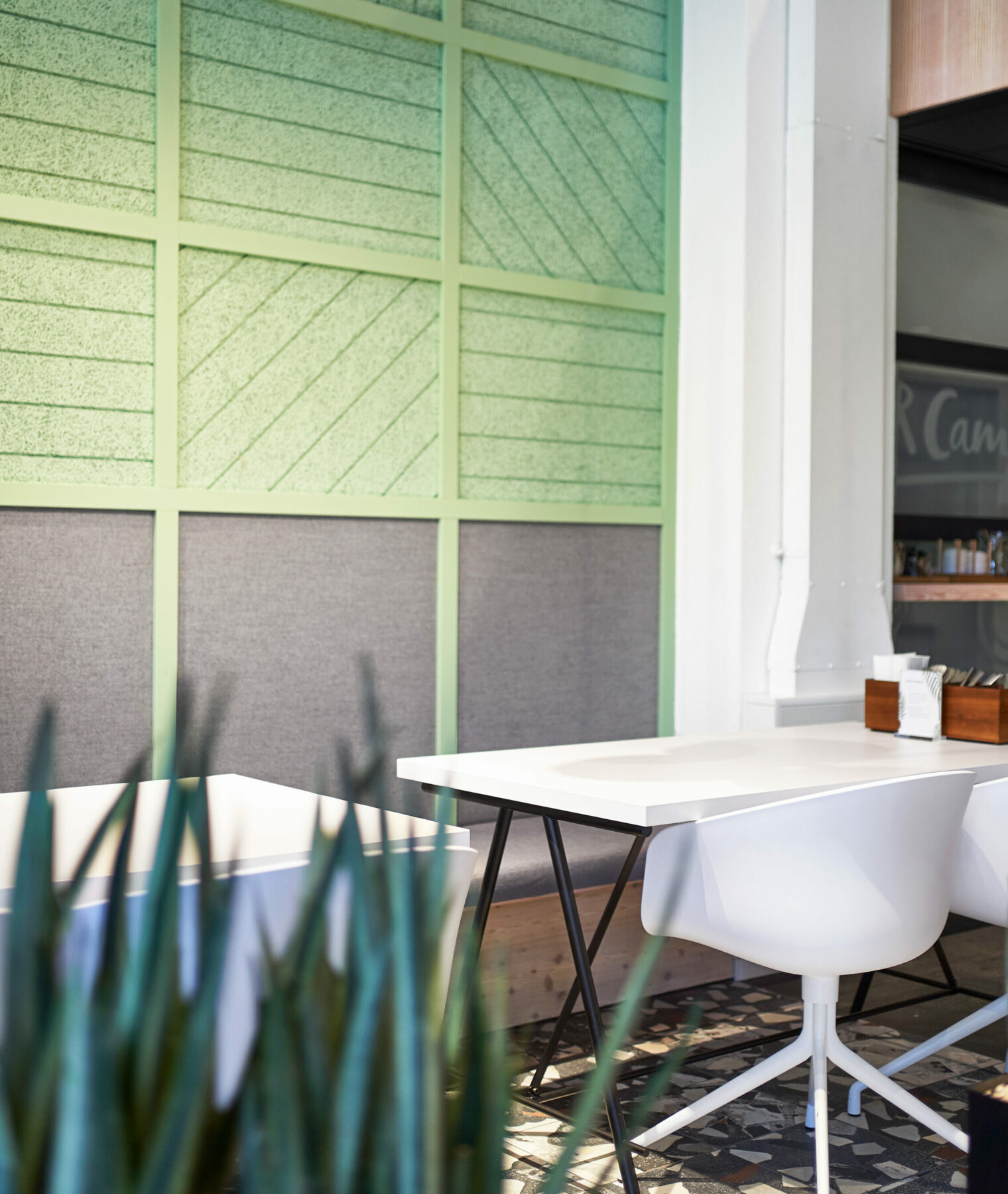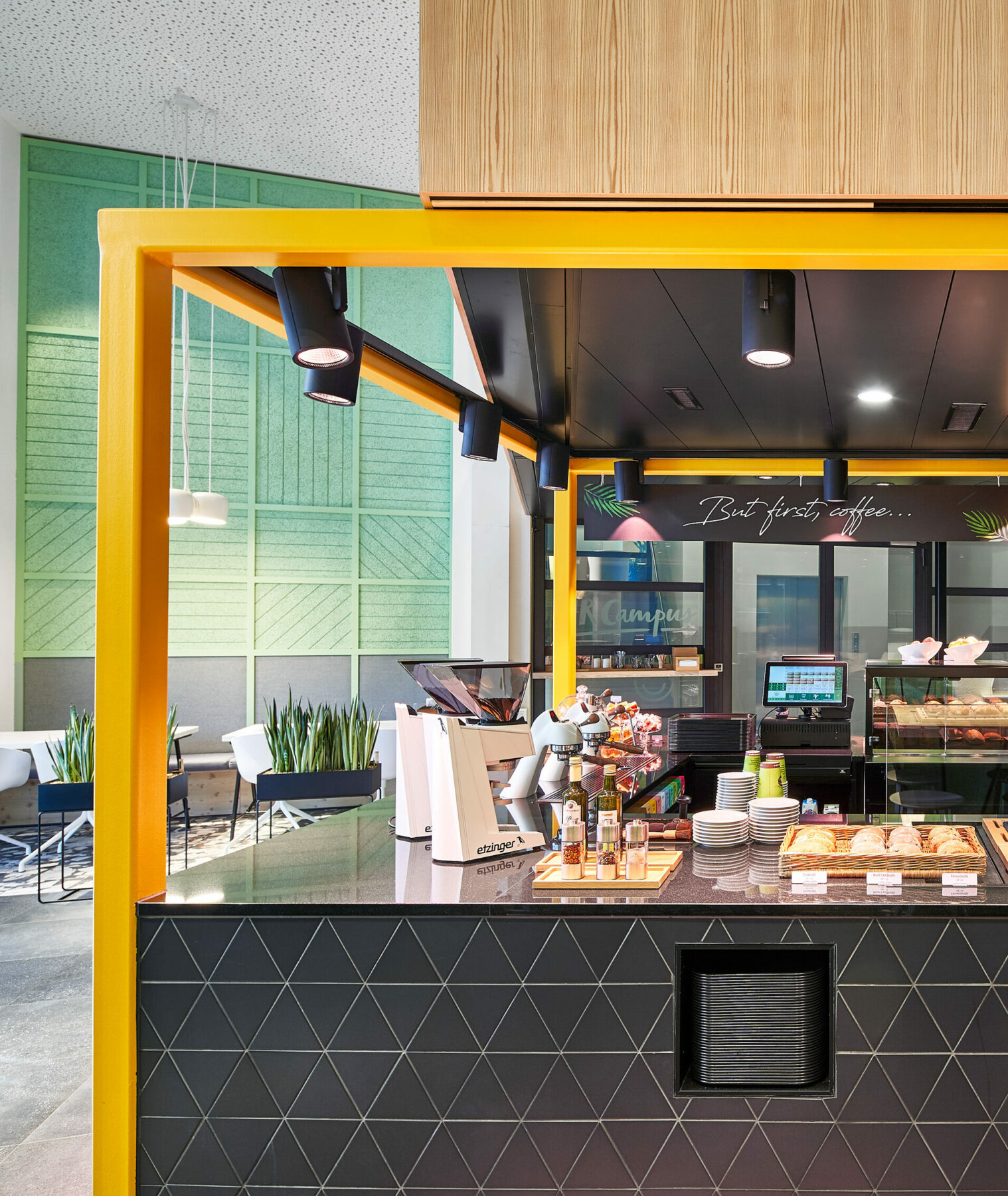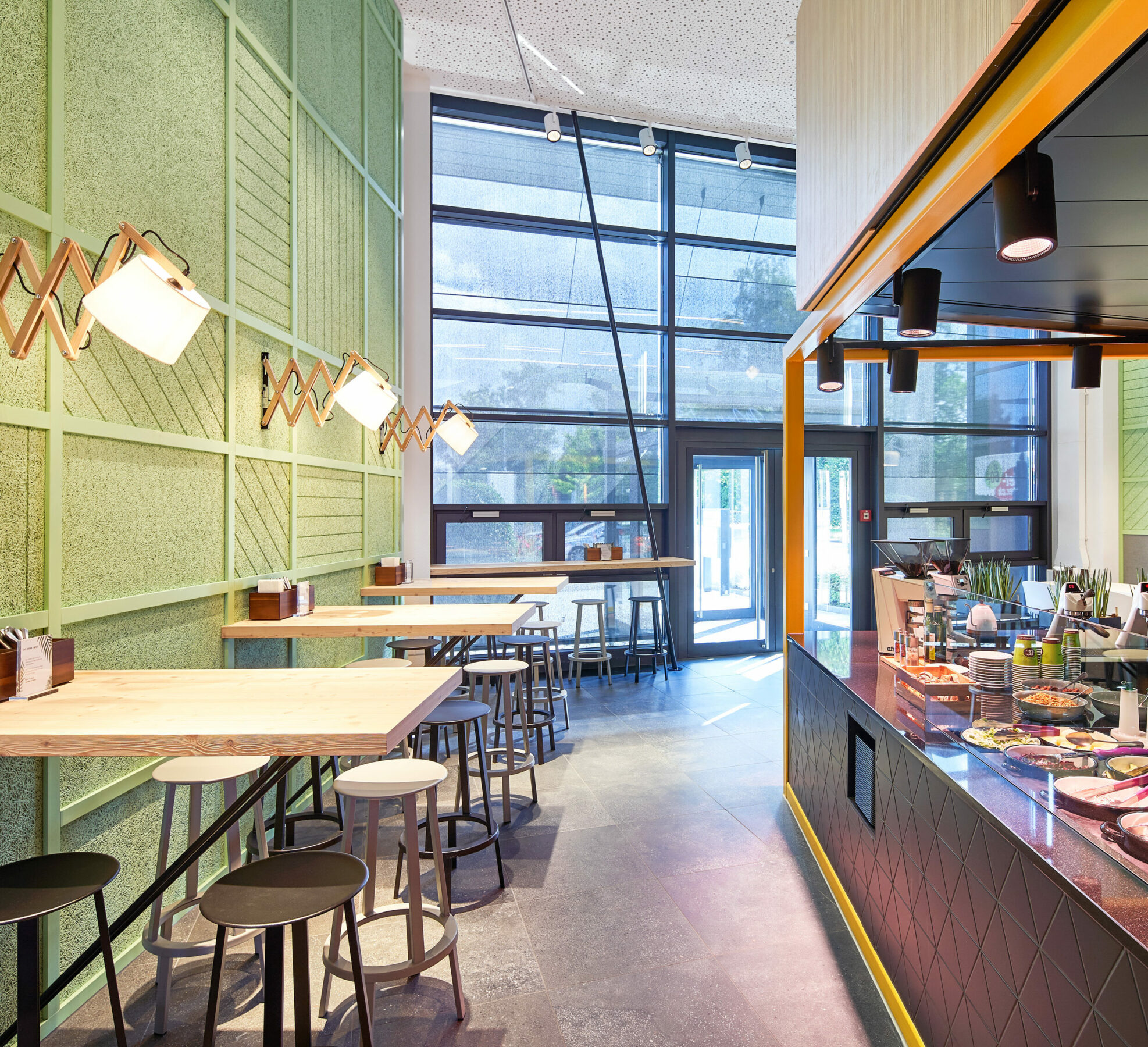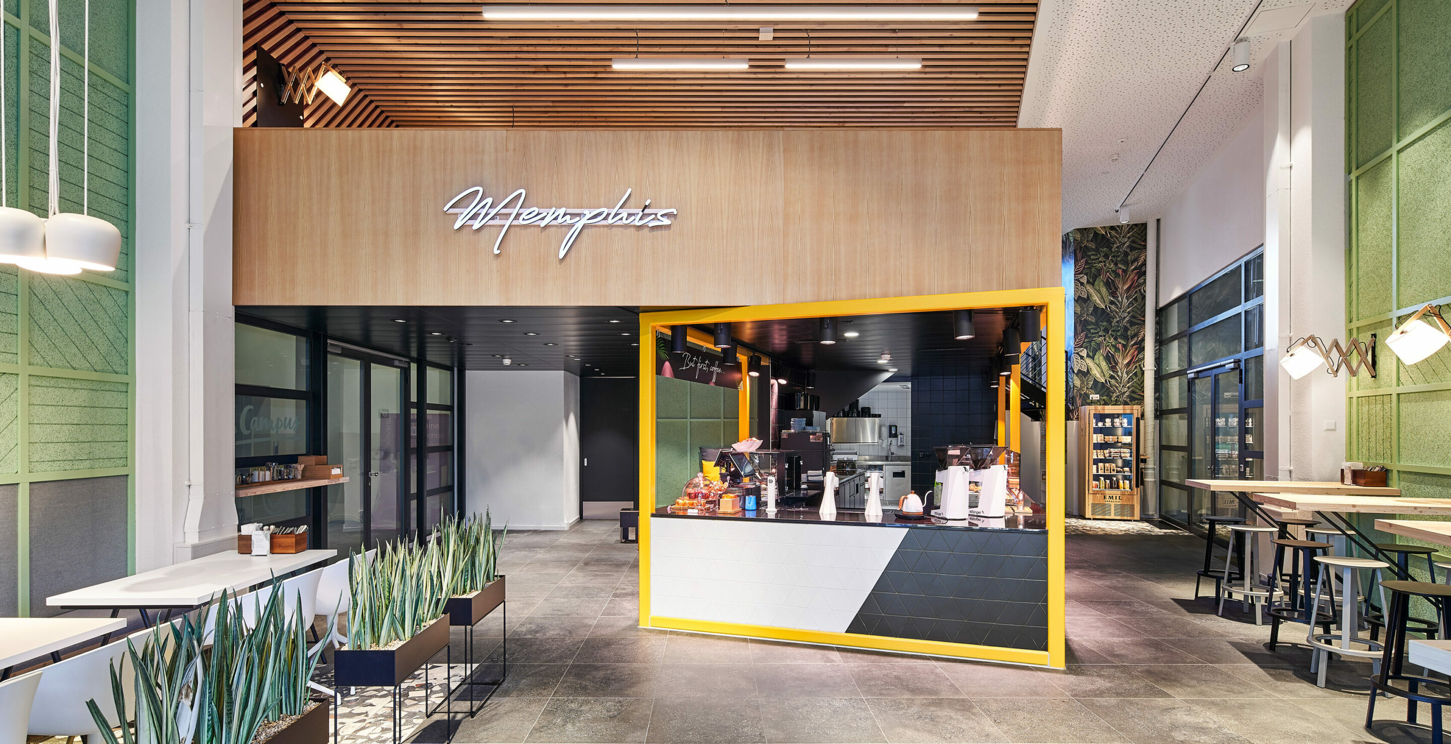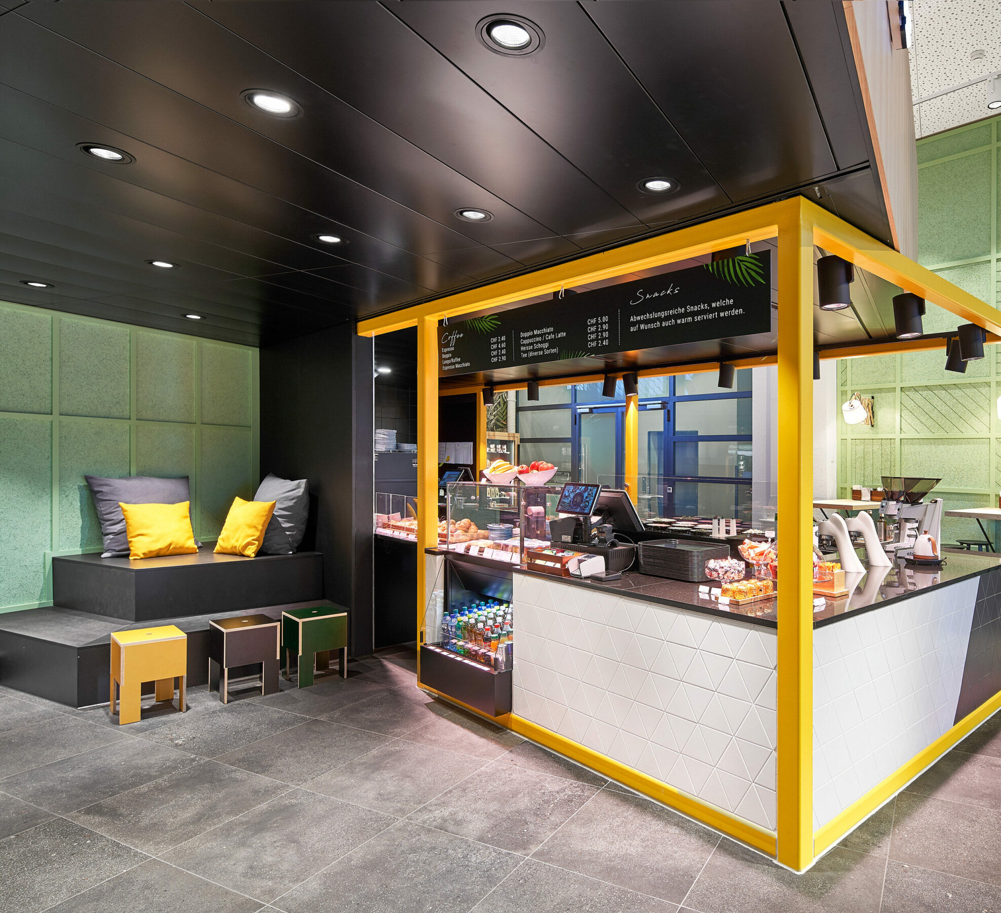 It is the bright colors that make “Memphis” – named after the home address of the SV Group in Memphispark, Dübendorf – so special: Rich yellow and friendly green is particularly eye-catching. Combining dark tones, matt grey and natural wood, to create a special atmosphere that rightly deserves the title “Brave Contrasts” and visibly showcases the quality standards of the catering company: freshness, regionality and healthy enjoyment.