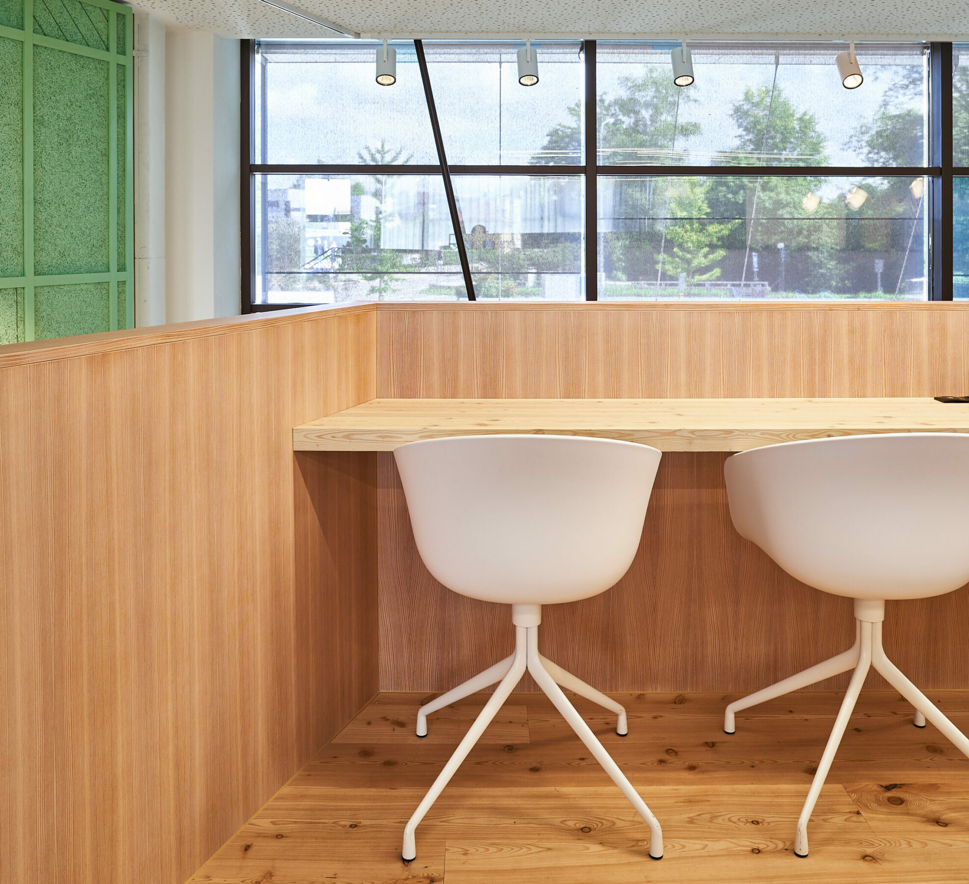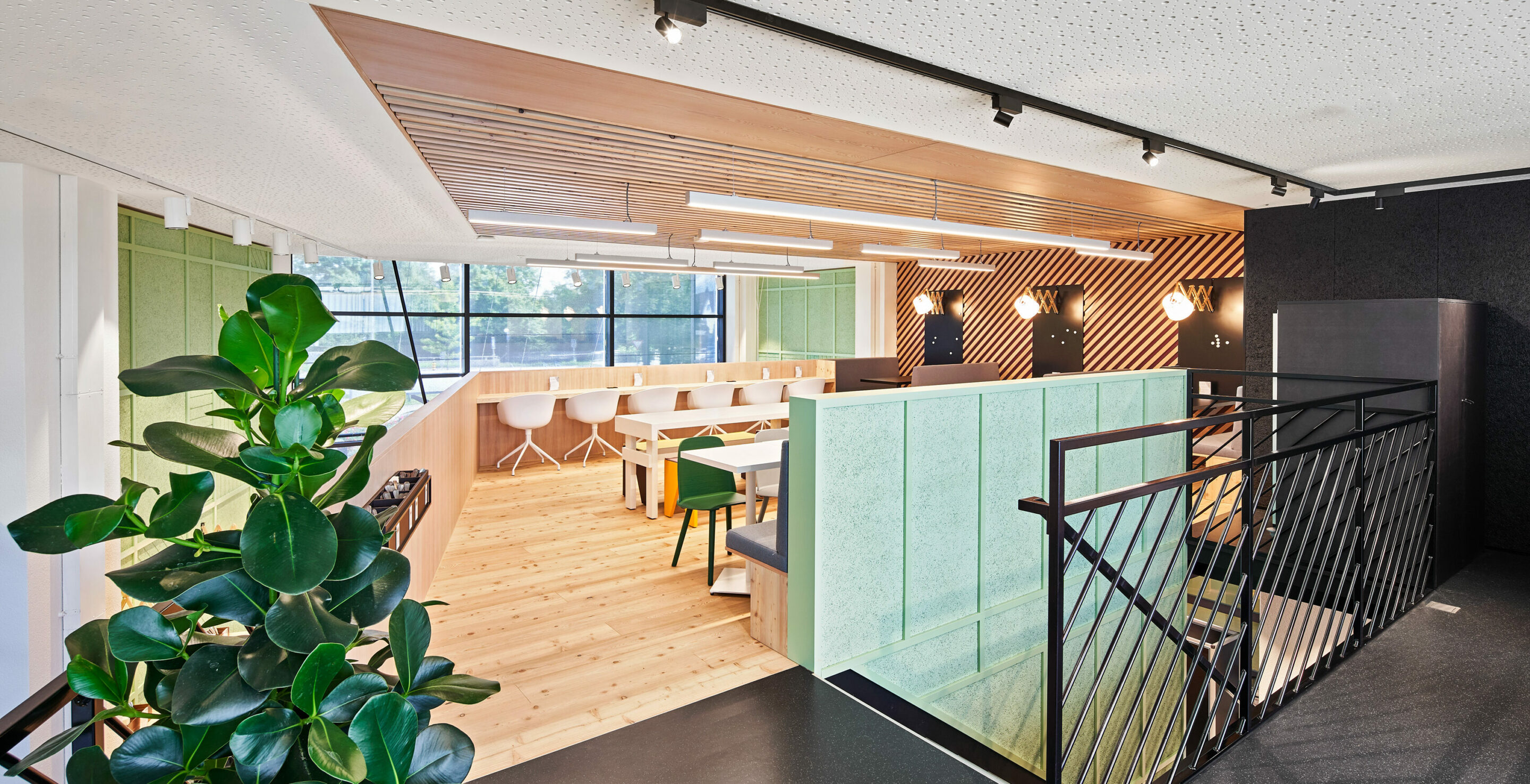 It is not only good to eat there and spend the breaks, but also to work. There, the central output station protrudes into a space-forming cube over five meters high inside the hall and offers on the second level a good 75 square meters.
