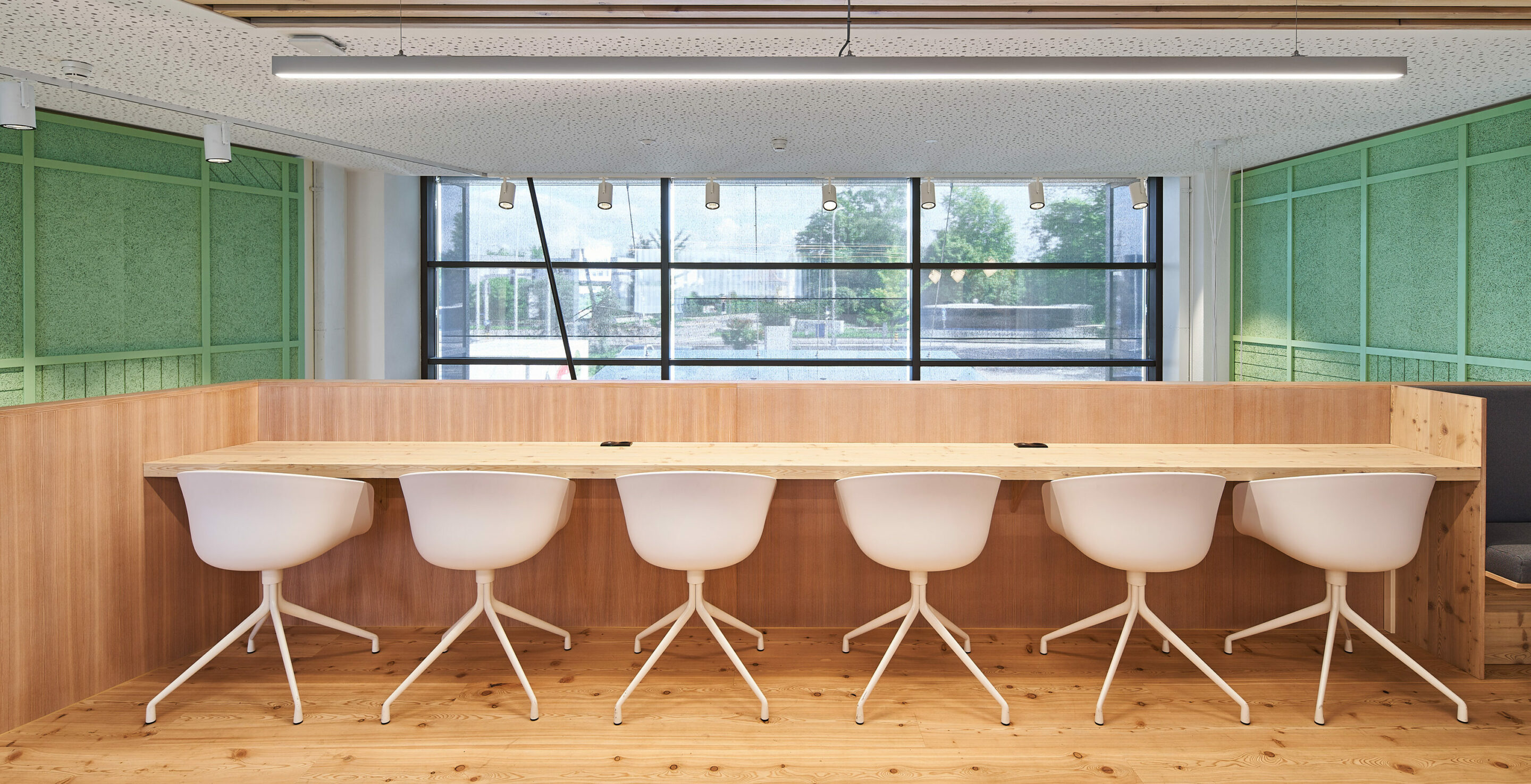 It is a technically fully equipped co-working area with large work tables, seating groups and niches.