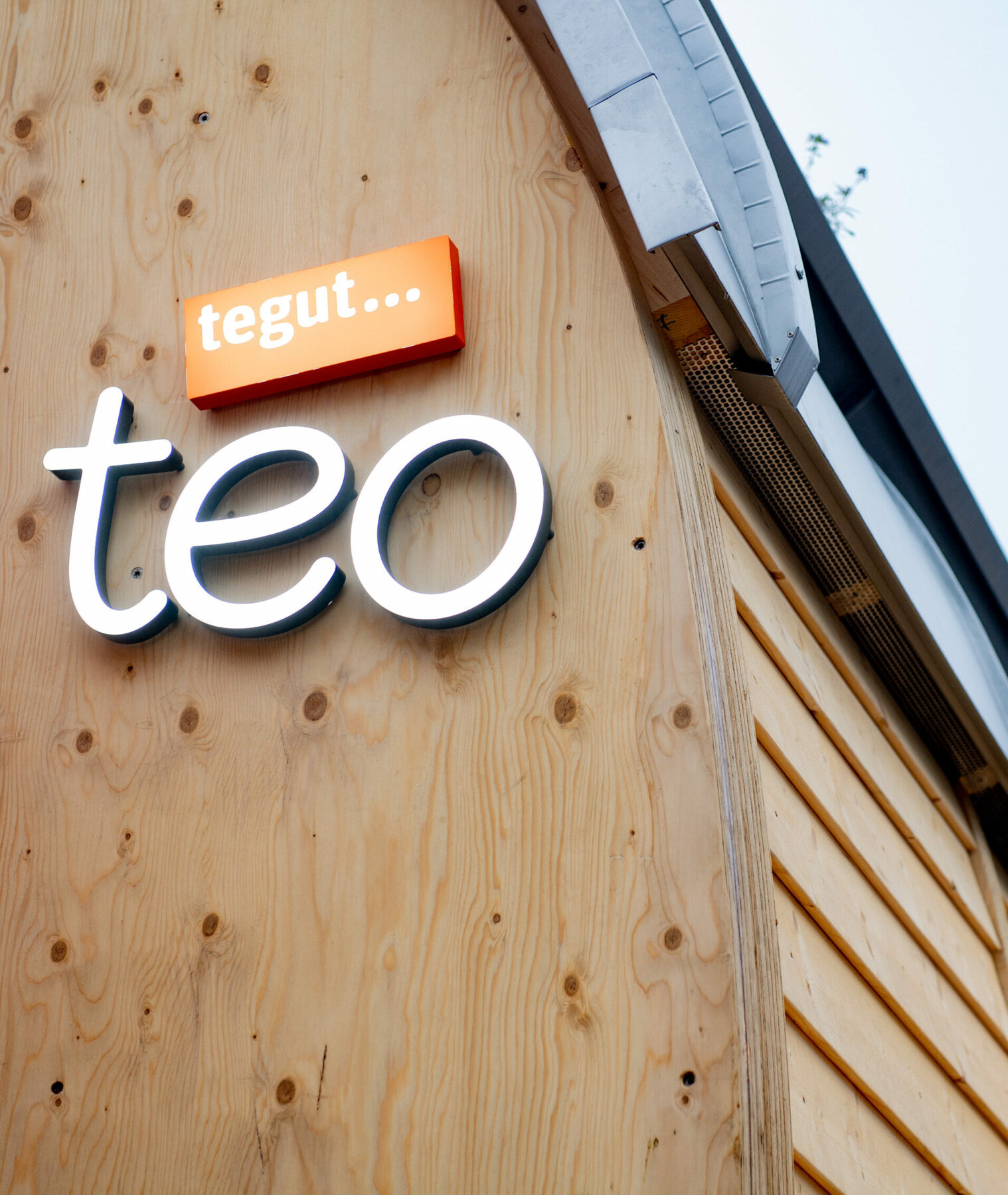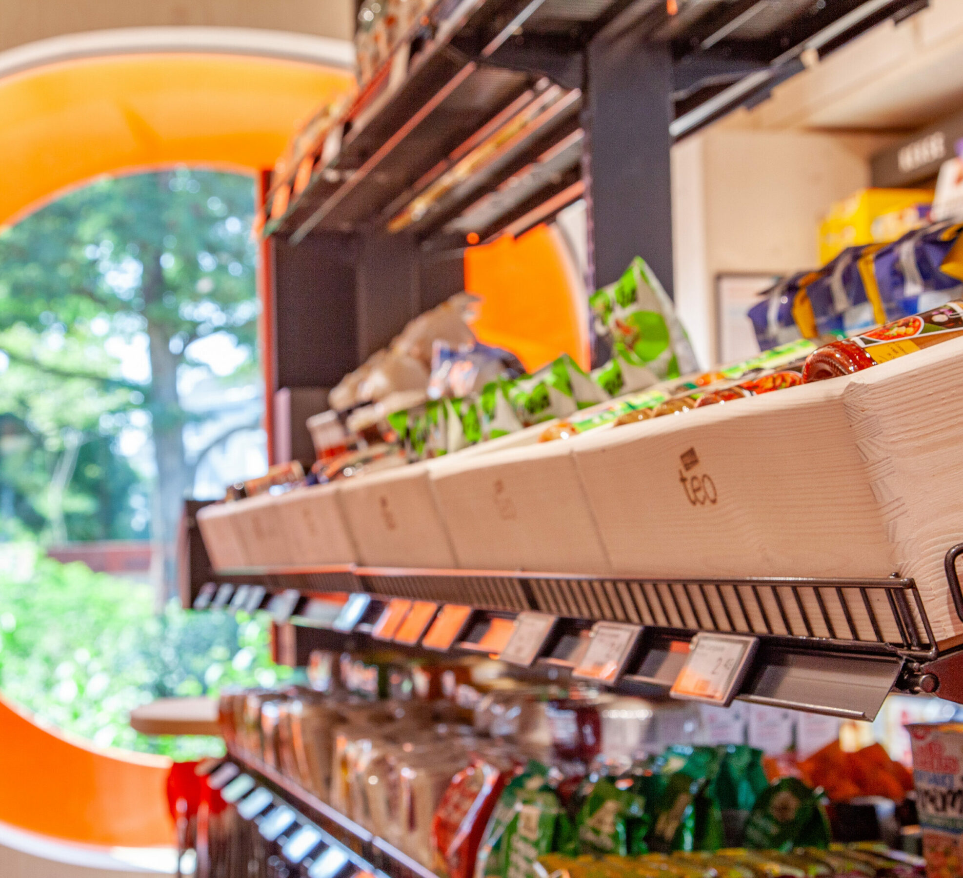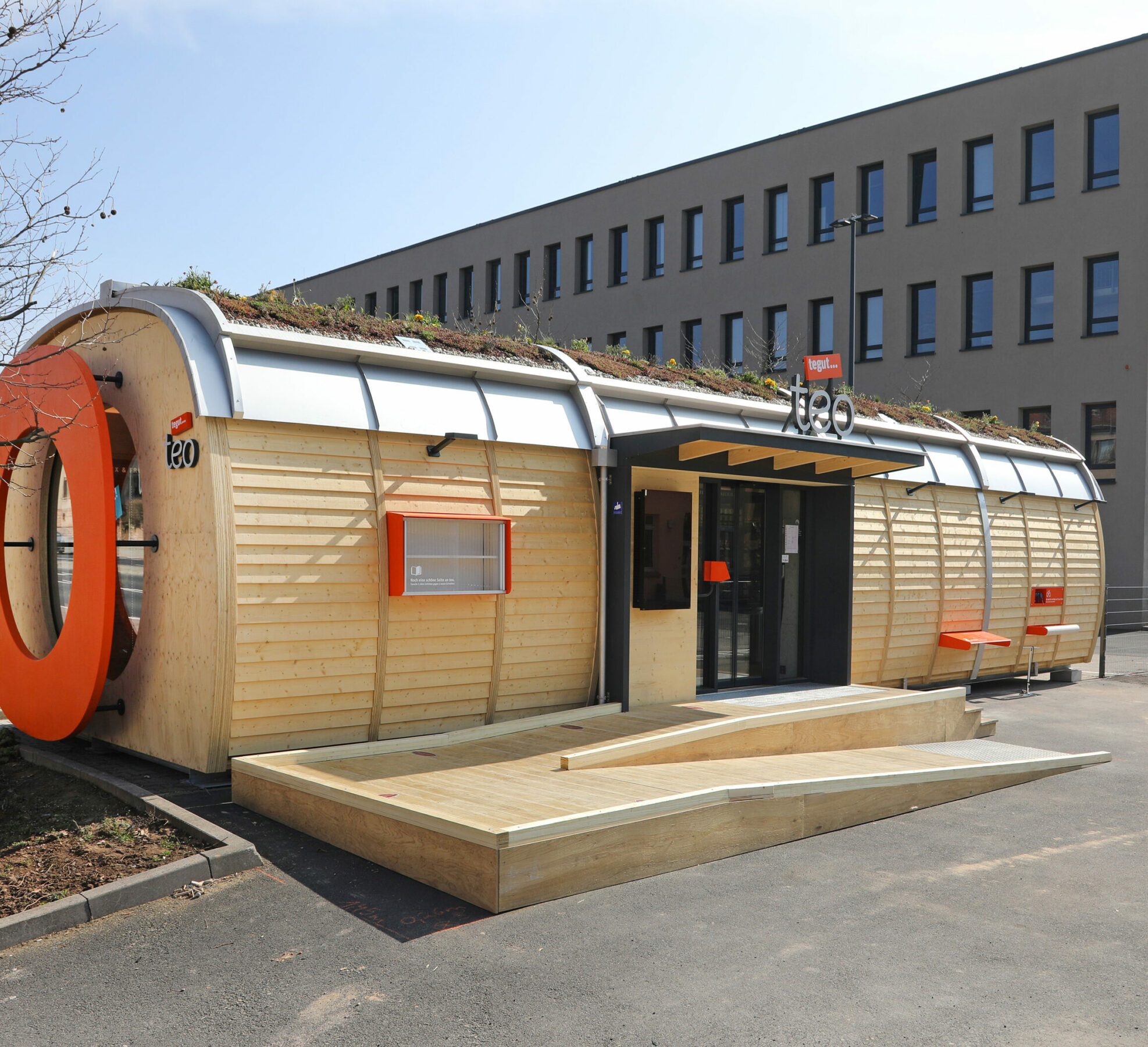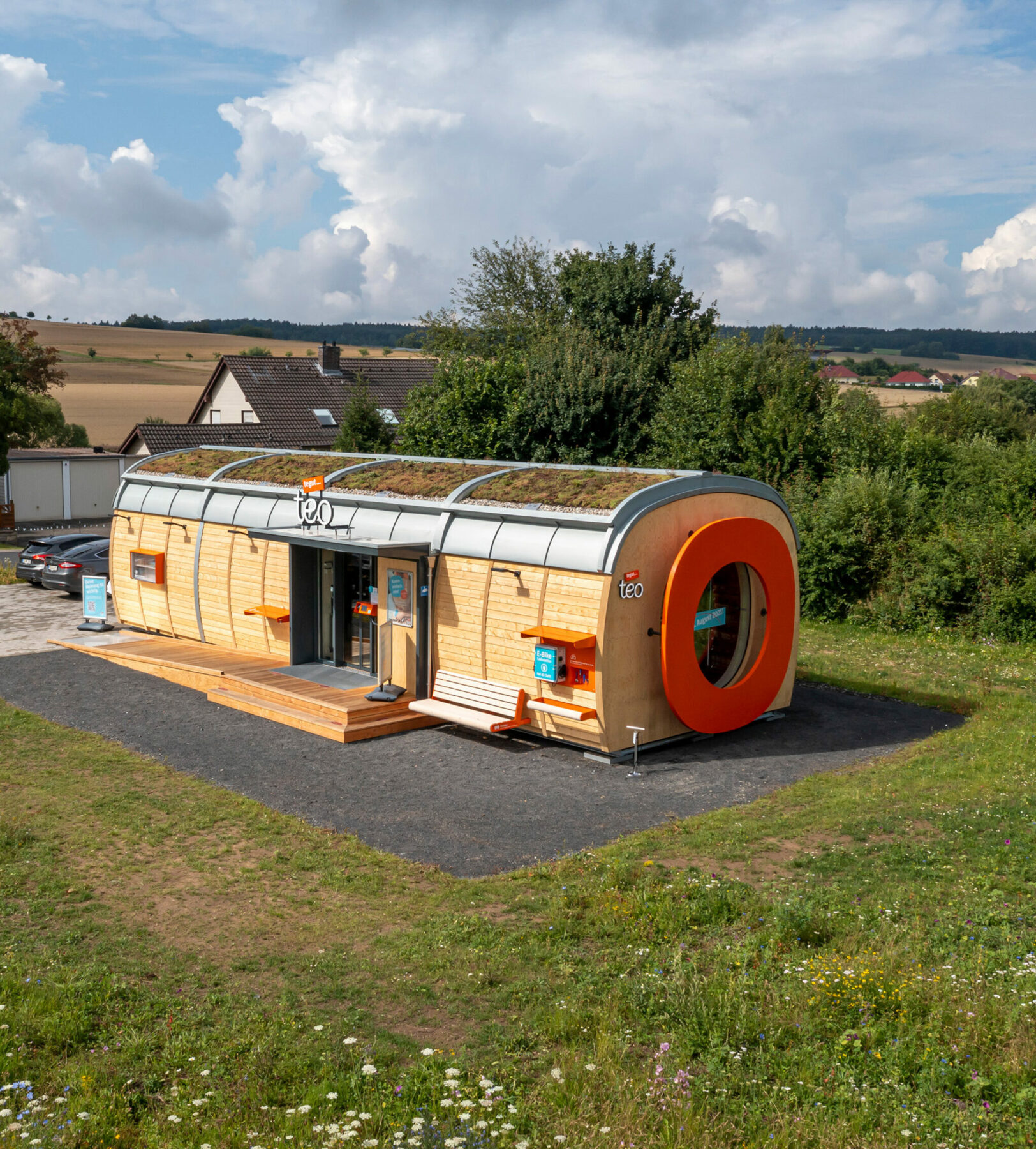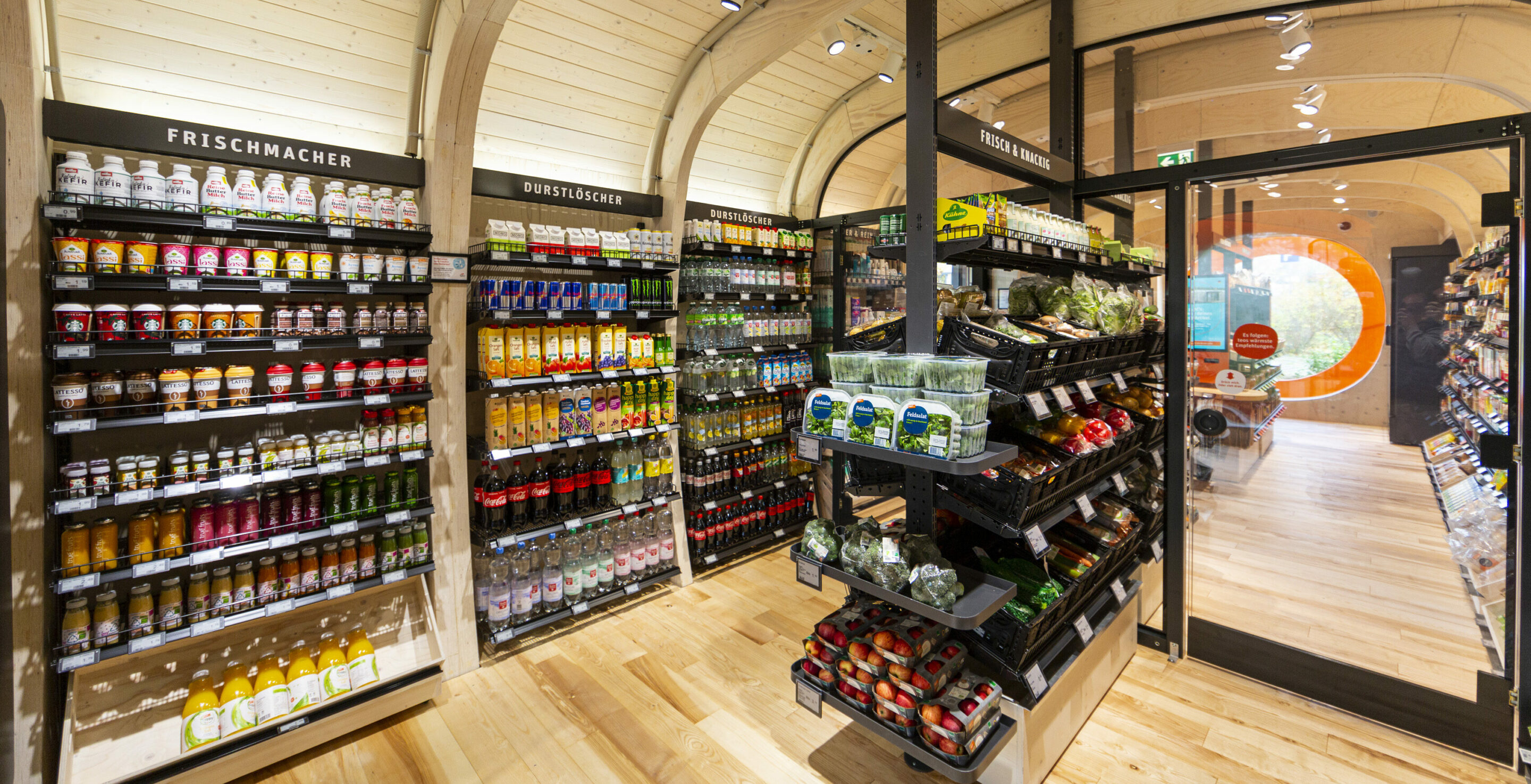 The provision as a whole describes the main feature of our teos – the unique construction. This is the result of a cooperation between two absolute specialists: Holzbau Kiefer and KNOBLAUCH. Together they succeed in implementing the plans of tegut… and the design agency design for human nature in such a way that the complete compact supermarket can be completely assembled and securely packed and loaded directly for transport.