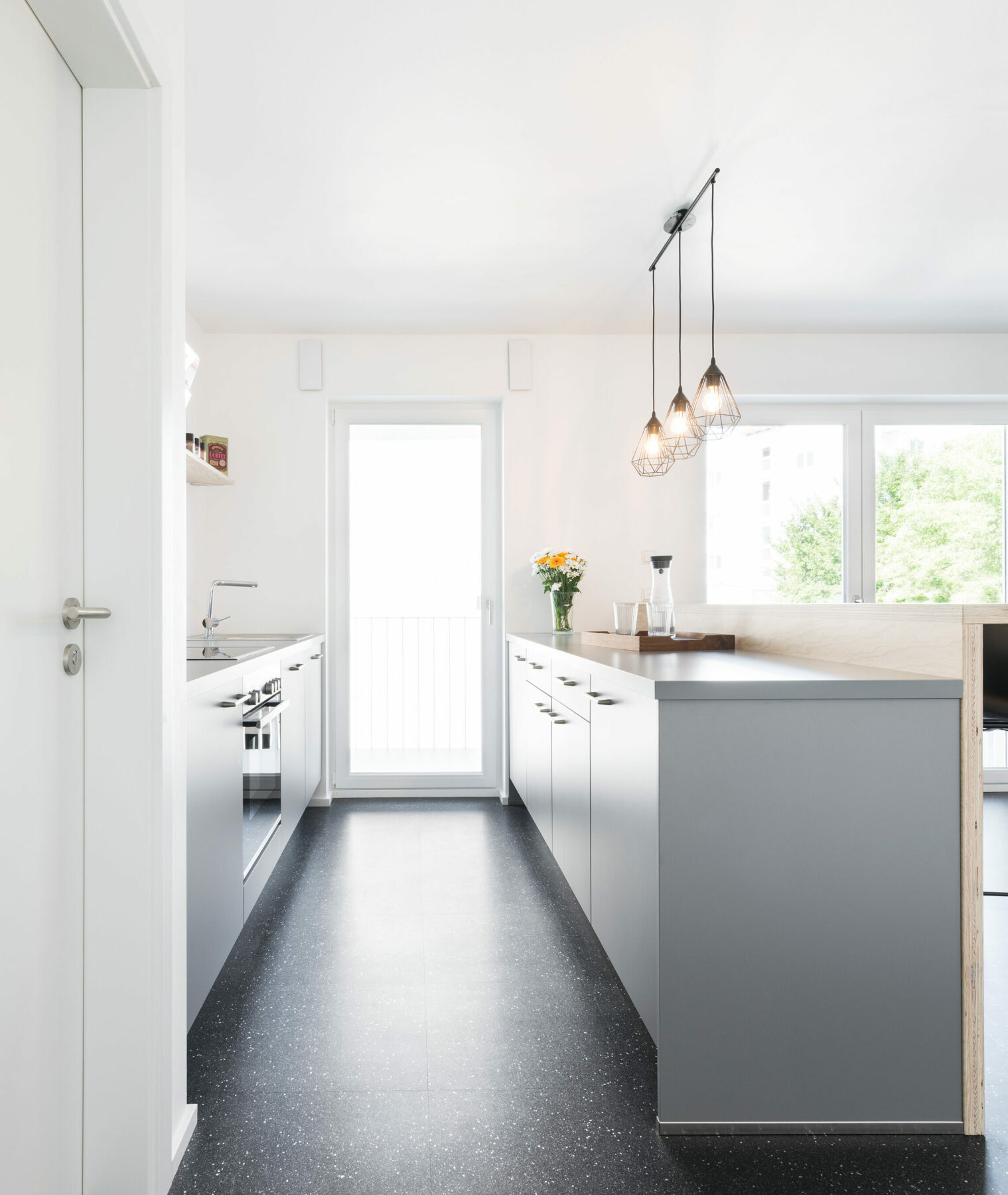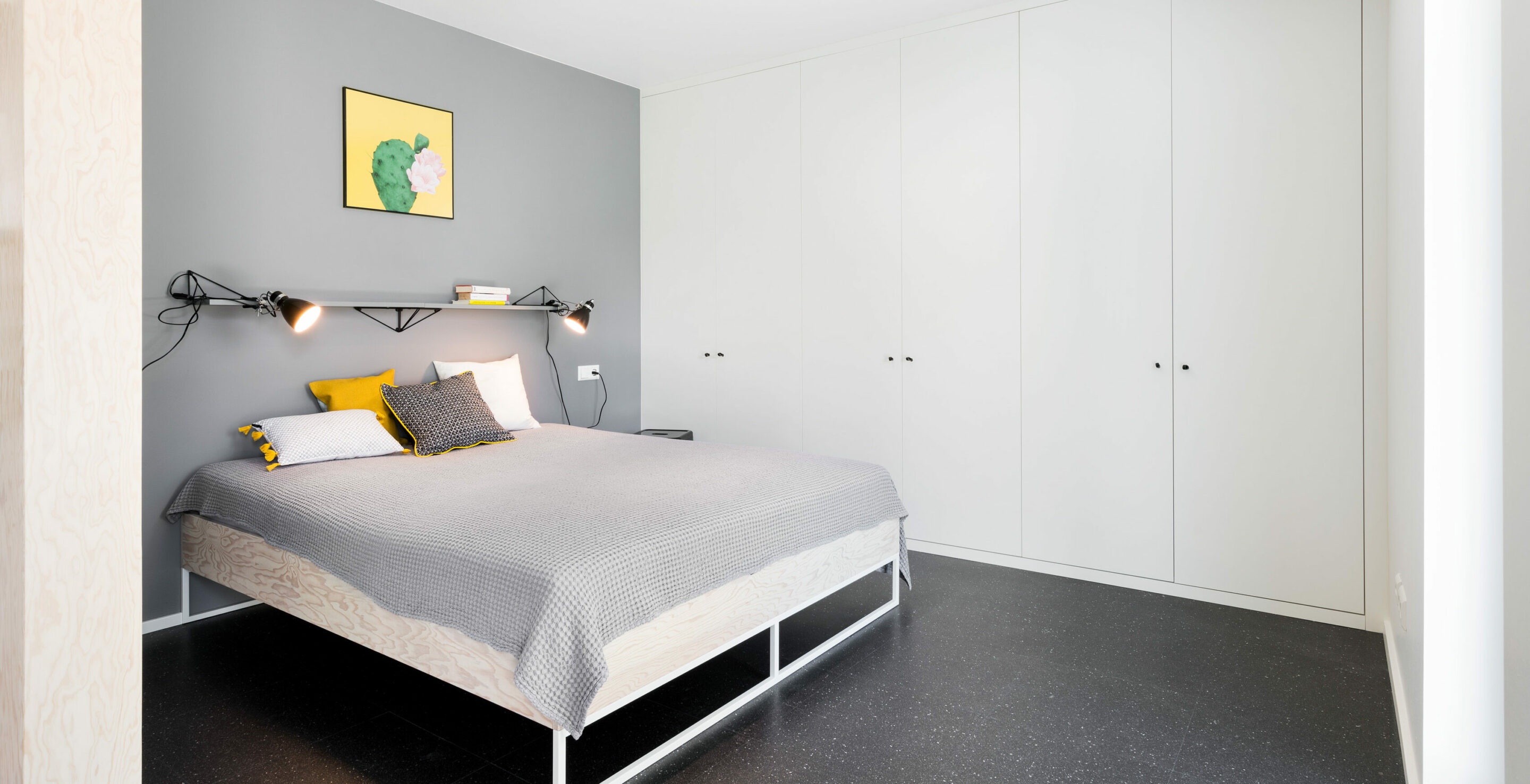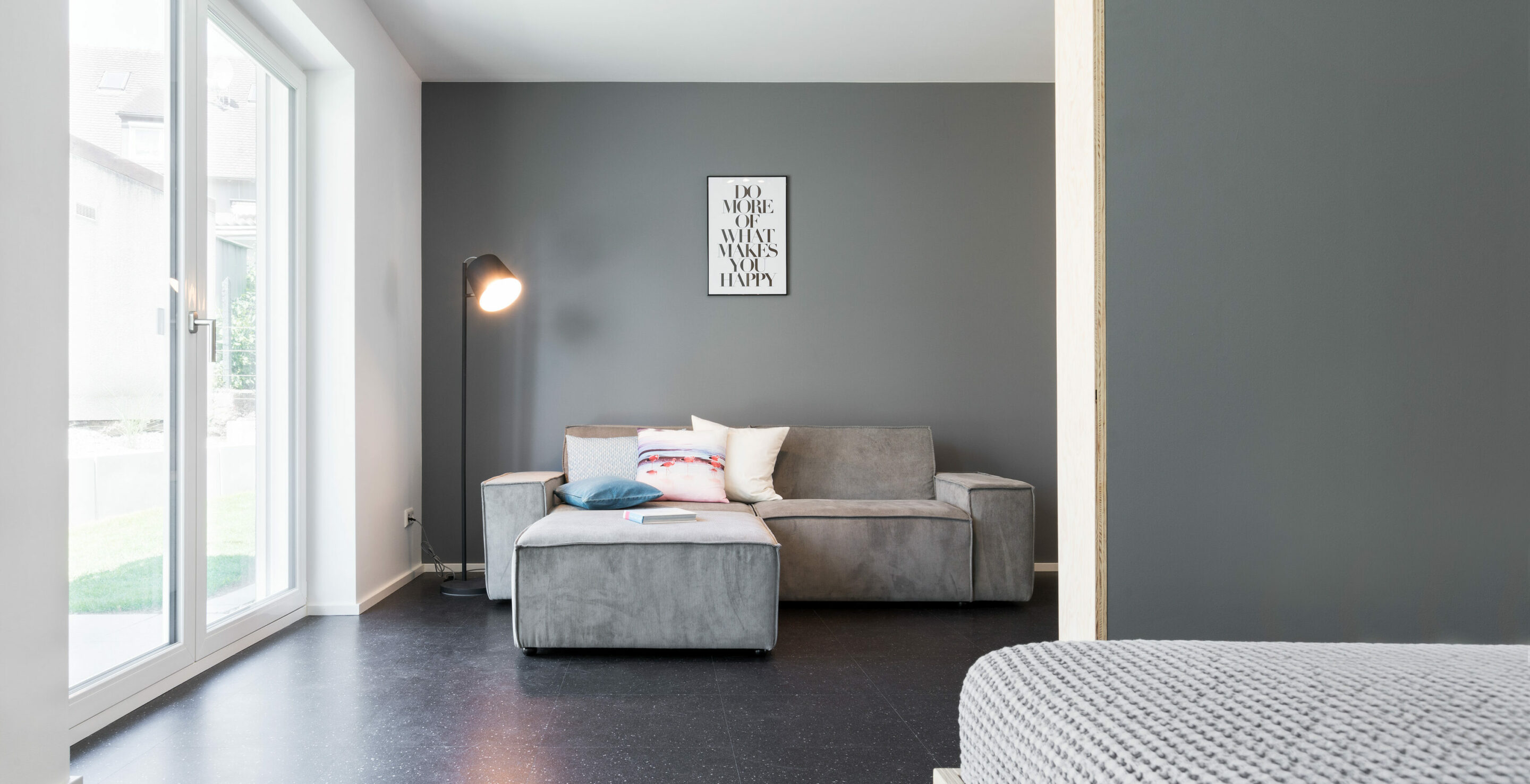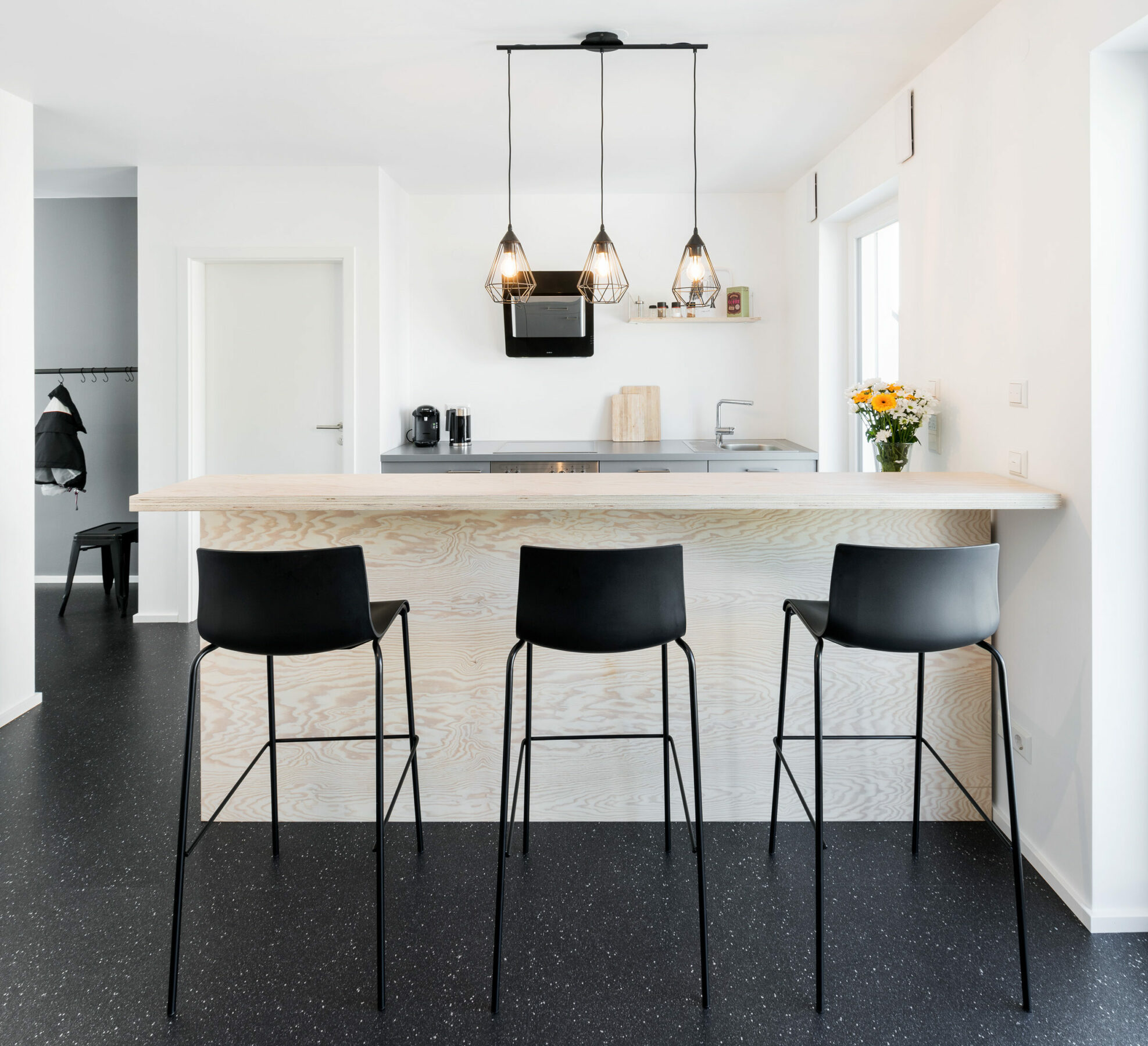 Die Schlichtheit zieht sich auch durch das Innenraumkonzept. Das Grau Fassade wurde bei den Einbaumöbeln wieder aufgenommen. Dazu liefern die Seekieferplatten einen wohnlichen Charakter. Die Möbel*, die wir ausgesucht und über unseren eigenen Laden abgewickelt haben, passen sich harmonisch ins Interieur ein. Mit Farben und Deko bewusst sparsam umgegangen, schließlich sollen unterschiedliche Personen sich hier über einen längeren Zeitraum wohlfühlen.