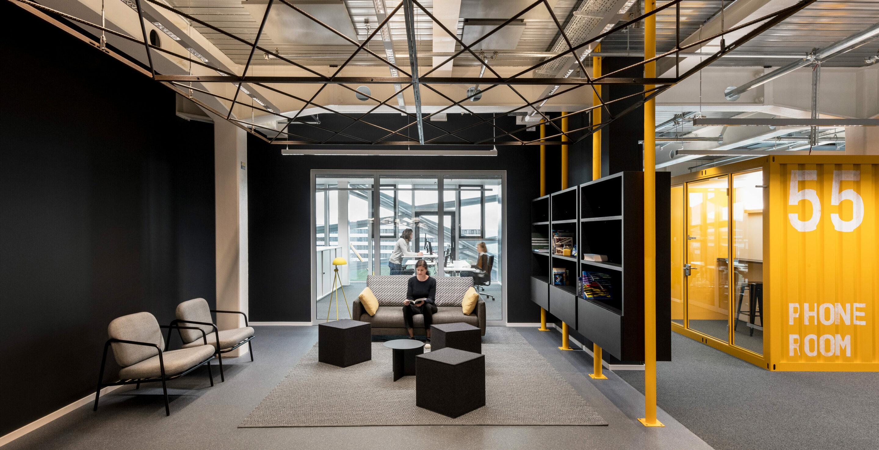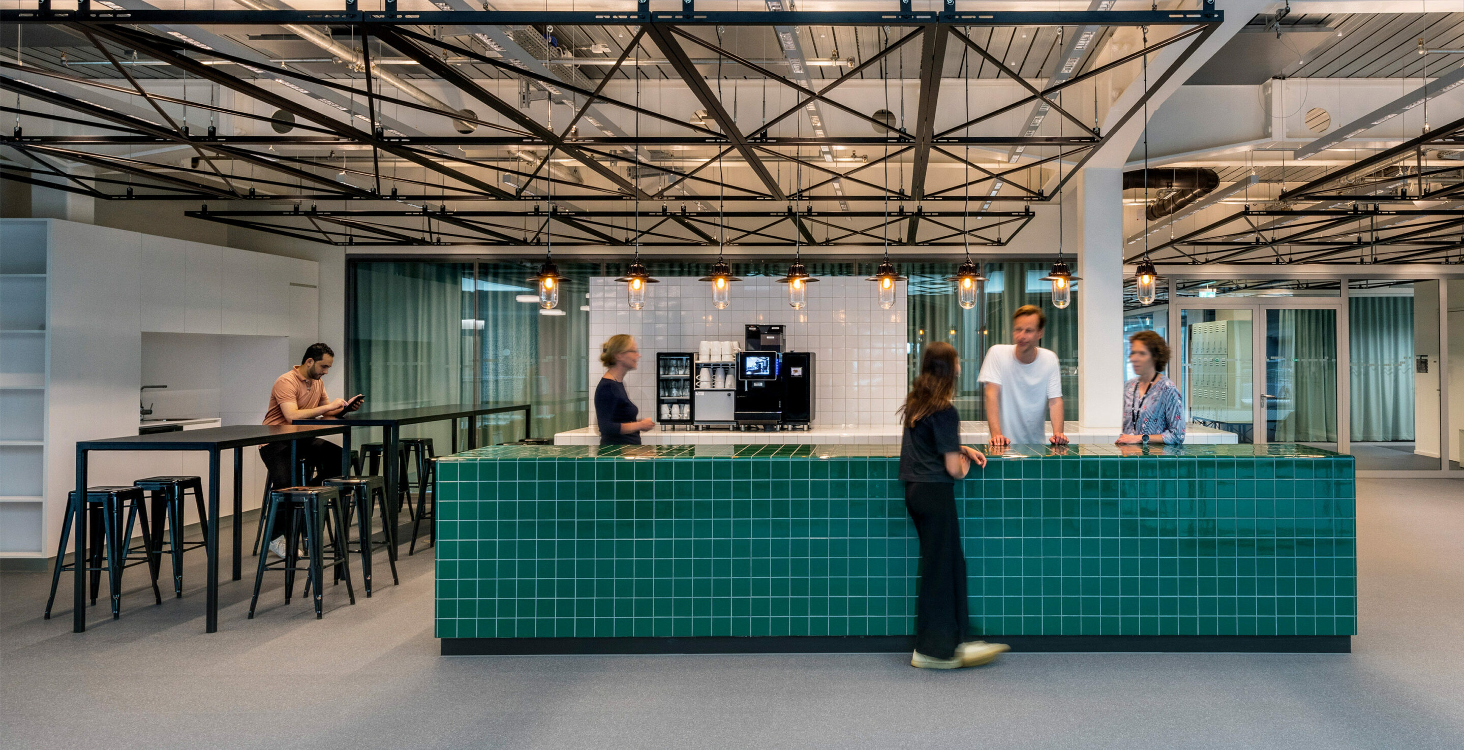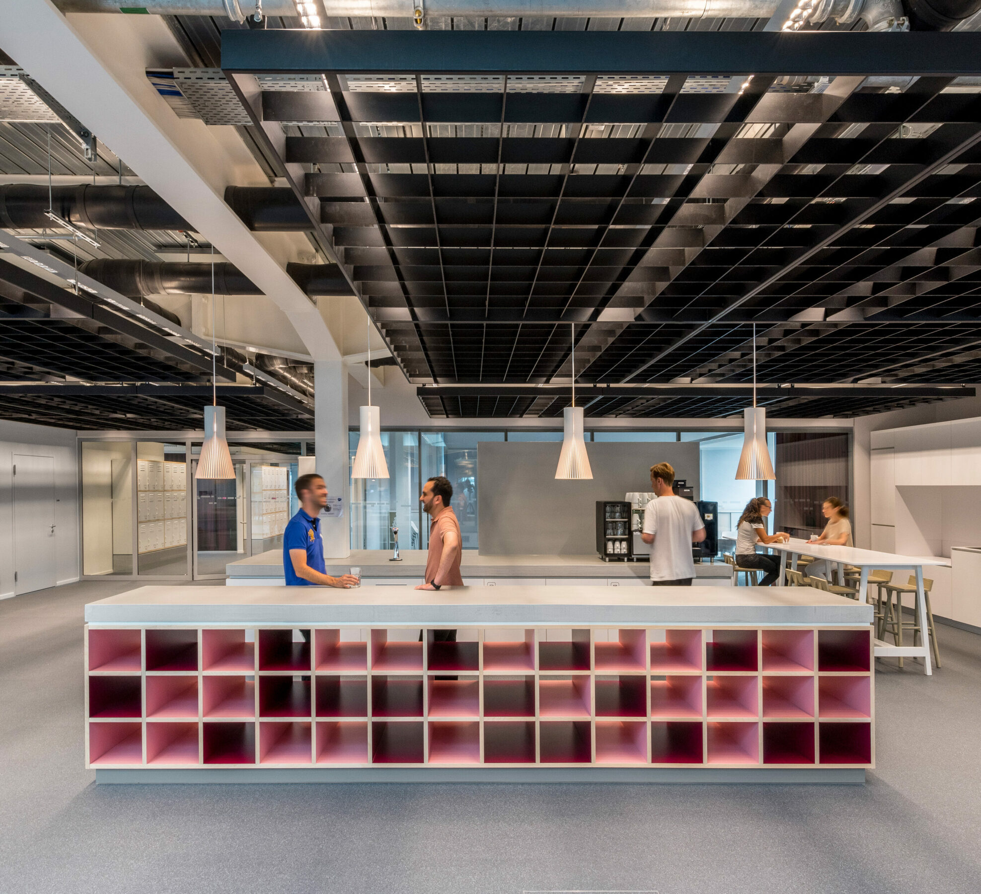 Die Zugänge zu den Arbeitsbereichen sind allesamt ausgestattet mit Kaffeeküchen und Spindwänden mit in Summe über 3.000 Schließfächern. Ergänzt wird das Gestaltungskonzept durch Trennwände, die wie Wohnwände ausgebildet sind und mit den dazugehörigen Sitzgruppen der Bürofläche eine hohe Aufenthaltsqualität verleihen.
