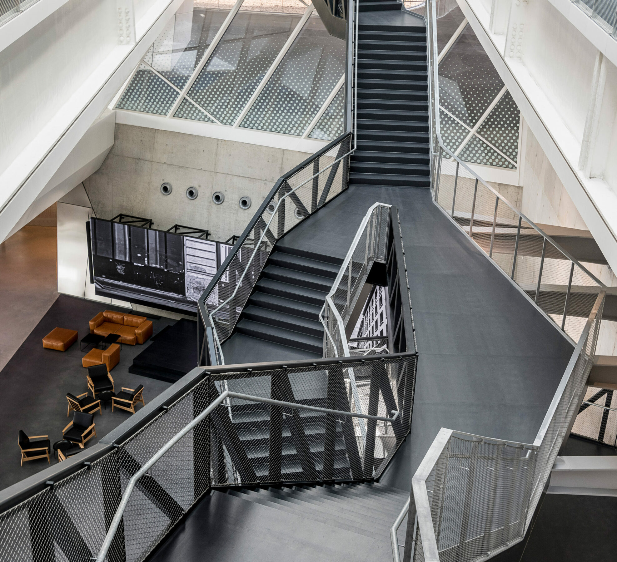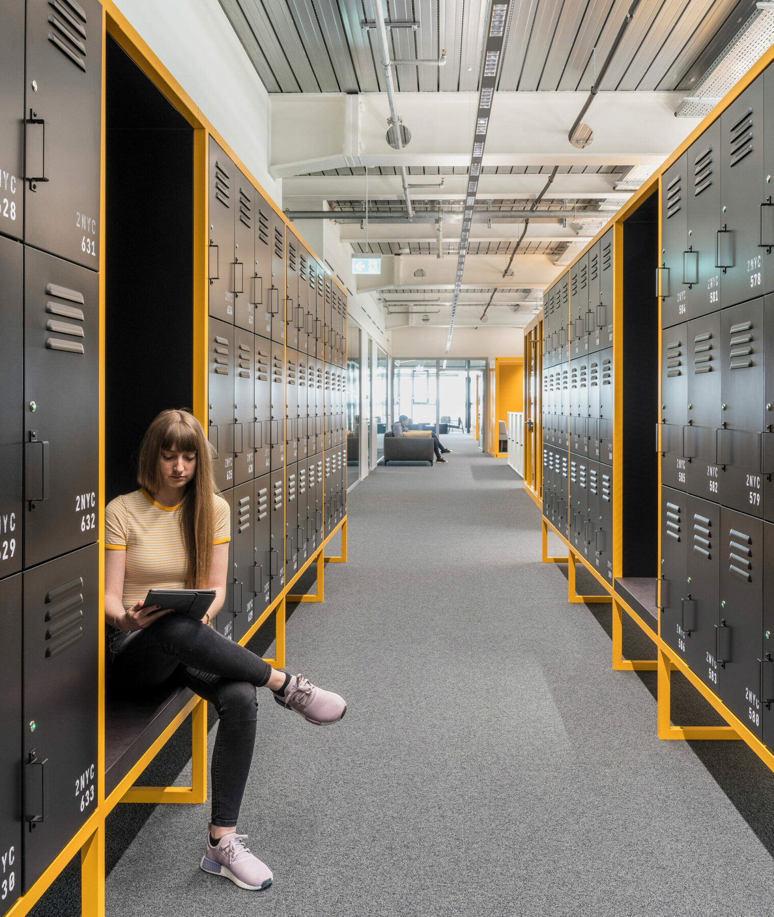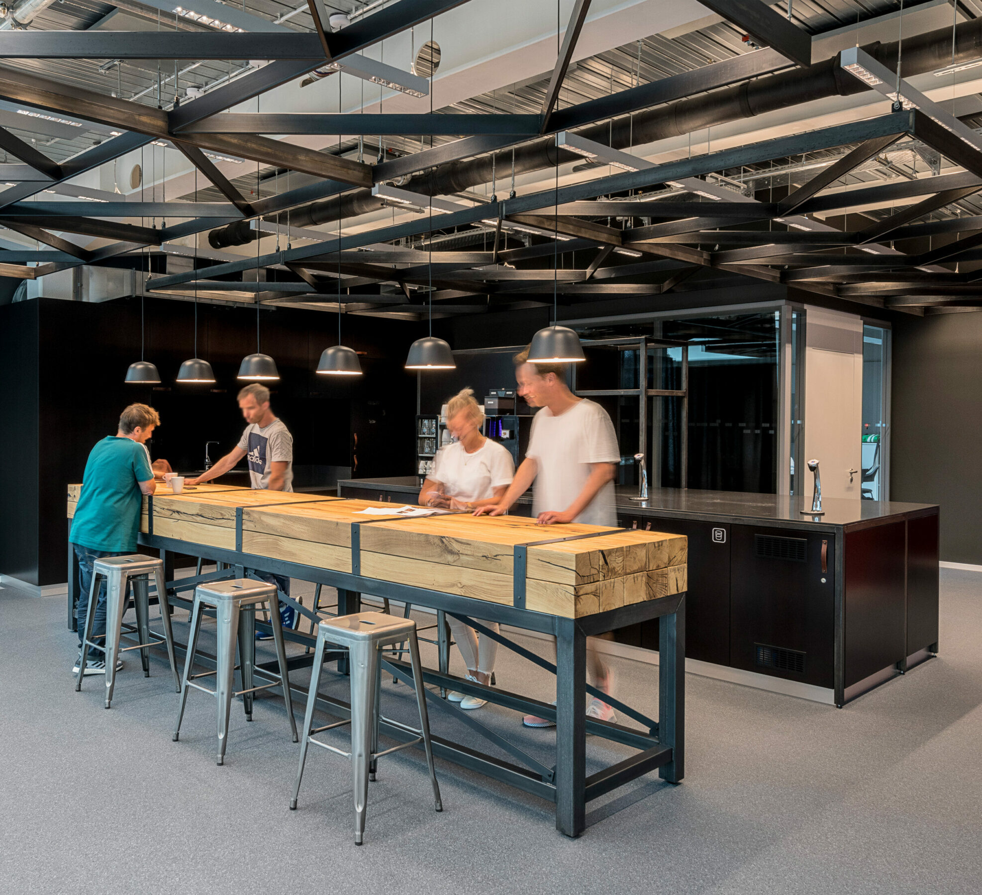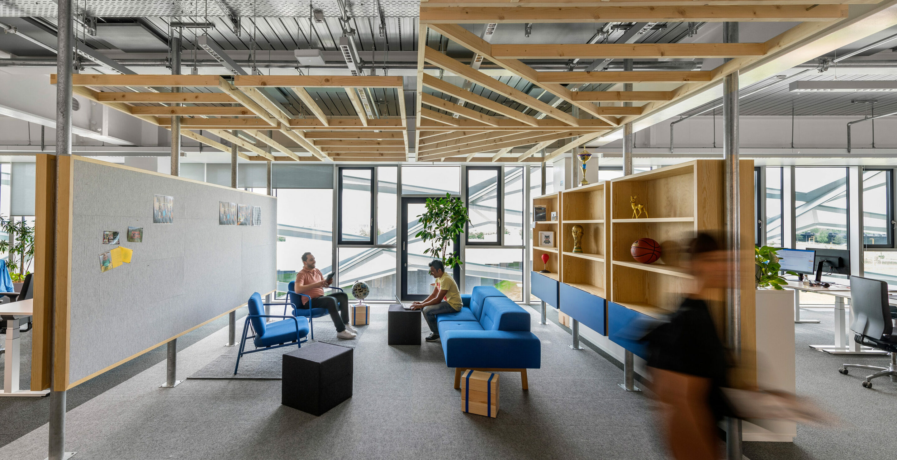 Die Zugänge zu den Arbeitsbereichen sind allesamt ausgestattet mit Kaffeeküchen und Spindwänden mit in Summe über 3.000 Schließfächern. Ergänzt wird das Gestaltungskonzept durch Trennwände, die wie Wohnwände ausgebildet sind und mit den dazugehörigen Sitzgruppen der Bürofläche eine hohe Aufenthaltsqualität verleihen.