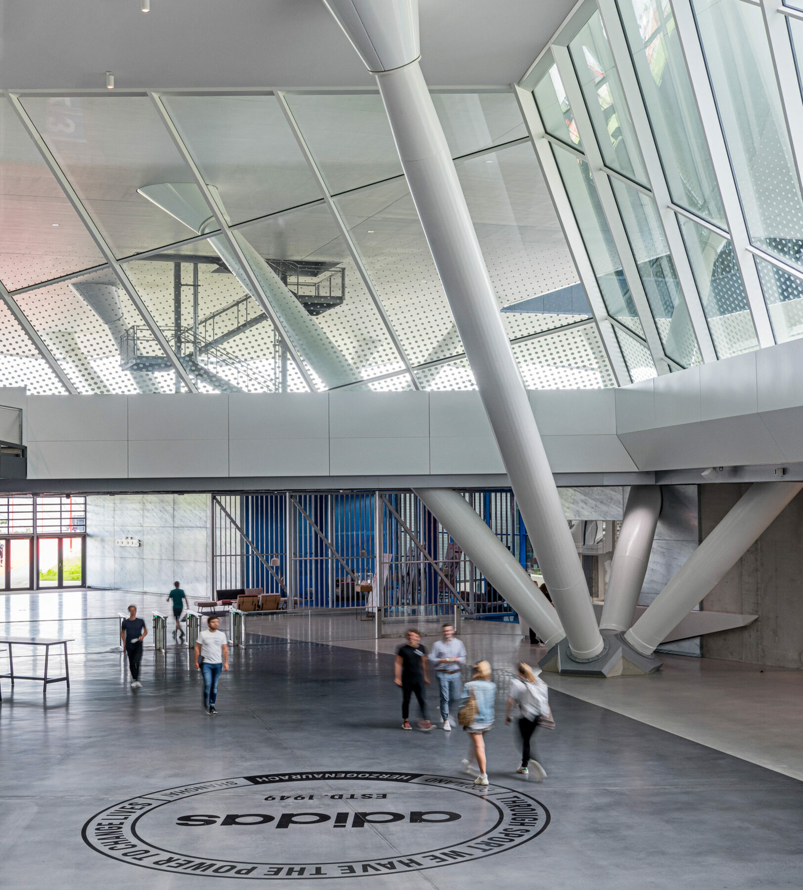 Paris, New York, London, Tokyo, Los Angeles, Shanghai. Diese sechs Metropolen der Welt sind in Mittelfranken vereint auf 30.000 Quadratmetern und verpackt in die neue Büro-Arena. Wir aus der Kleinstadt Markdorf am Bodensee haben den Spirit der Big Cities in Räume übersetzt. Klingt nach ‘ner großen Sache? Ist es auch. Zugang zu den rund 2.000 Arbeitsplätzen erhält man über die riesige Eingangshalle, die über eine Art Spielertunnel erreicht wird. Gerade so, als würde man eine echte Arena betreten.