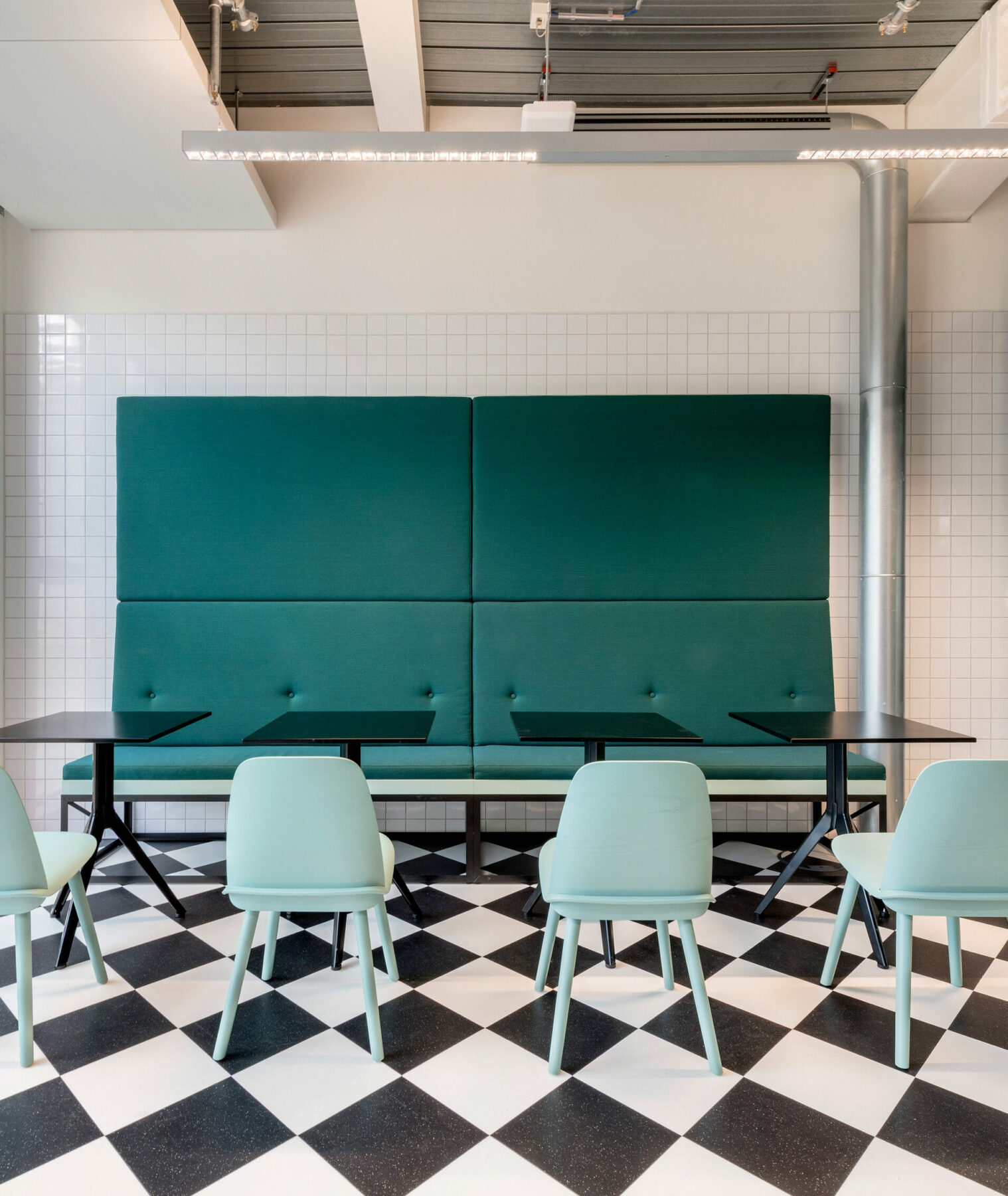 Die markanten Kücheninseln unterscheiden sich in Form, Farbe und Materialität und kennzeichnen die Eingänge zu den einzelnen Bereichen. Während die Sektion London mit rohem Stahl und dicken Holzbohlen aufwartet, zeigt sich Paris im grün-weißen Fliesenkleid. Sogar die abgehängten Deckensegel sind in unterschiedlichen Geometrien konstruiert und unterstreichen den Charakter der Metropole, die für den jeweiligen Bereich Pate steht.
