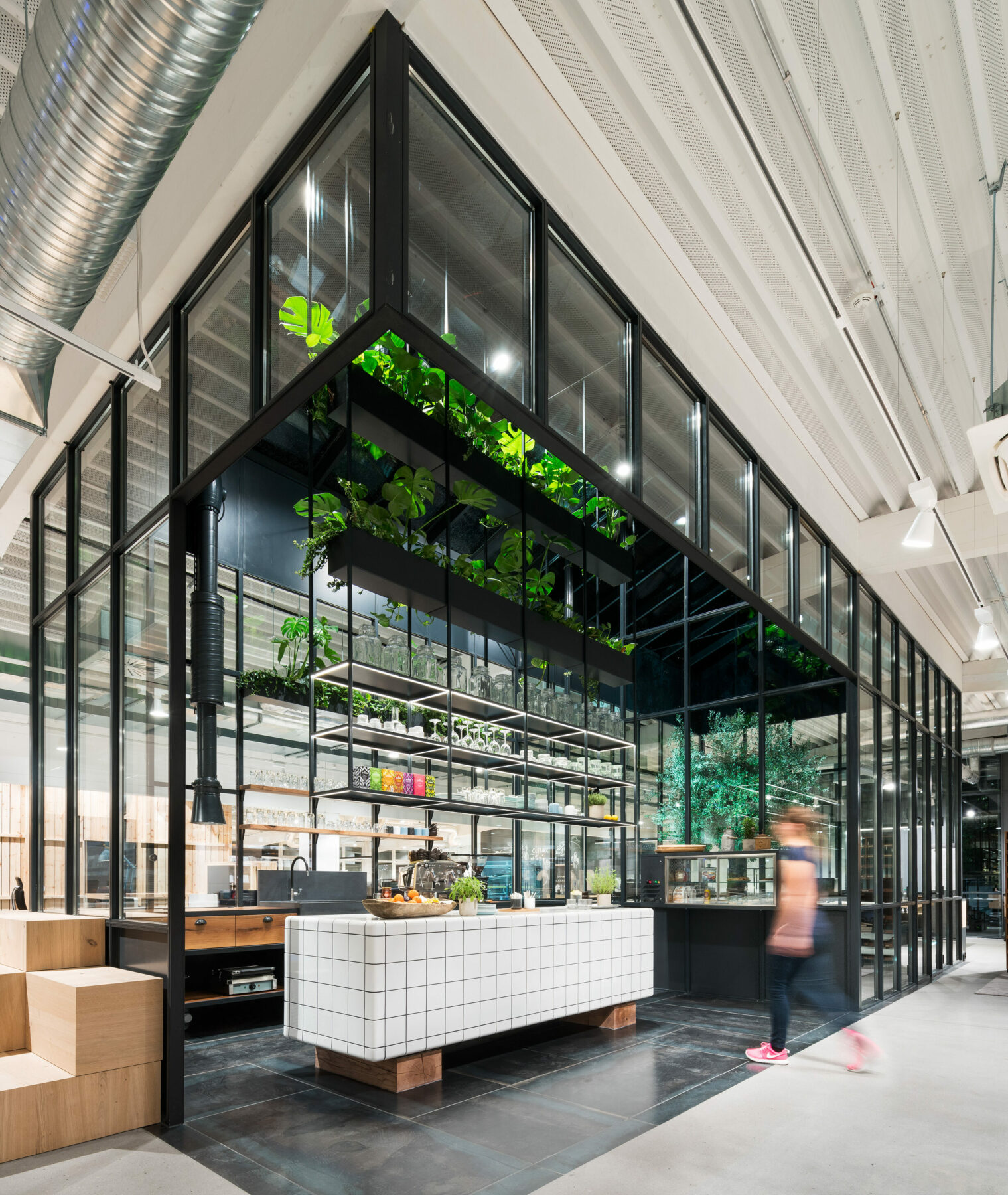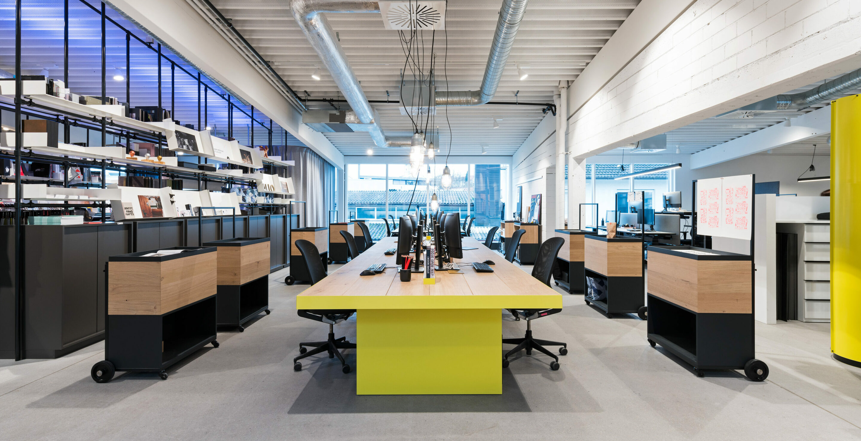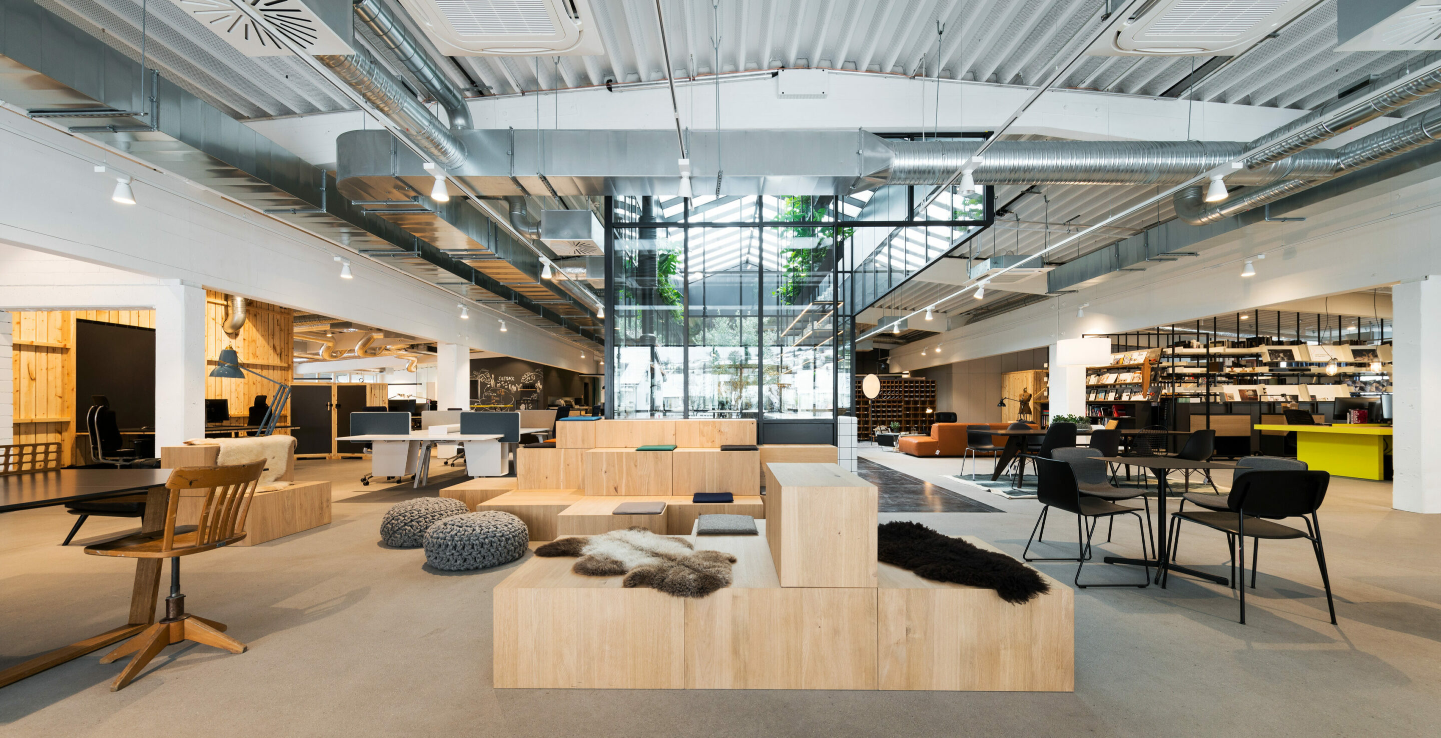 Wie der ungewöhnliche Name vermuten lässt, setzt sich die Fläche aus drei Teilen zusammen: Dem Büro für einen Teil unserer Mitarbeiter, unserem Laden für Designermöbel, sowie unserem Café. Und wie der neu geschaffene Name aus den drei zusammengesetzten Begriffen auch andeutet, gehören alle drei Bereiche unmittelbar zusammen und verschmelzen ineinander.