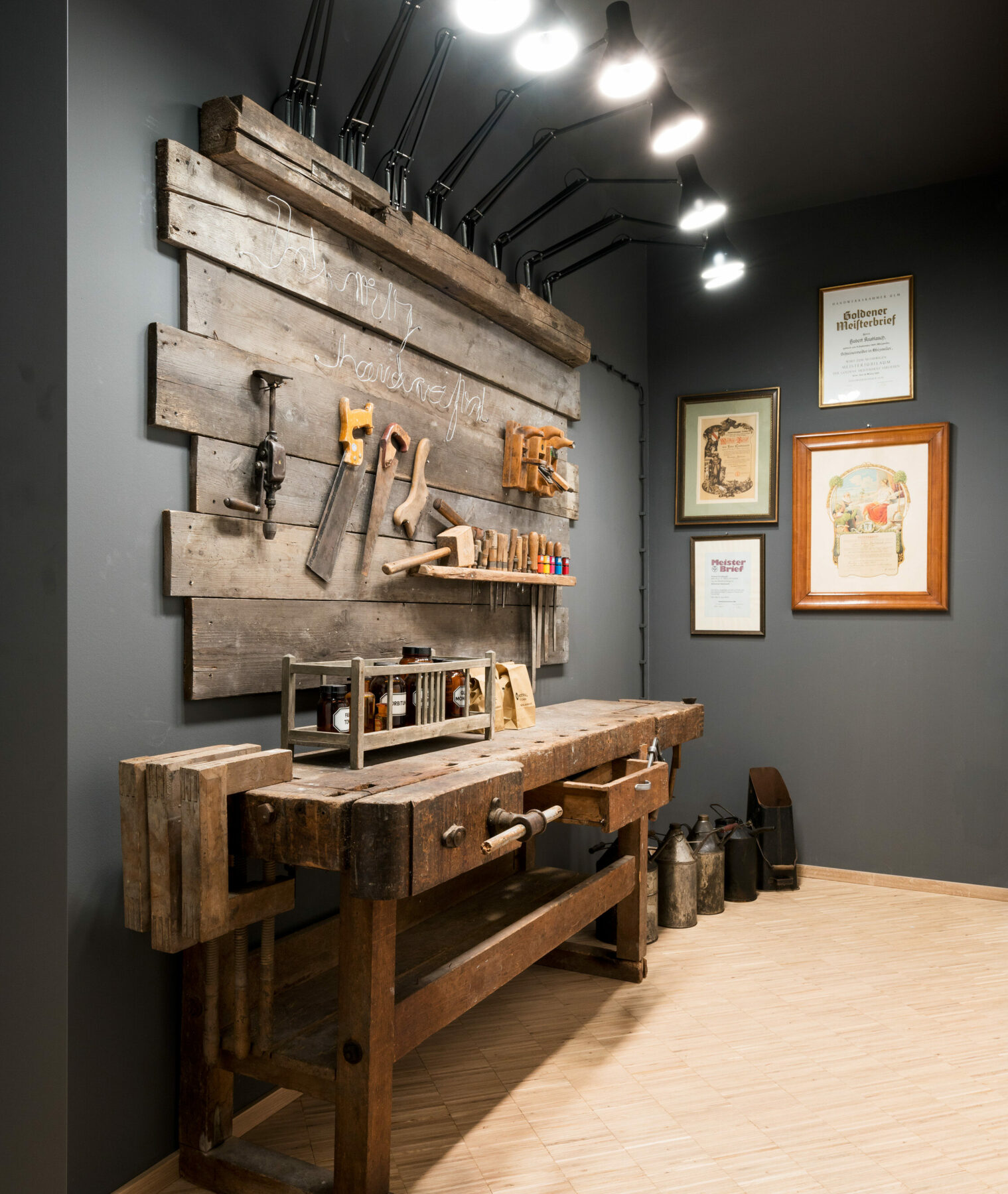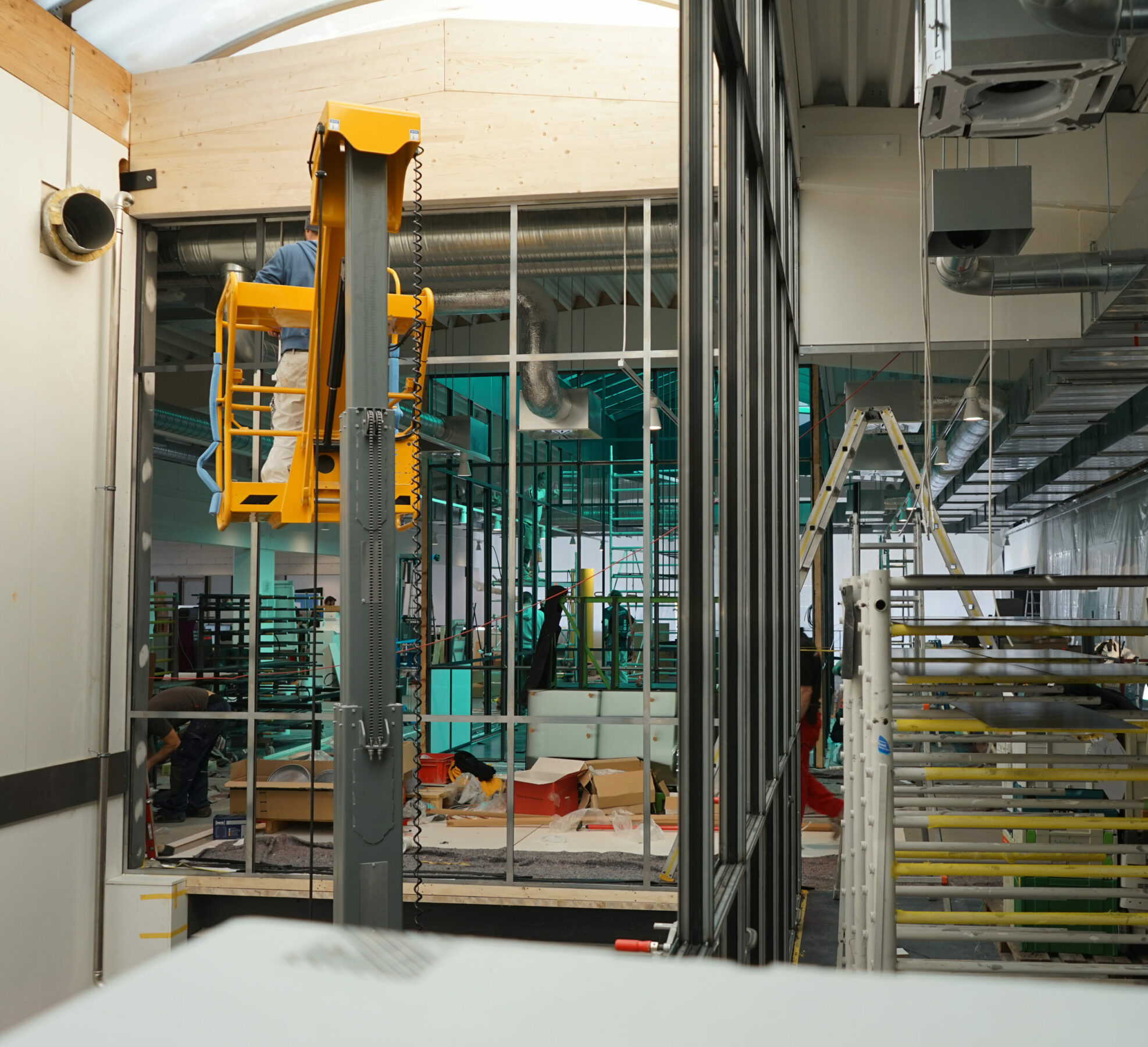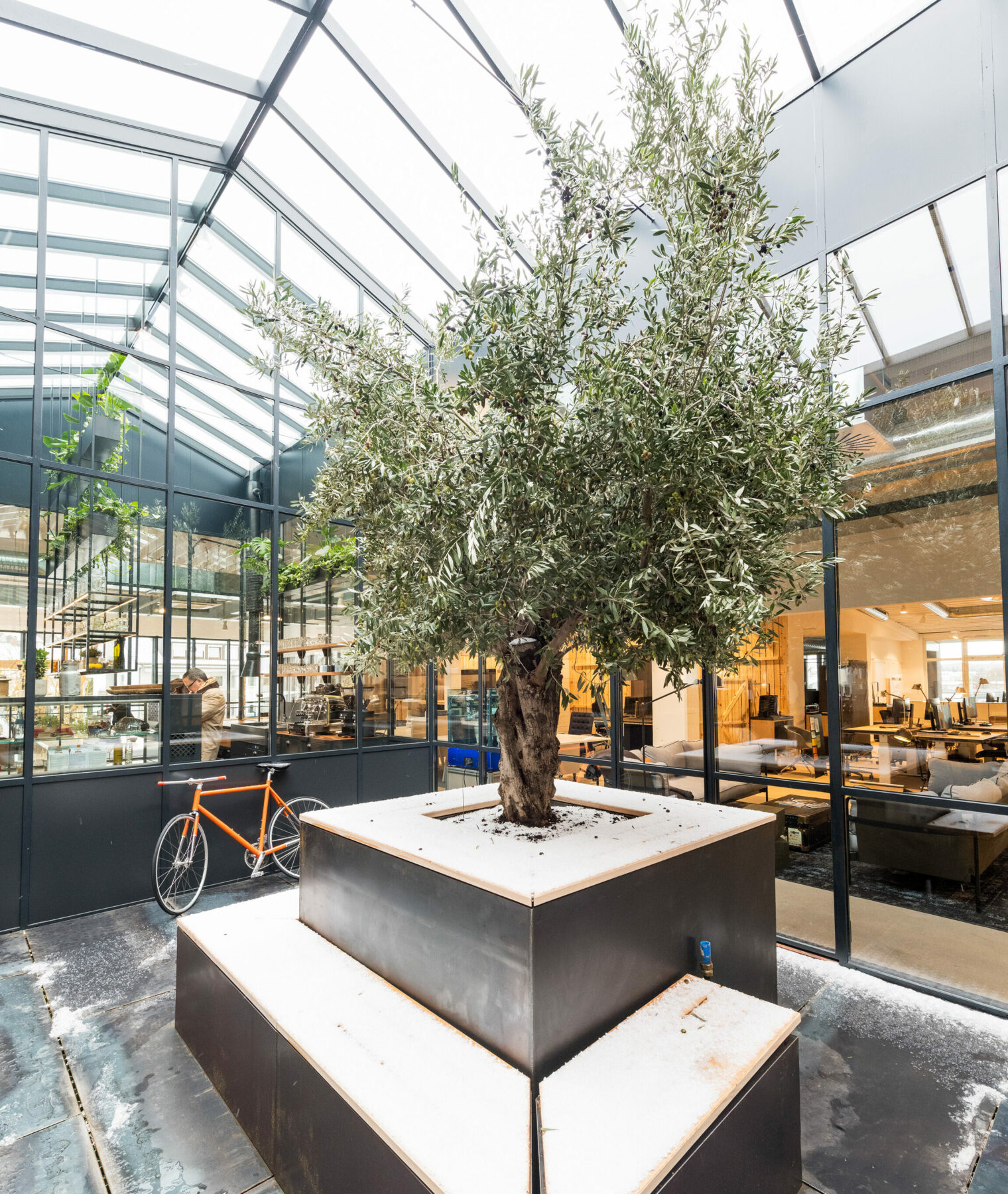 Die wichtigsten baulichen Maßnahmen: Zwei Durchbrüche für freie Sicht in die Werkstatt. Eine Öffnung in der Glaskuppel für den Dachgarten mit einem über 200 Jahre alten Olivenbaum. Eine neue Zwischendecke über der Schlosserei für 440 zusätzliche Quadratmeter. Fußbodenheizung, Beleuchtung und Klimatechnik nach neustem technischem Stand der EnEV (Energieeinsparverordnung). Ergonomische und höhenverstellbare Schreibtische. Schallschutz über schwere Theatervorhänge und einer hinterfütterten Zirbenholzwand.