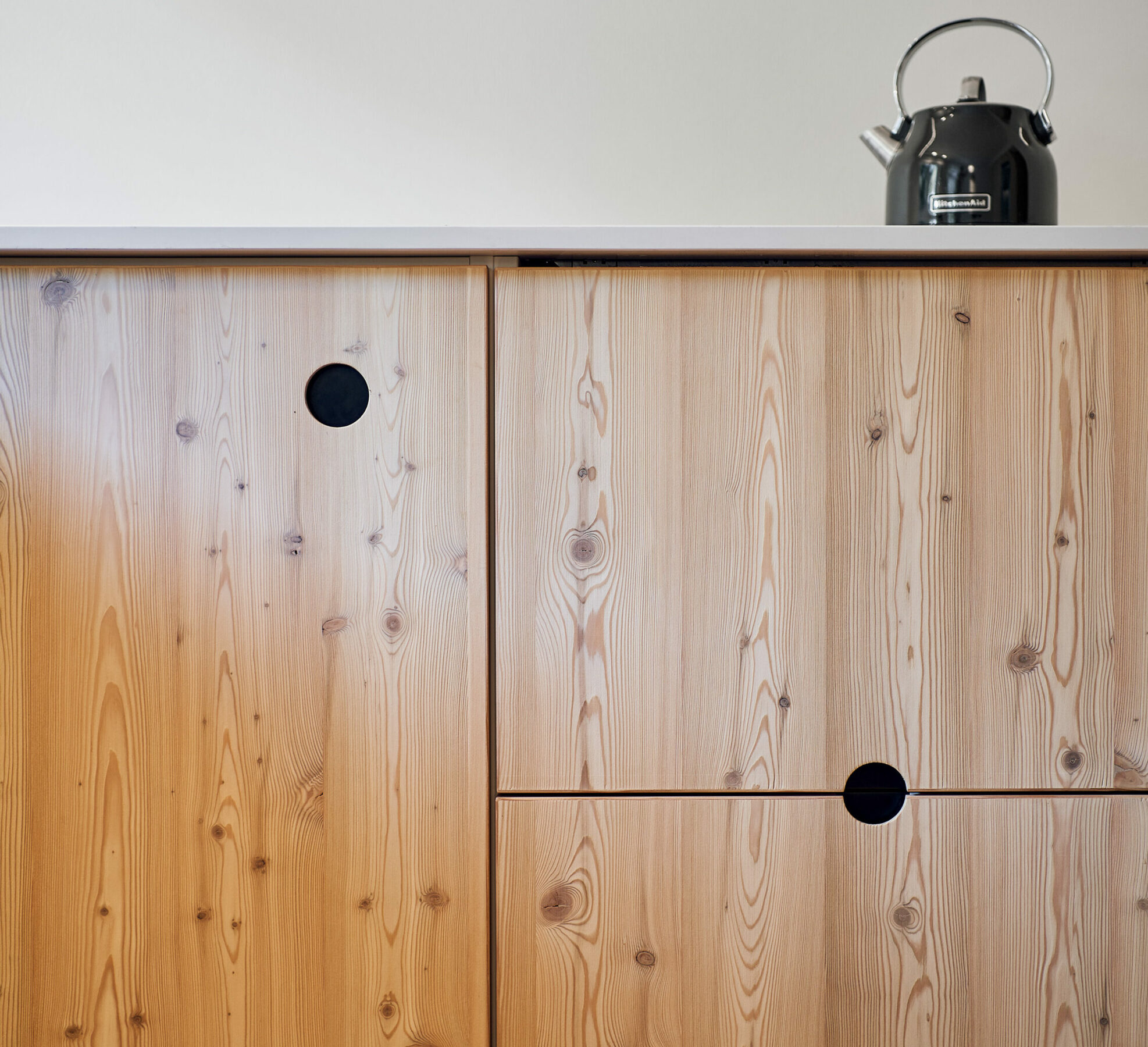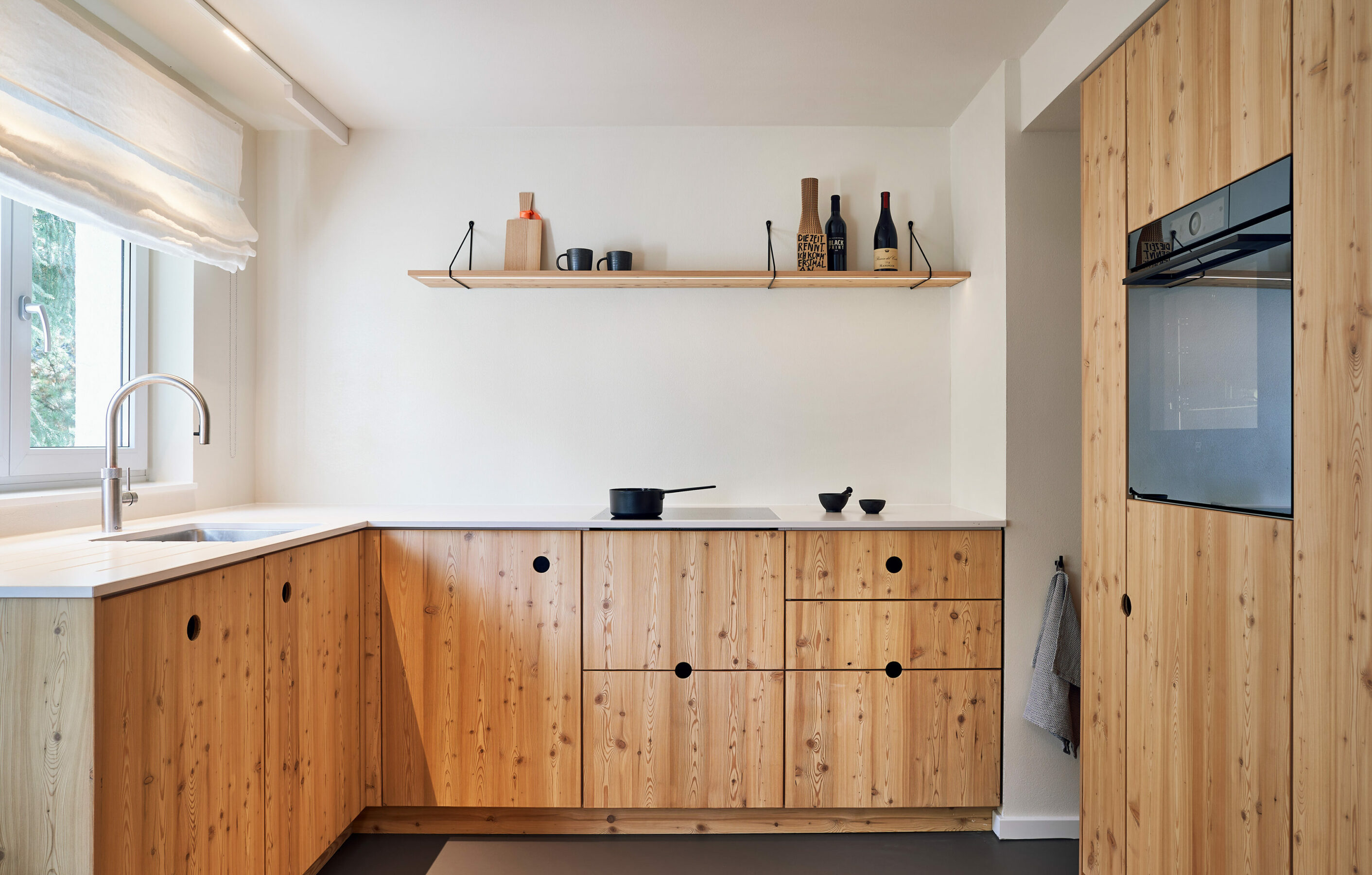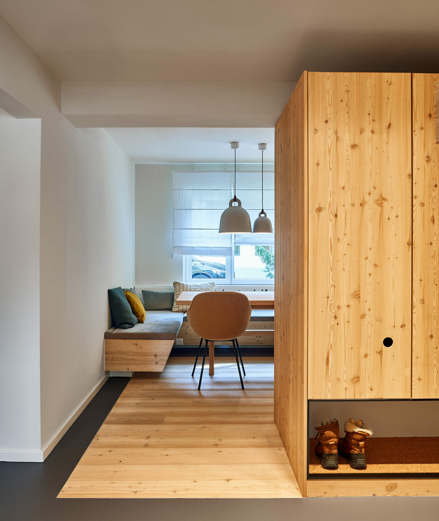 Durch den Wanddurchbruch entstand eine offene Wohnküche. Die verlängerte Wohnzimmerwand stellt eine optische Verbindung zur Küche her und rückt den Flur gekonnt aus dem Fokus. Schuhe und co. verschwinden im geräumigen Garderobenblock, der am Boden fließend in den Parkett der Wohnküche übergeht.
