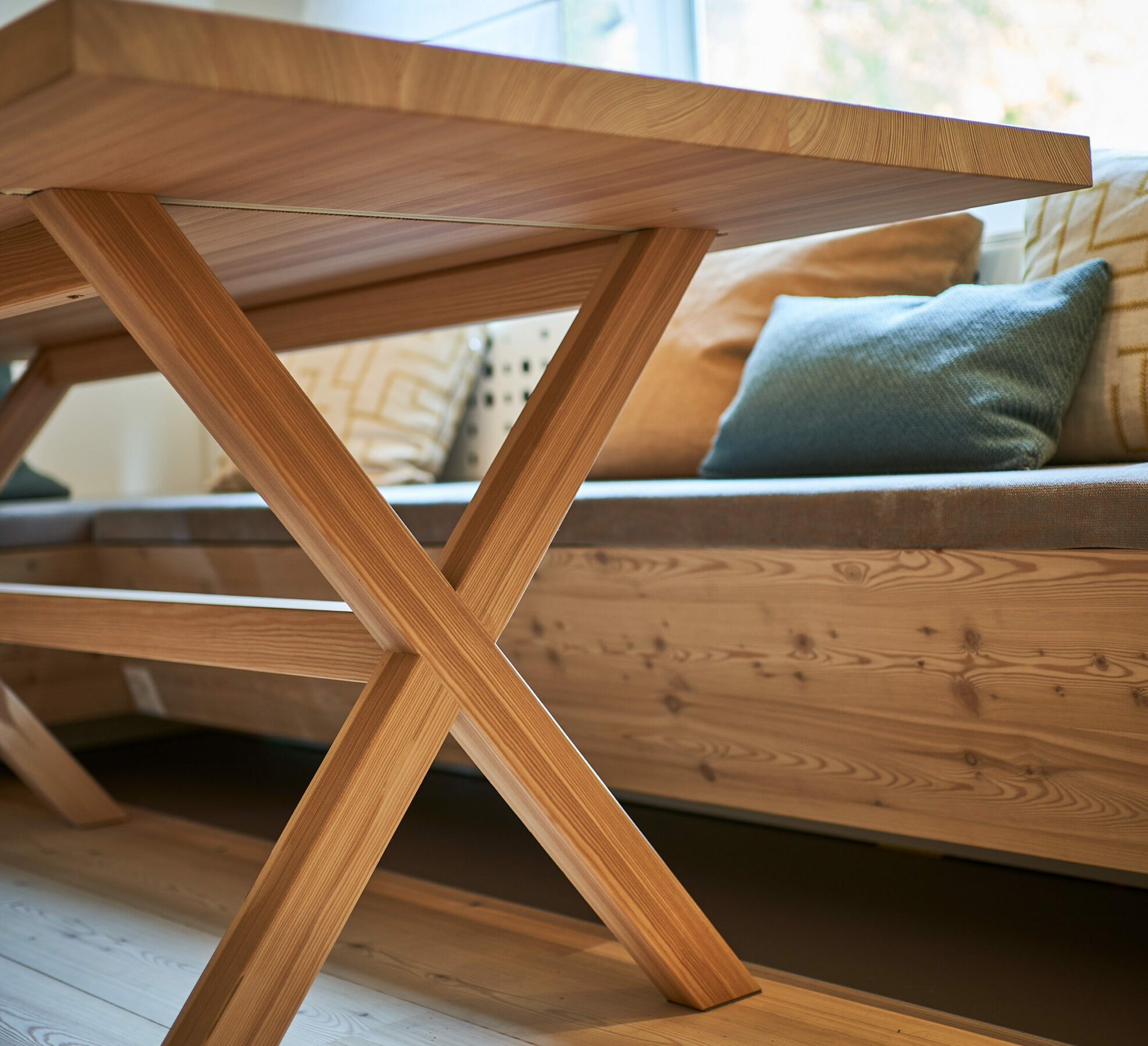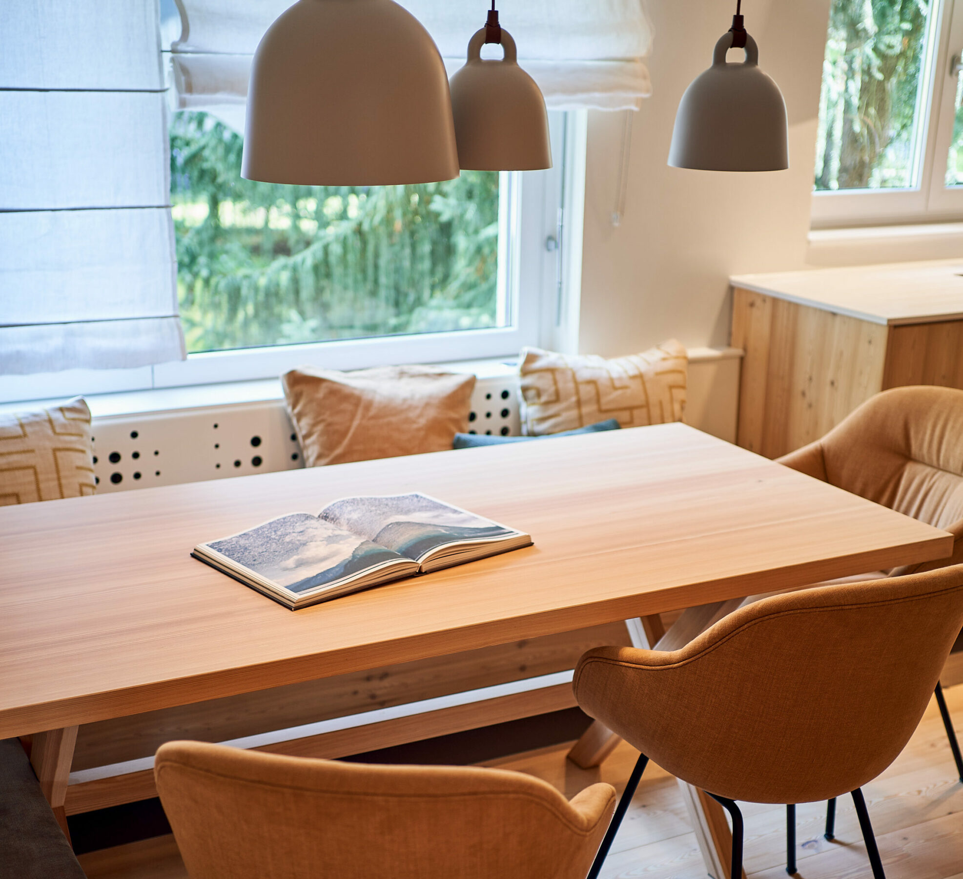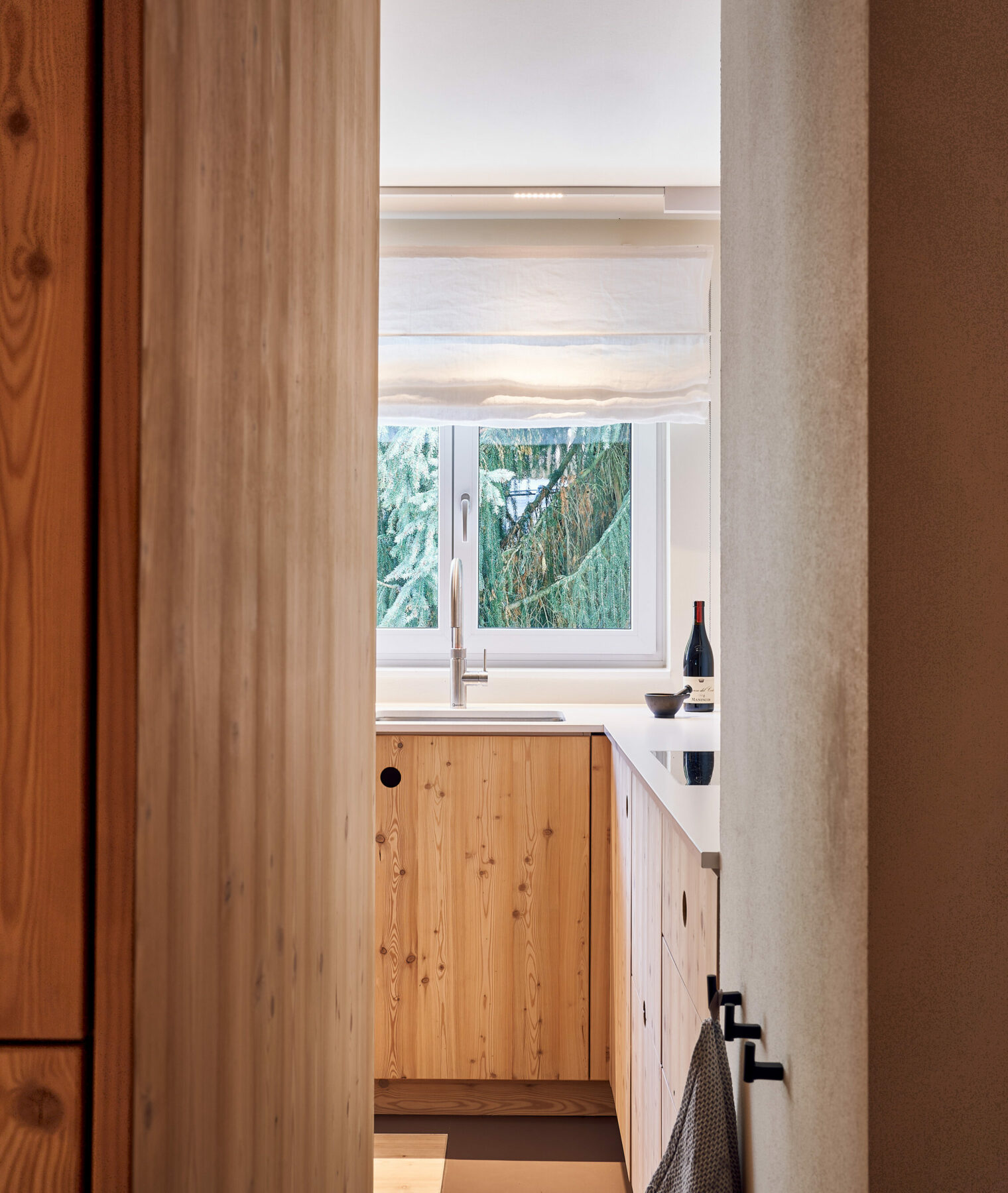 Die Küche, eine Maßanfertigung unserer Schreinerei. Der Mix aus cleanem Design und naturbelassenem Holz erinnert an die Ursprünglichkeit der Natur. Absolut Alpen chic. Der angrenzende Essbereich, die moderne Interpretation von „guter Stube“. Eine Eckbank und gemütliche Stühle in erdigen Tönen laden an einem traditionellen Holztisch zum vertrauten Beisammensitzen ein.