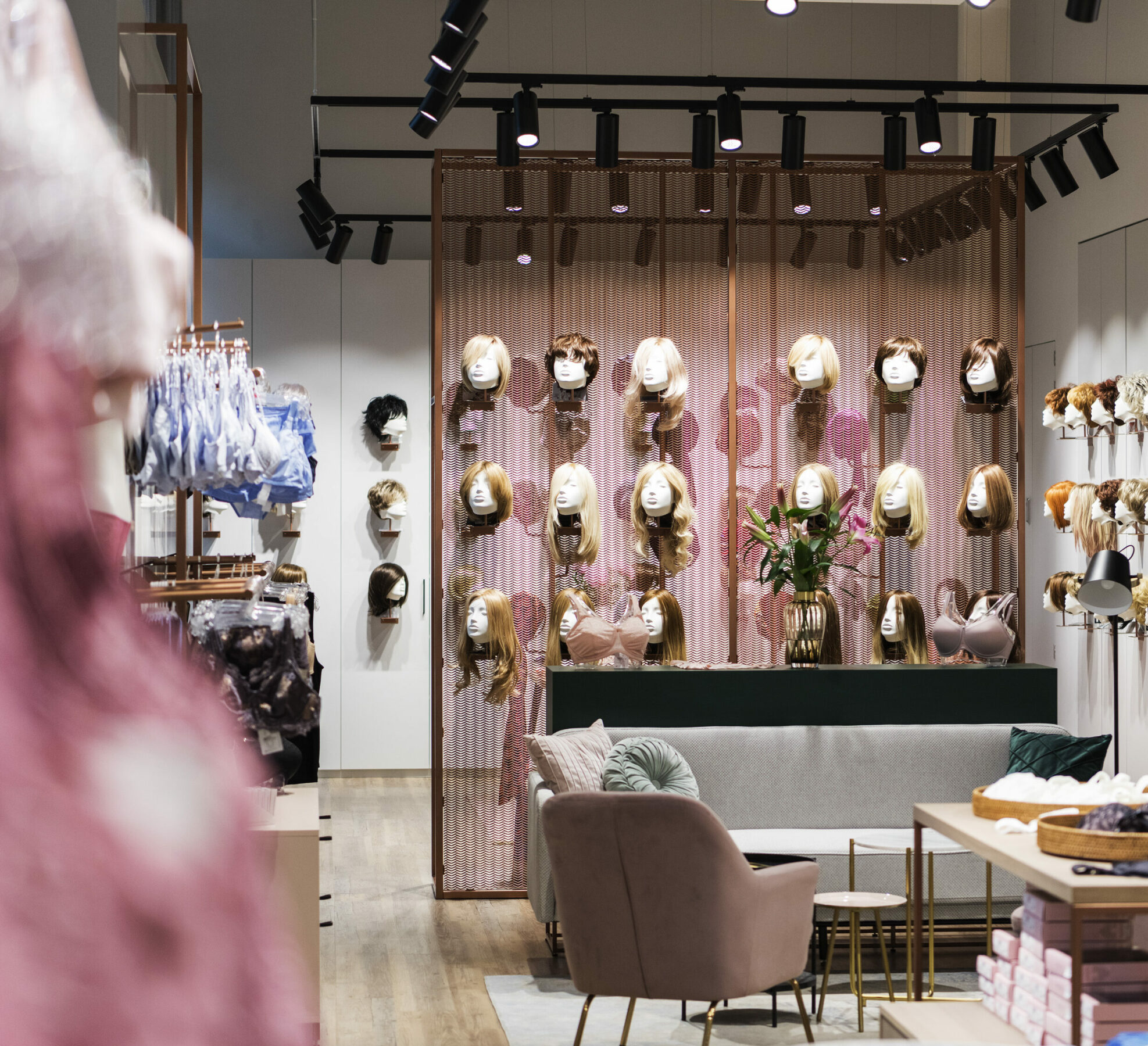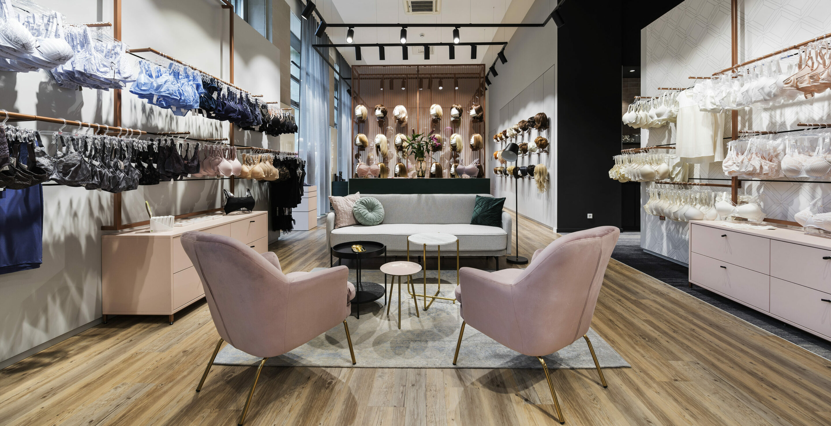 Die klare Anordnung der Warenwände und die aufgeräumte Produktpräsentation ermutigt die Kundinnen das Sortiment zu entdecken und sich damit vertraut zu machen. Unterstützt wird das Einkaufserlebnis durch ergänzende Wellness- und Beautyaccessoires, die den Fokus an mancher Stelle gewollt verschieben und den Frauen ein Gefühl von Wertschätzung und zugleich Normalität vermitteln.
