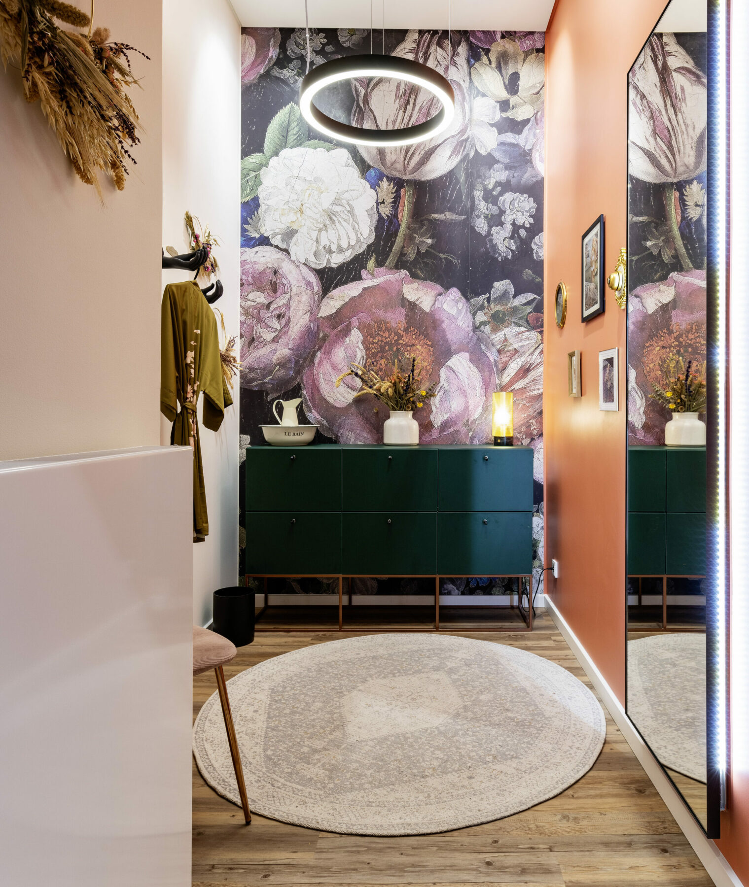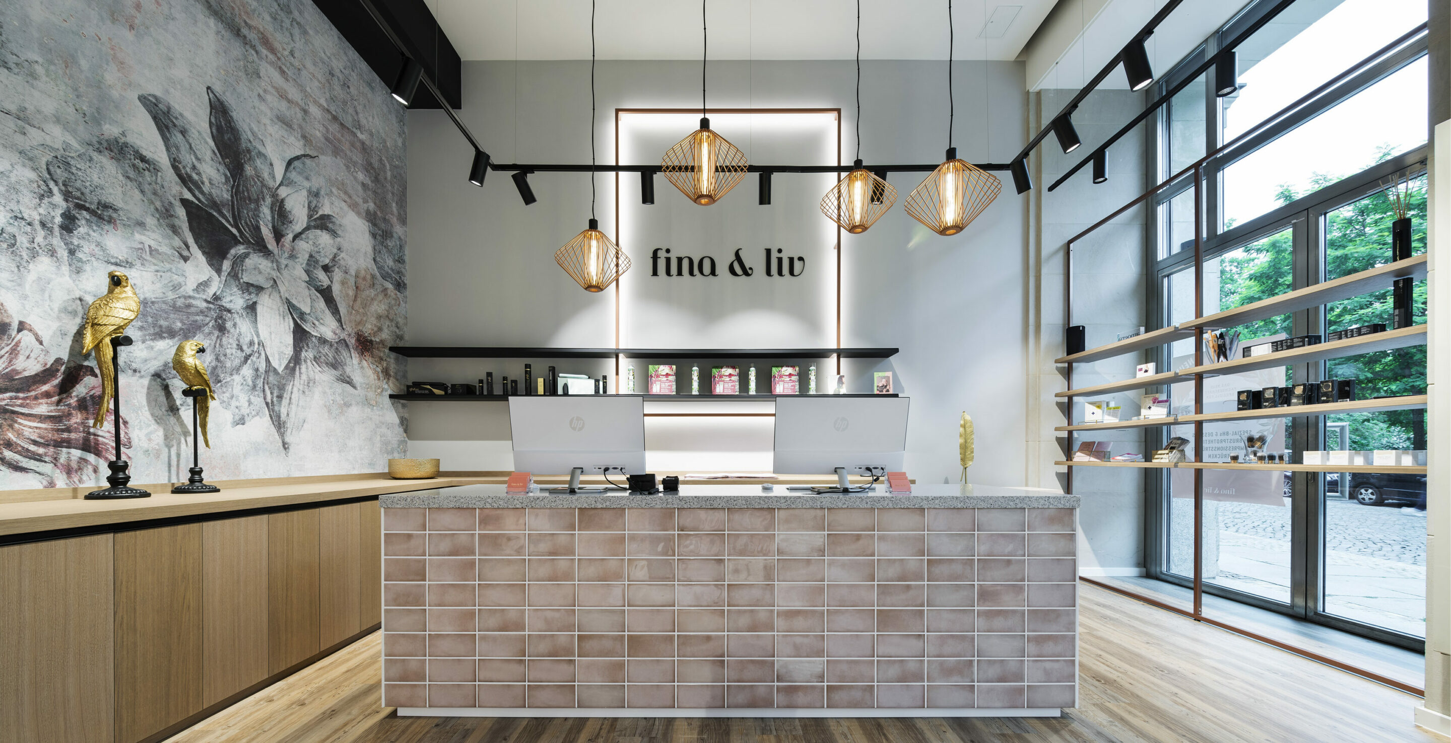 Die verwendeten Farbtöne Rosé, Grün und Kupfer hüllen die Stores in ein samtenes Ambiente, das durch die Tapeten mit großzügigen Blumenmotiven noch betont wird. Das geradlinige Möbeldesign, die Fliesen an der Kassentheke und die grafischen Muster an Teilen der Wände setzen einen modernen Akzent, der das Gesamtbild abrundet. Fina & Liv übersetzt die Idee eines neuen Lebensgefühls in ein feinsinniges Storedesign.