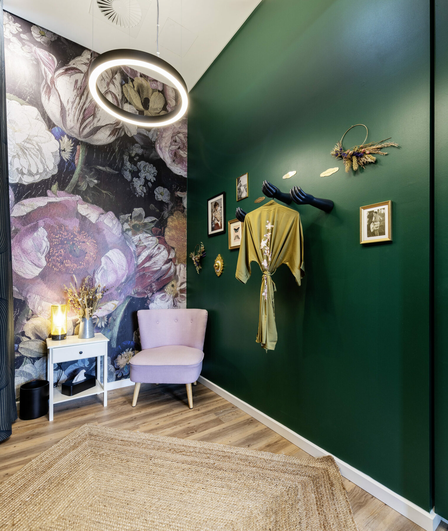 Der Raum ist freundlich und offen gestaltet und bietet gleichzeitig Rückzugsmöglichkeiten: Kreisrund angebrachte Akustikvorhänge werden zu großzügigen Kabinen zugezogen und kreieren bei Bedarf einen privaten Raum für Beratung, Anpassung und Anprobe.
