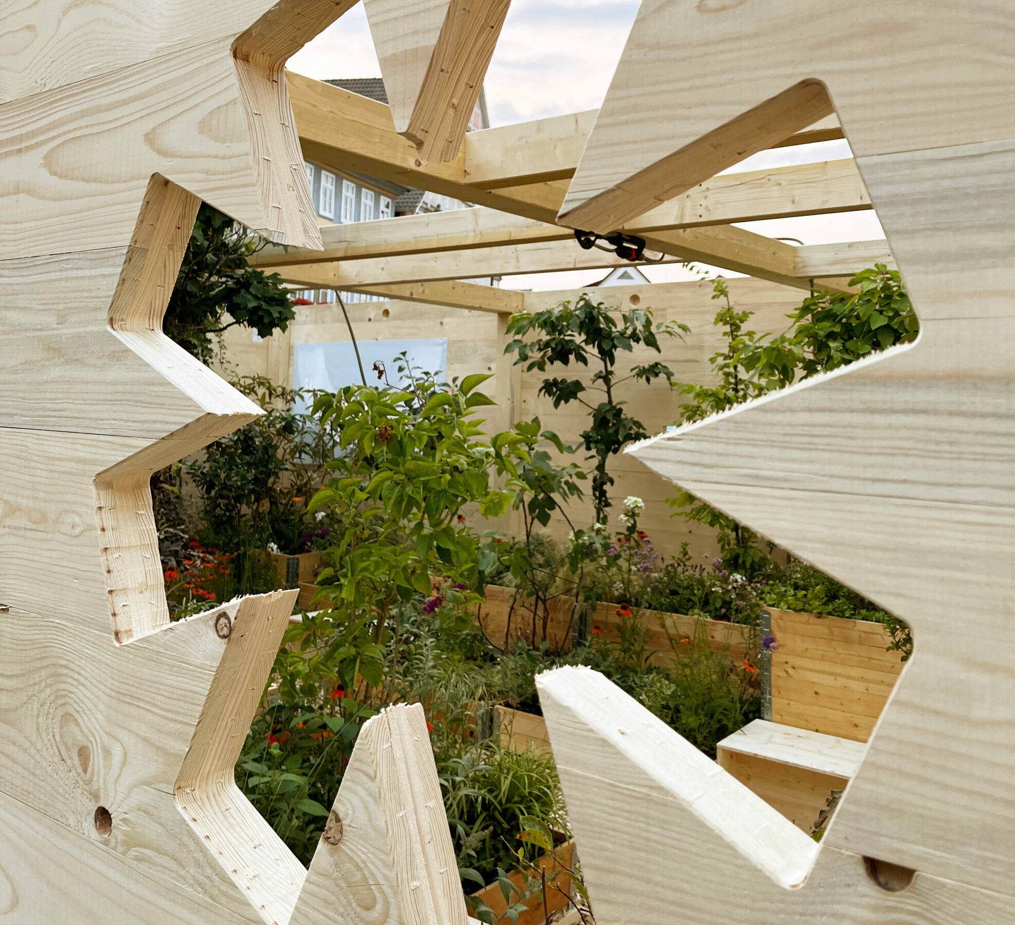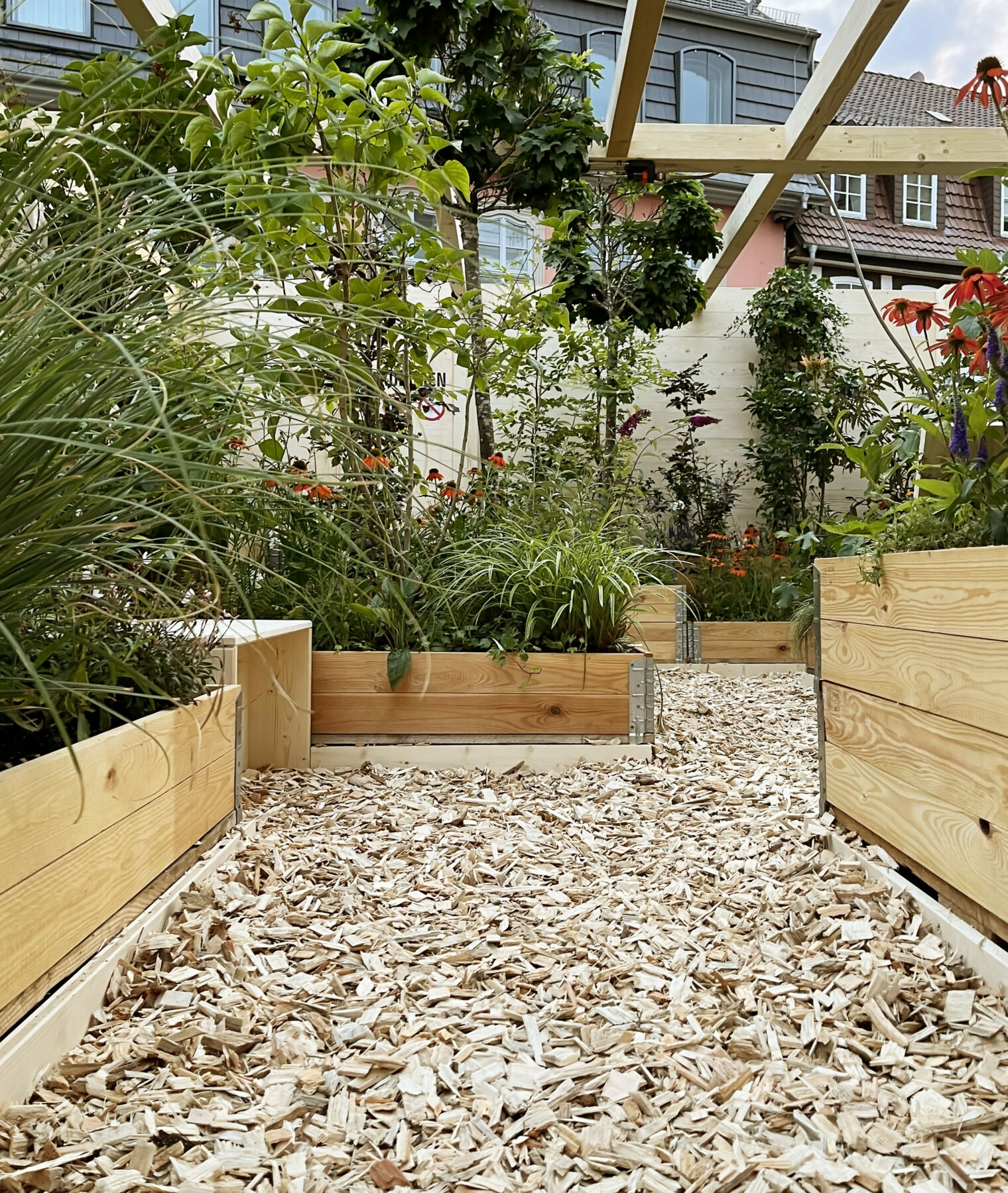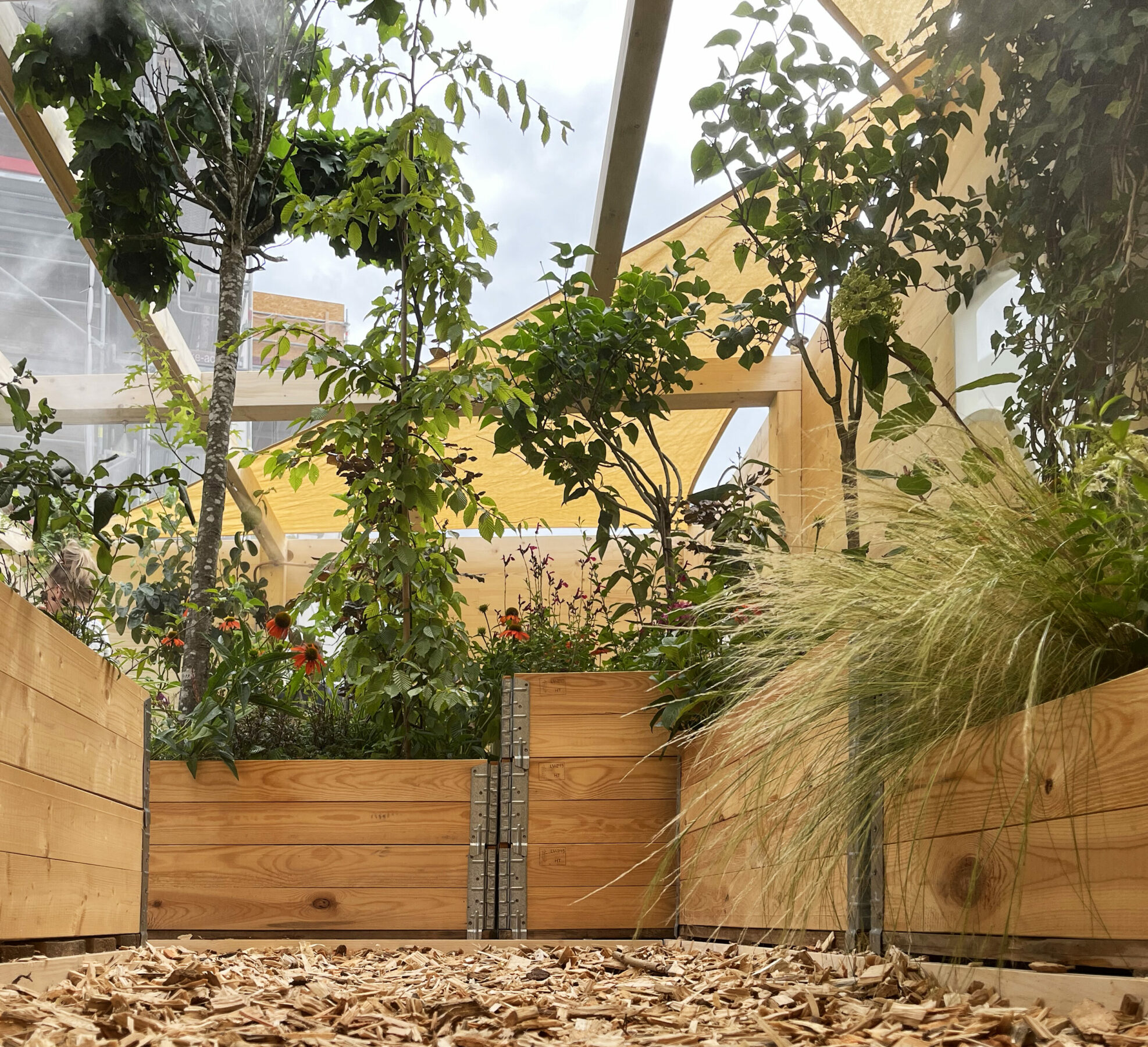 Hinter der raffen Fichtenfassade versteckt sich eine Parallelwelt. Ab nach „Klein-Narnia“: Die Tür knarrt leise beim Öffnen. Grüne Ranken, saftige Sträucher, Obstbäume und Blumen, wohin das Auge reicht. Das Blätterdach bietet zuverlässig Unterschlupf – auch bei Rekordhitze. Der Duft von Blumen und reifen Früchten erfüllt die Luft. Von oben weht kühle Feuchtigkeit aus der Sprühnebelanlage herab und legt sich kaum spürbar auf die Haut. Munteres Vogelgezwitscher trällert aus versteckten Lautsprechern. Eine Einladung zum Bleiben.