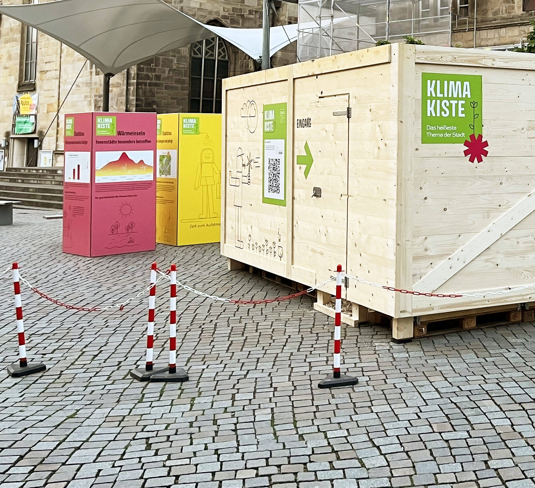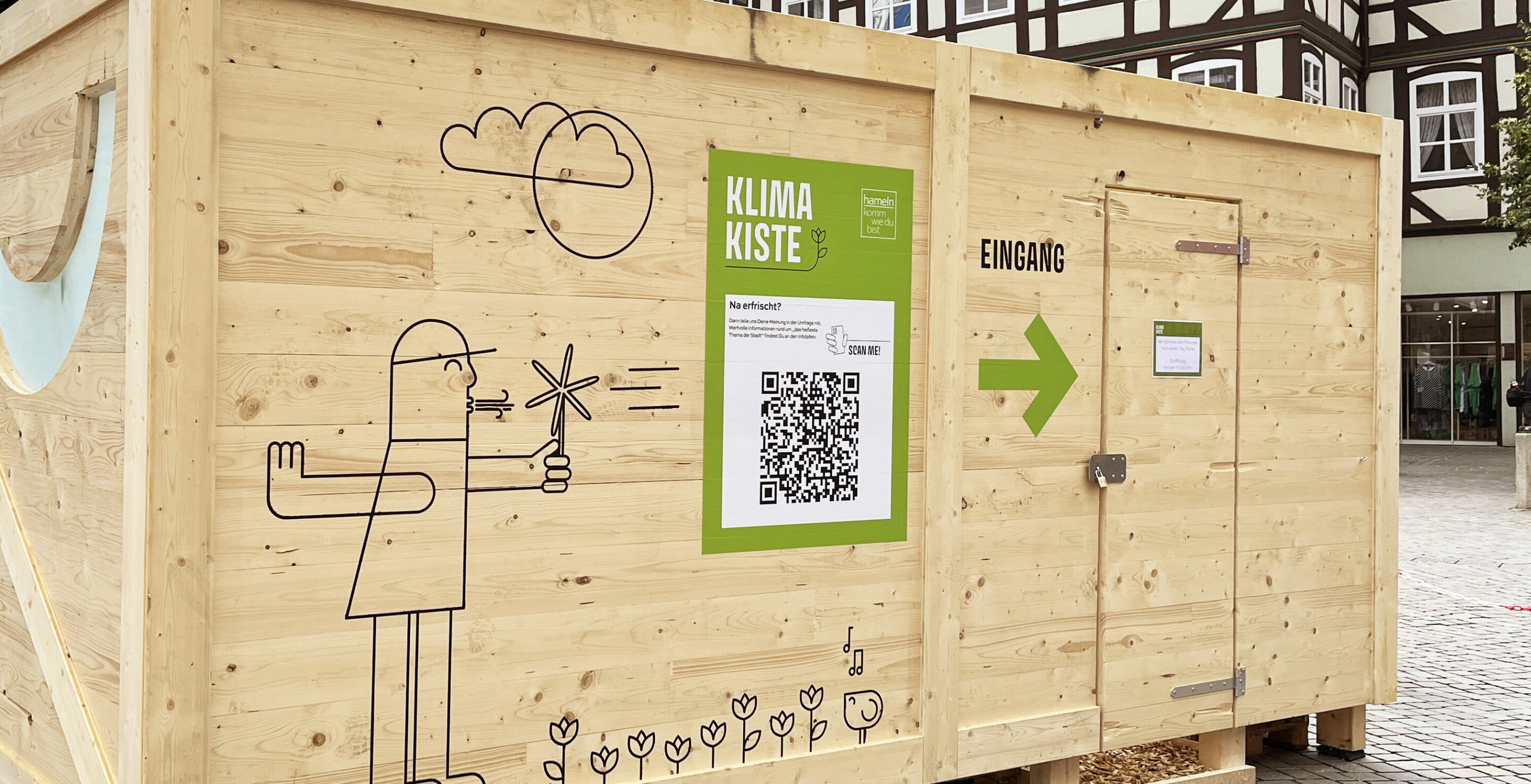 Die Klima Kiste in Hameln auf dem Marktplatz ist die erste in Deutschland. Ein Pilotprojekt. Eine grüne, kühle Wildnis in einer Box. Drinnen ist es 10 – 13 Grad kühler als draußen. Endlich Hitzefrei!