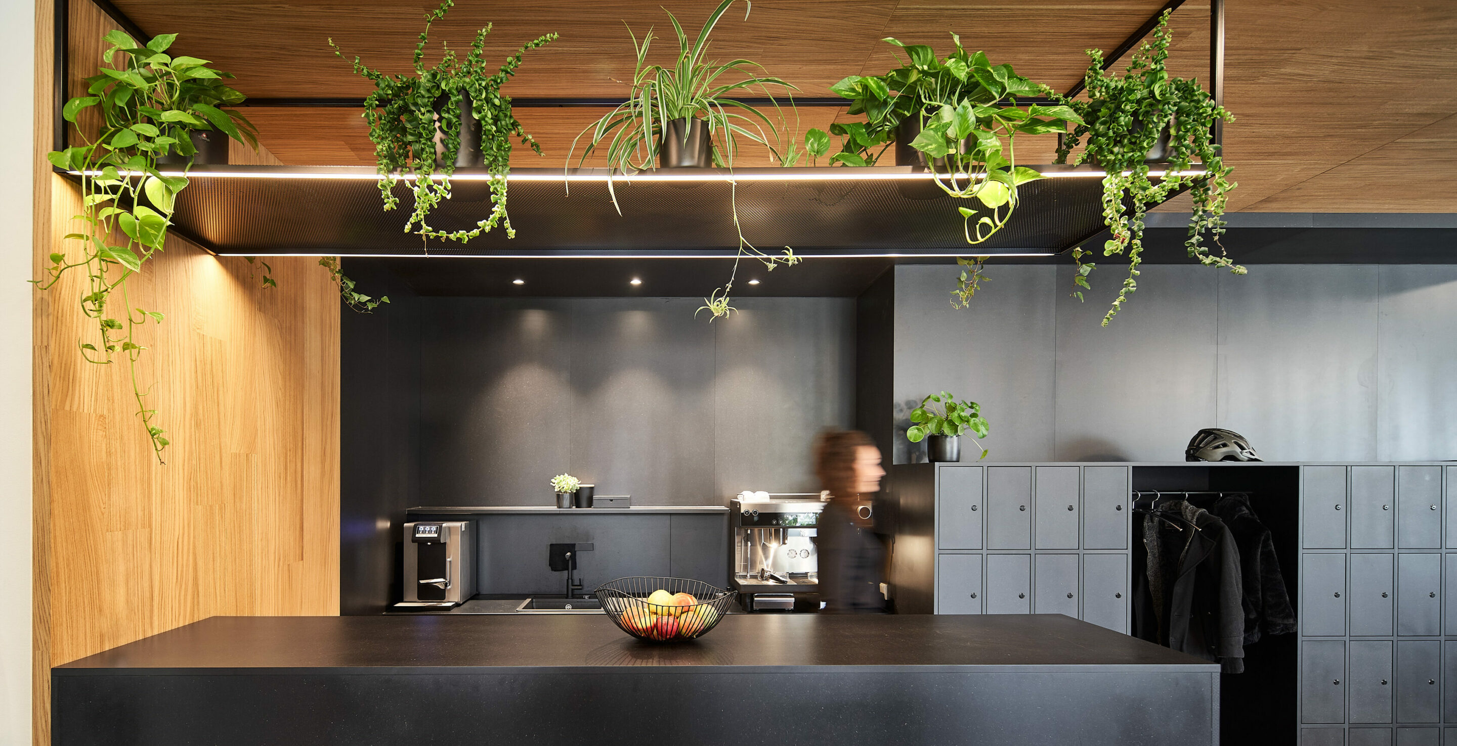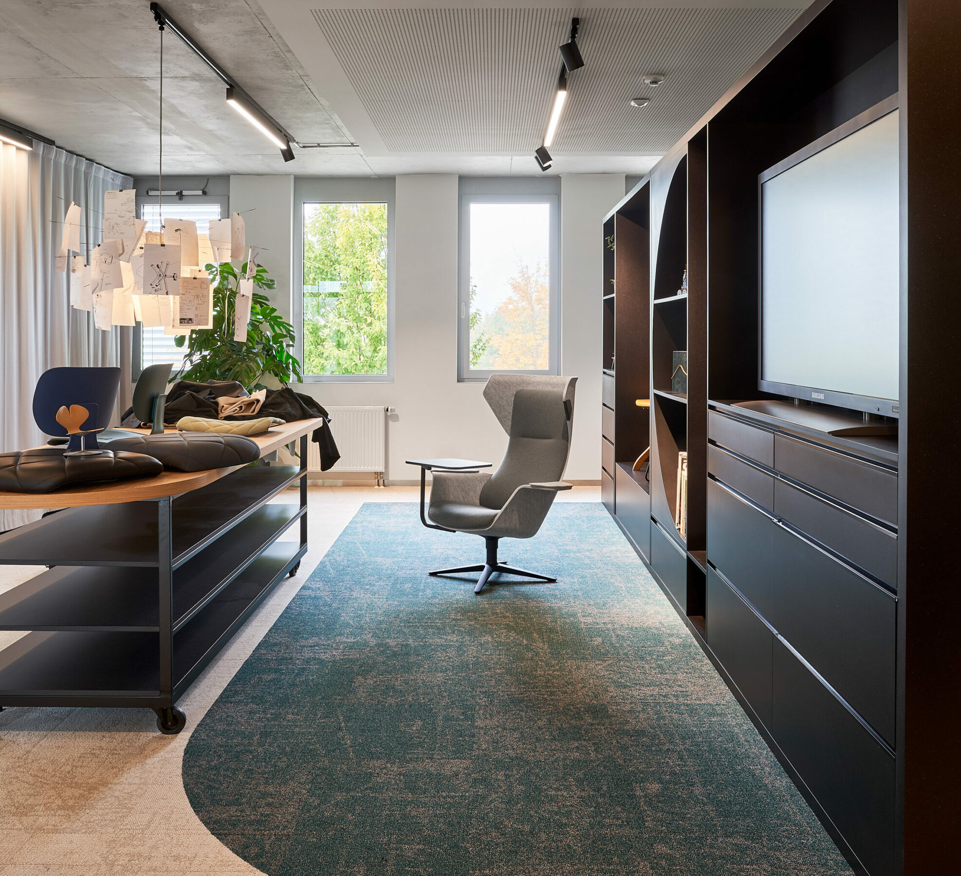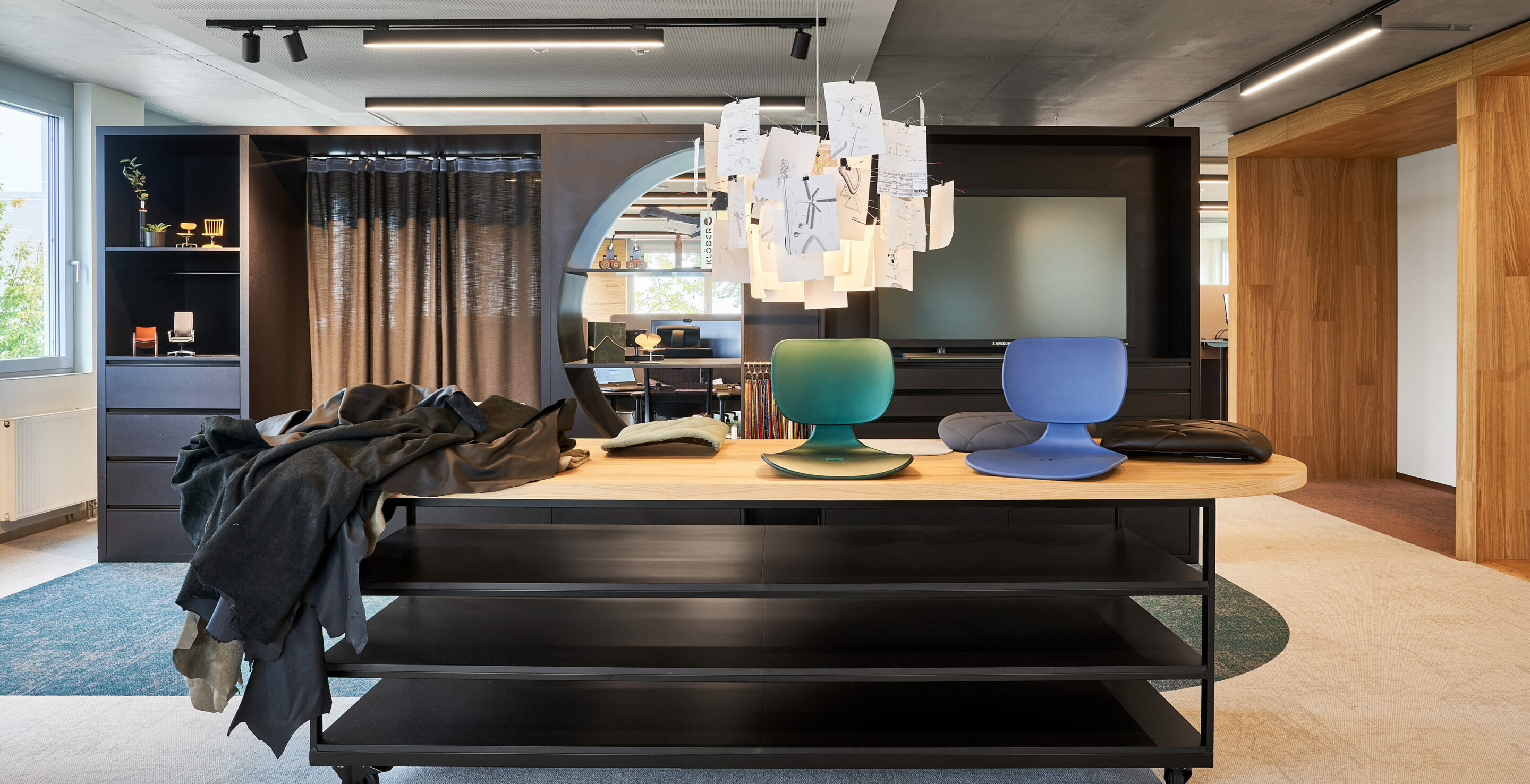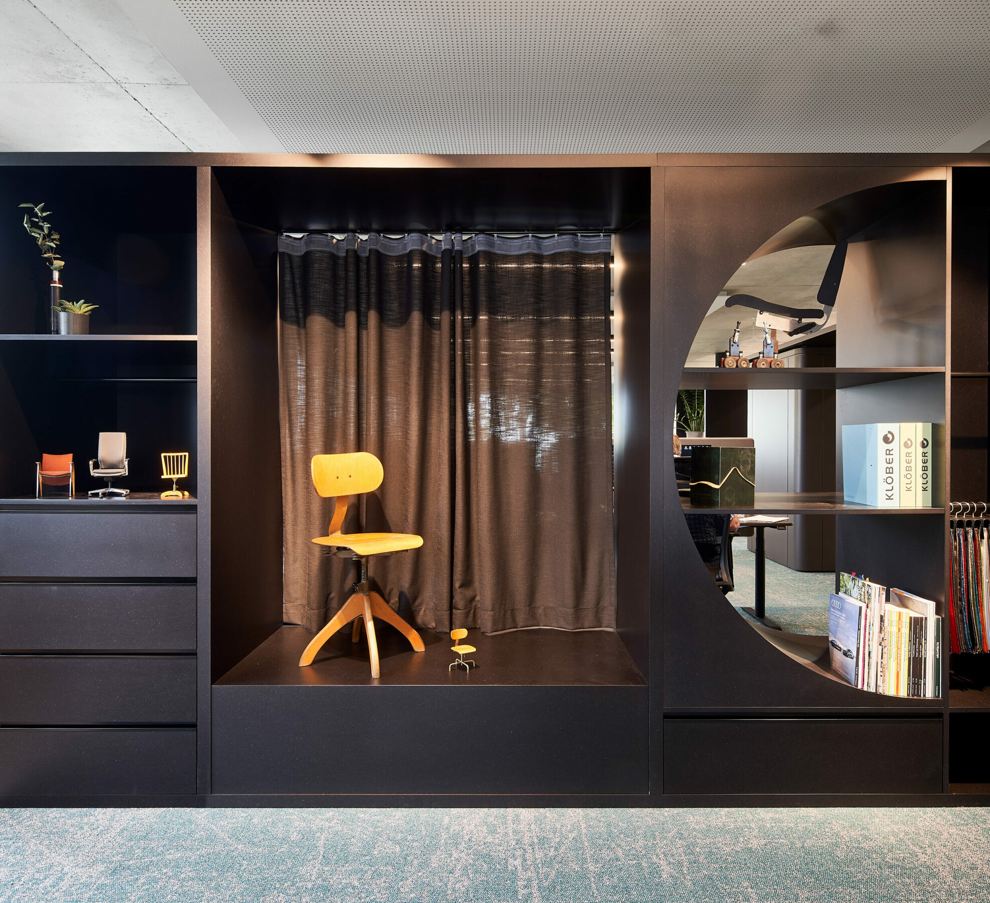 Margarete Klöber, die das Unternehmen 1935 gründete, war ihrer Zeit weit voraus. „Die Freiheit besser zu sitzen, ist die Kunst, sich bei der Arbeit wohlzufühlen“,wusste sie damals schon. Mit ihrer mutigen Haltung und ihrem freudigen Entdeckergeist prägt sie bis heute die Unternehmenswerte. Und diese sind im umgebauten Büro überall zu spüren. Die zurückhaltenden Materialien – wie das gebürstete Eichenholz und die schwarz durchgefärbte HDF-Platten – erzeugen eine heimelige Atmosphäre und die raumtrennenden Möbeln dienen wie kleine Museumsinseln, wo historische Modelle zu entdecken sind, und auch als Kreativecken, wo getüftelt und bemustert wird. Wo es Stoffe, Skizzen und Entwürfe zu finden sind.
