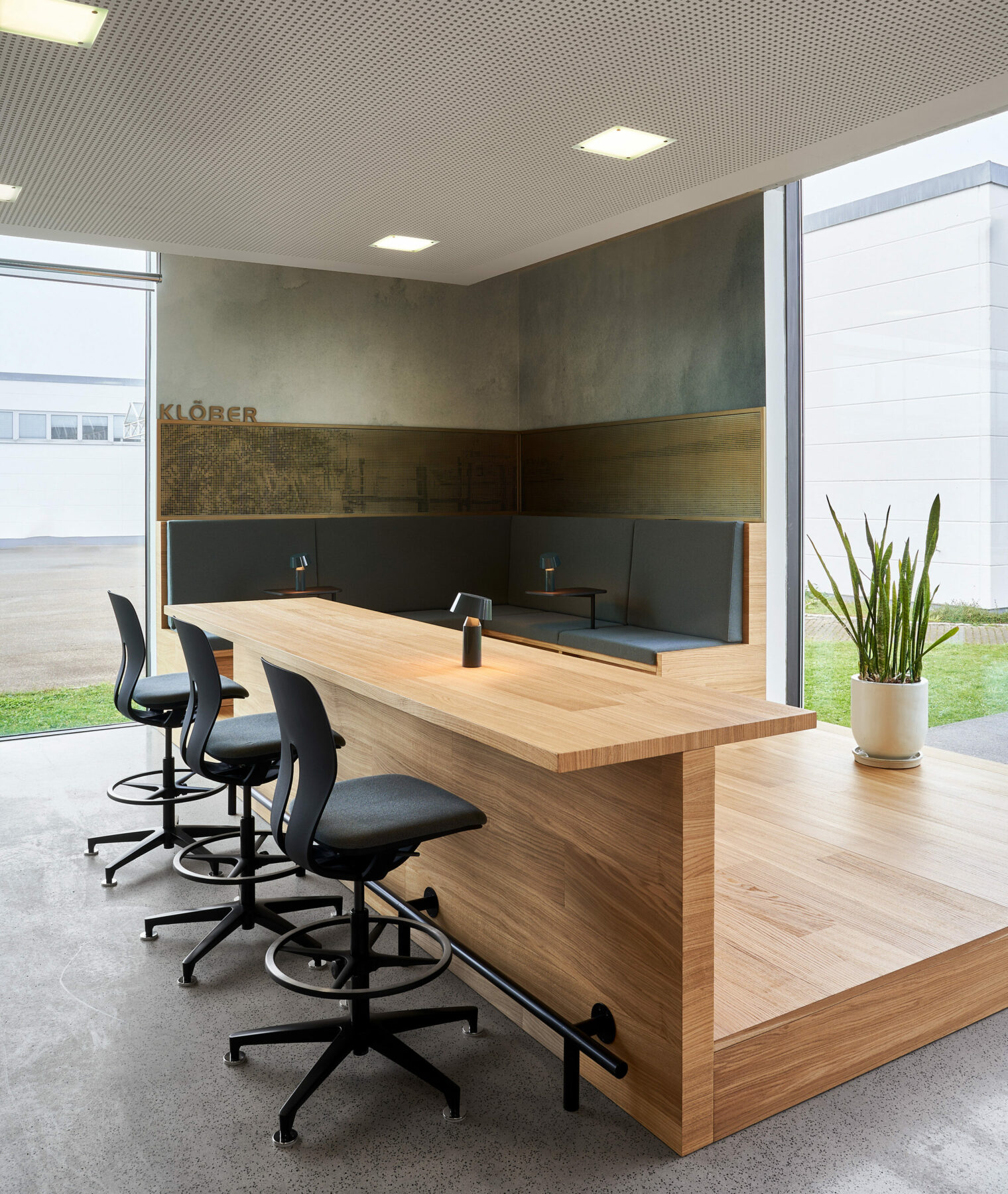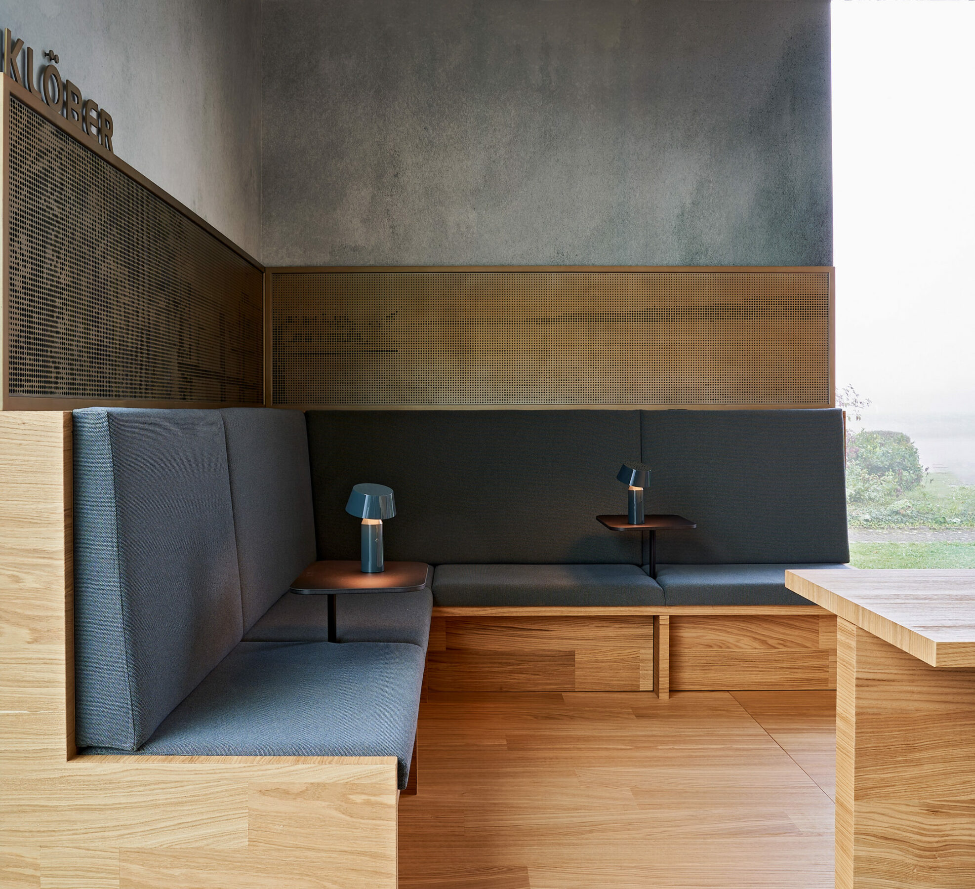 Die Sitzecke im Café wird von einem großangelegten Foto auf Lochblech geschmückt. Die Machart ist so gewählt, dass das Bild zunächst atmosphärisch erscheint. Erst bei genauer Betrachtung erkennt man das eigentliche Motiv – den Landungsplatz am Bodensee – und darin den Stolz des Unternehmens auf seine Herkunft und den Produktionsstandort. Das Firmenlogo von Klöber macht mit seinem dynamisch runden Symbol subtil darauf aufmerksam, dass Sitzen niemals starr sein sollte, sondern in ergonomischer Bewegung stattfindet. Dieser Ansatz, der ja auch die Denke des Unternehmens beschreibt – niemals starr, immer in Bewegung – wird als zentraler Infopoint im Workcafé figürlich dargestellt.