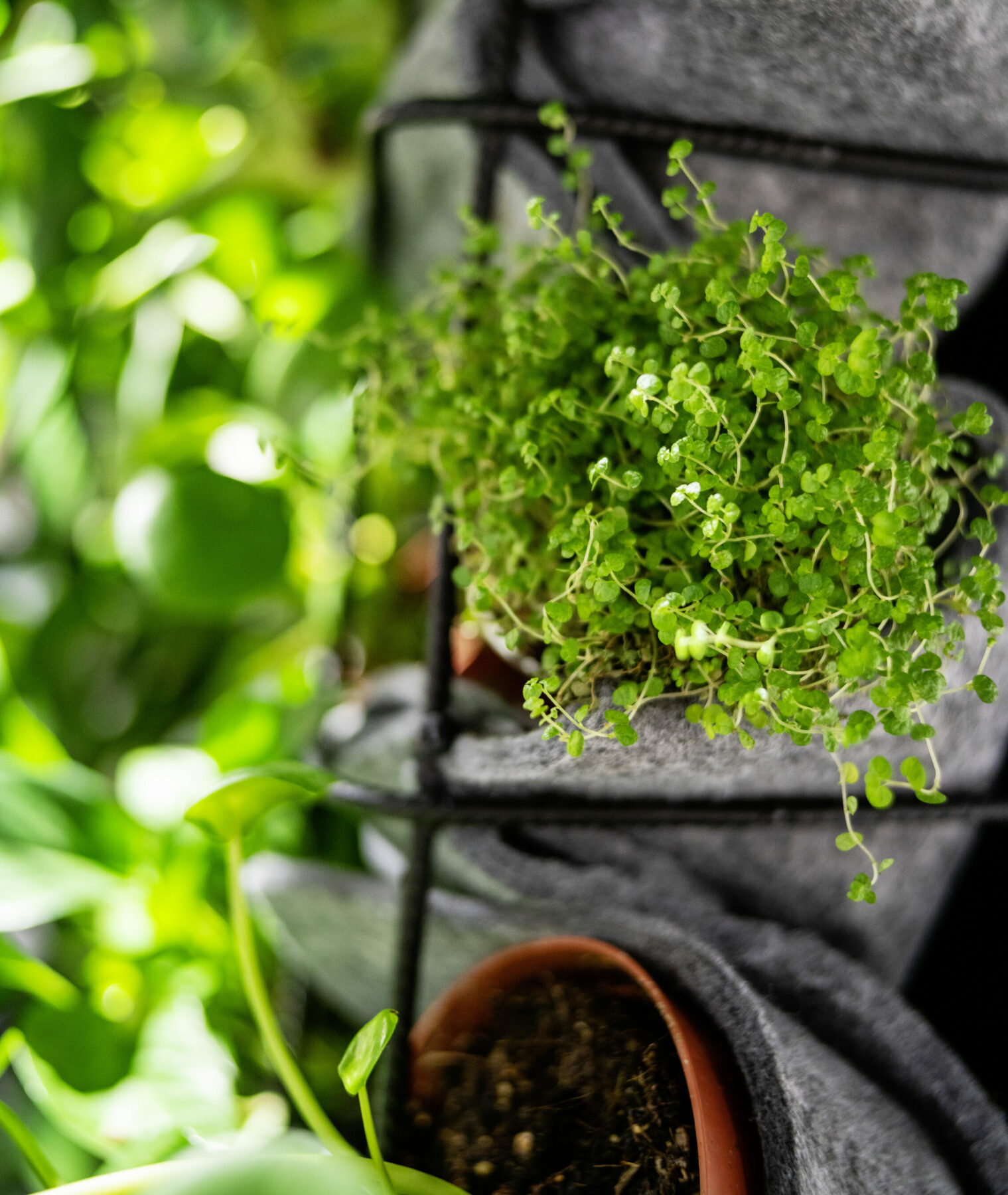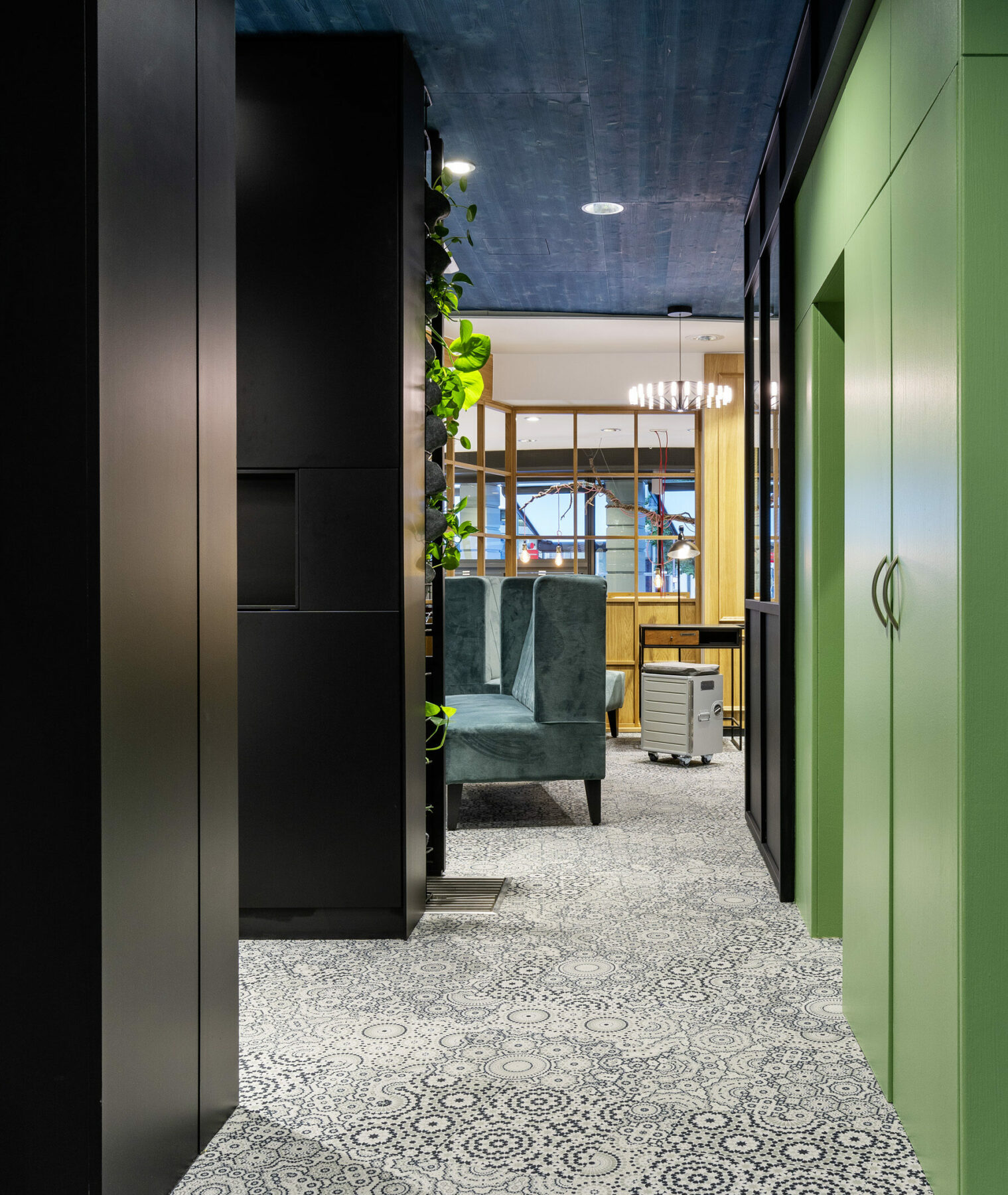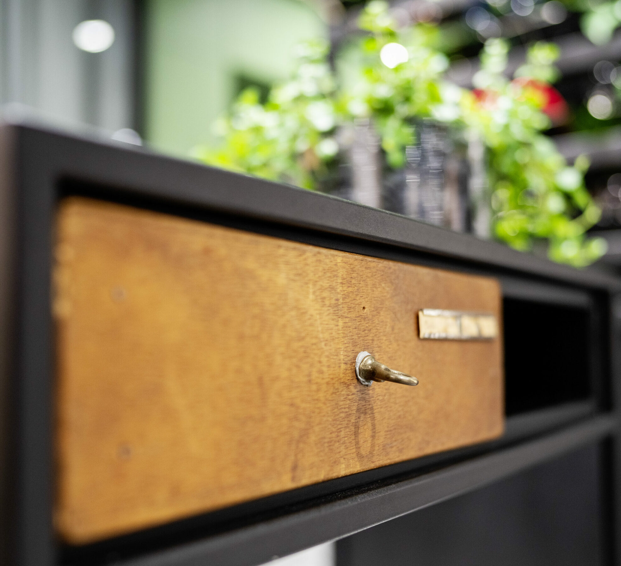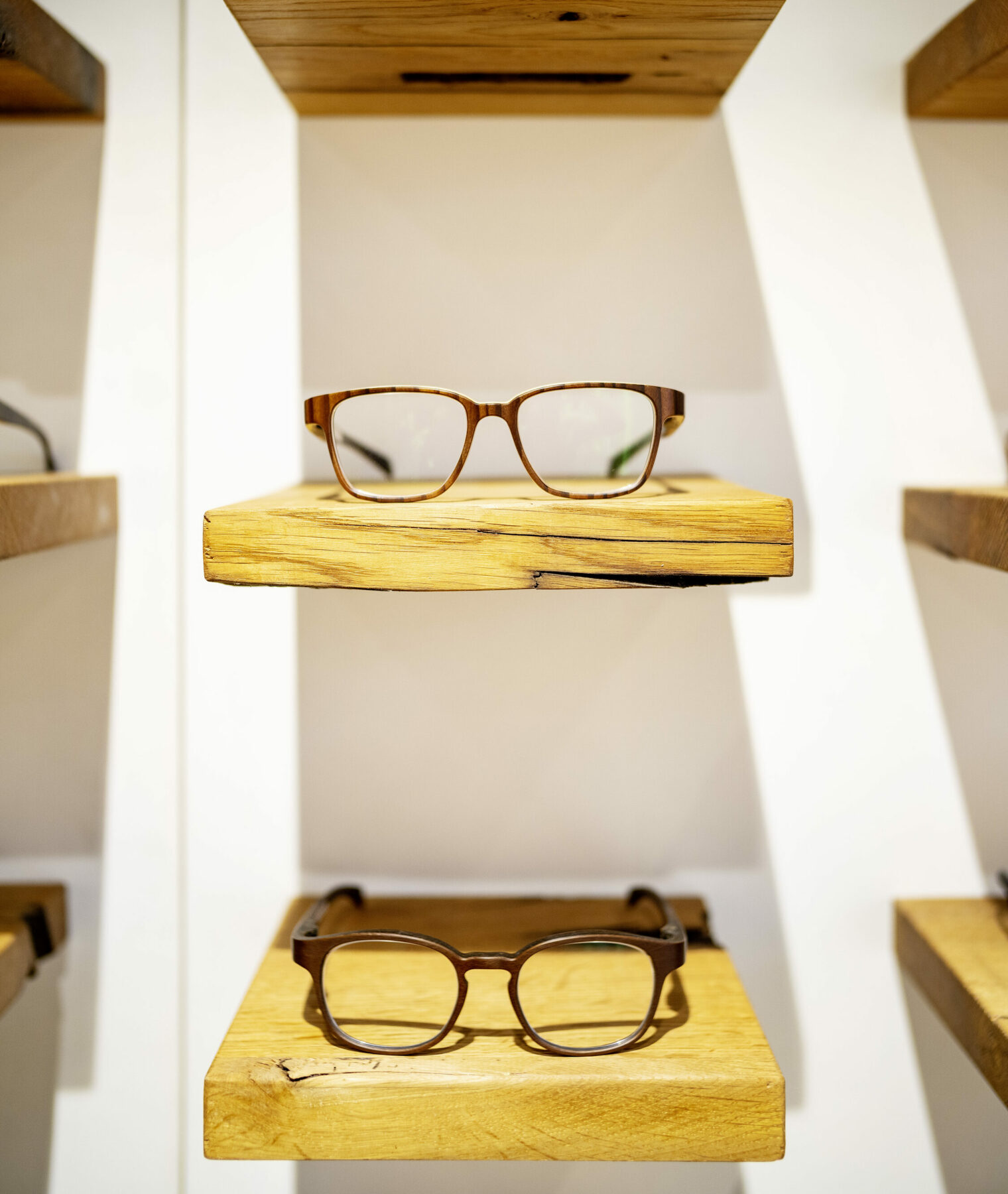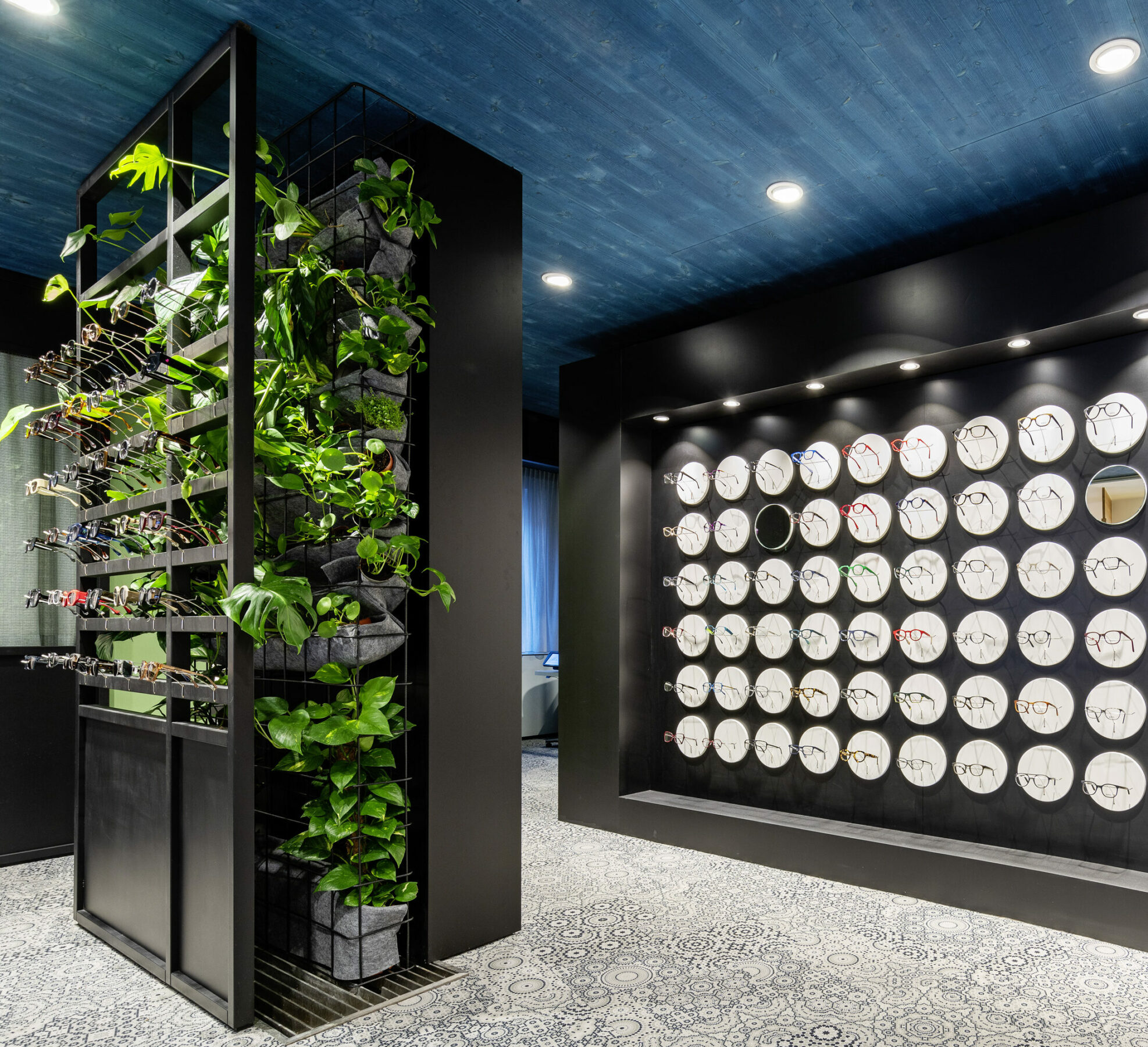Herzstück der zweistöckigen Brillenmanufaktur ist die alte verschrammte Werkbank. Ein originales Stück aus der eigenen Werkstatt, die nun Platz für die Rezeption bietet. Die bequemen Sessel, Konsolentische und Karteiwagen sind neu – auf alt gemacht – und für vertraute Verkaufsgespräche in kleinen Inseln angeordnet. Um dem geschichtsträchtigen Ort gerecht zu werden, verbindet das Mobiliar modernen Minimalismus mit dem Design der 60er-Jahre. Highlight sind natürlich nach wie vor die handgemachten Brillen, die auch als solche präsentiert werden. Auf einer schwarzen Präsentationswand bekommt jedes Modell auf einem weißen Ausschnitt seinen persönlichen Spot. Ein weiterer Hingucker ist die Pflanzenwand, die durch einen ehemaligen Brunnenanschluss bewässert wird.