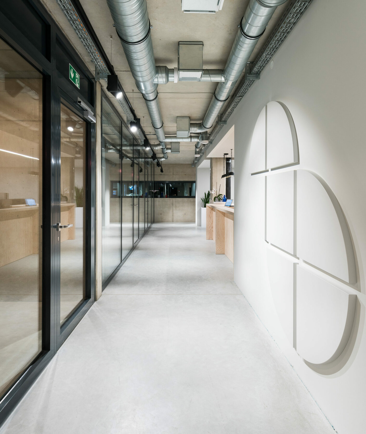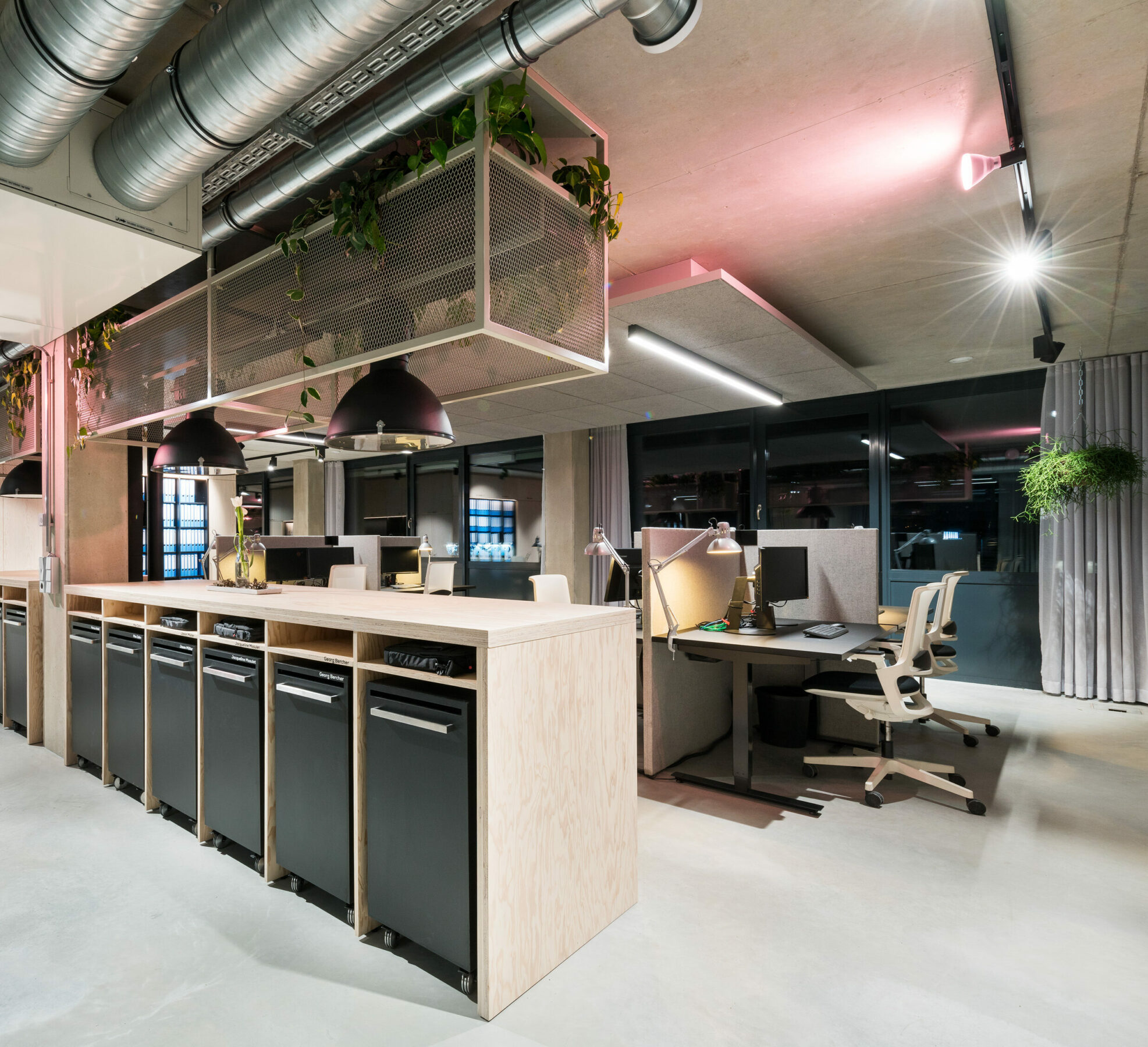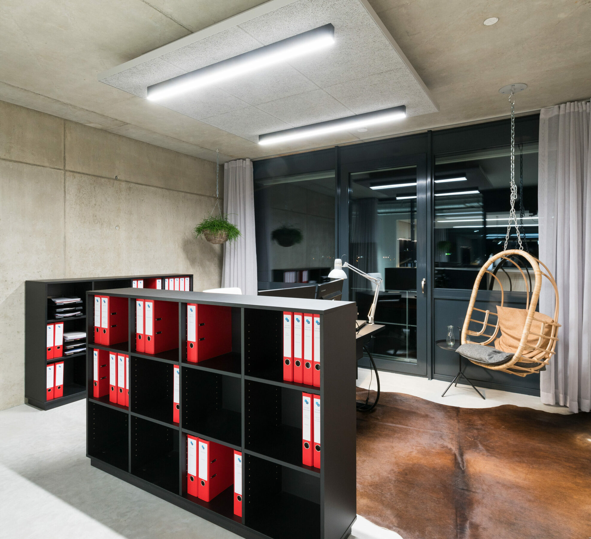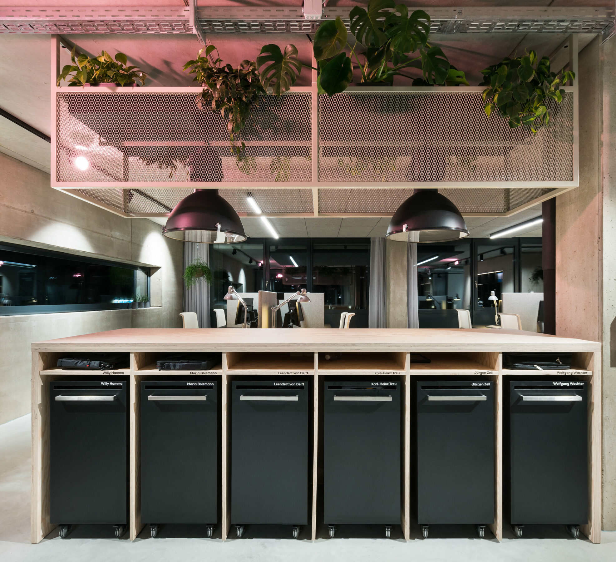 Die gedeckten Farben ziehen sich durch das ganze Büro mit 25 flexiblen Arbeitsplätzen. Lediglich im Aufenthaltsbereich setzt ein knallrotes Pflanzgitter einen farbigen Akzent. Üppige Grünpflanzen dienen sowohl dem Sichtschutz als auch dem Raum- und Wohlfühlklima in der ansonsten schlichten Umgebung. Für die Pausen steht den Mitarbeitern ein Tischkicker zur Verfügung. Hochwertige Designermöbel runden die Einrichtung ab: Galvanitas Chairs in den Besprechungsräumen, Beistelltische, Garderobe und Barhocker von Hay, Hängeleuchten und Loungechair von Zuiver sowie Rollcontainer von Bisley.