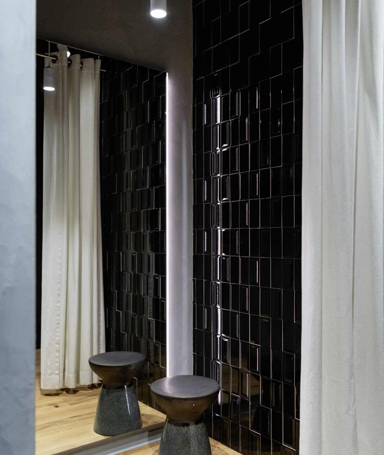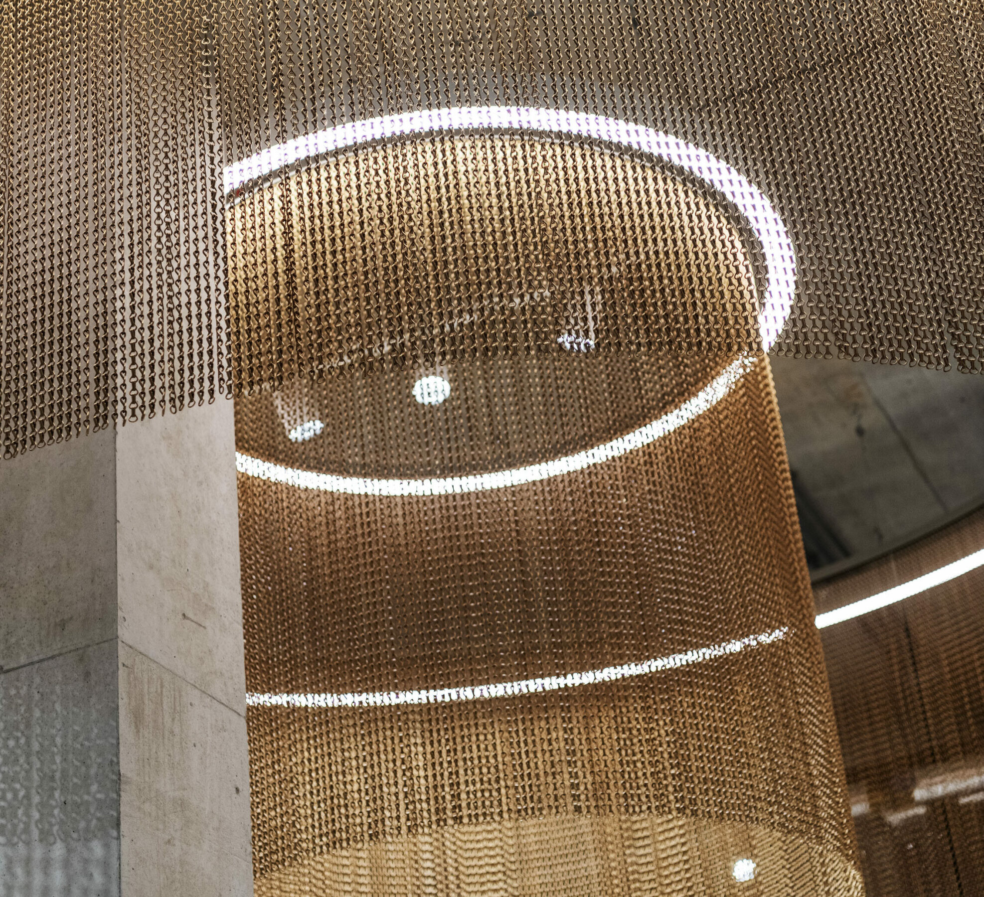 Das Tor aus schwarzem Lochblech im Eingangsbereich lässt bereits erahnen, welches Spektakel drinnen wartet. Hier wurde bewusst mit dem Transluziden gespielt. Im Innenbereich ist der puristisch-urbane Flair überall spürbar. Dazu tragen die offenen Leitungen, die Sichtbetonwände, die rauen Pfeiler und der Estrichboden bei. Gezielt gesetzte Goldelemente sorgen für sanft-warme Akzente. Gekonnt kombiniert gehen die glänzenden Materialien und roughen Strukturen eine Symbiose ein.