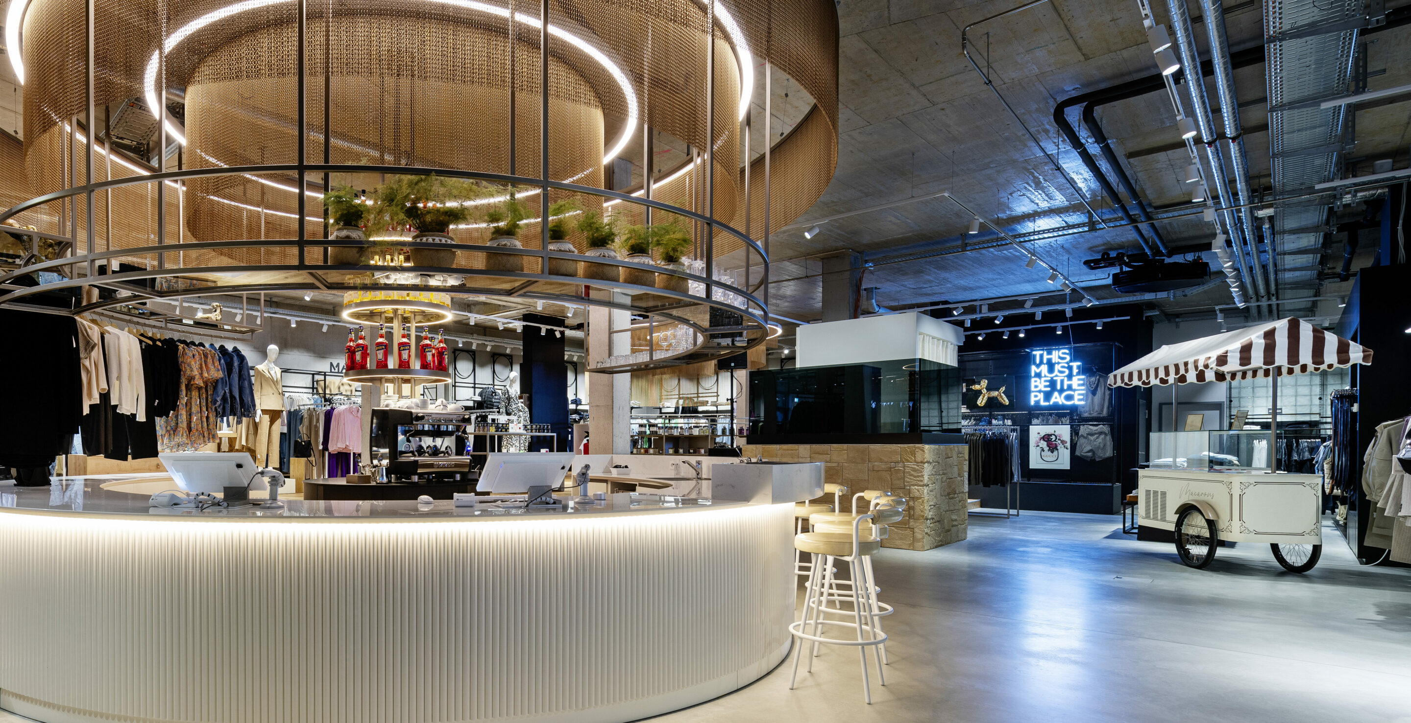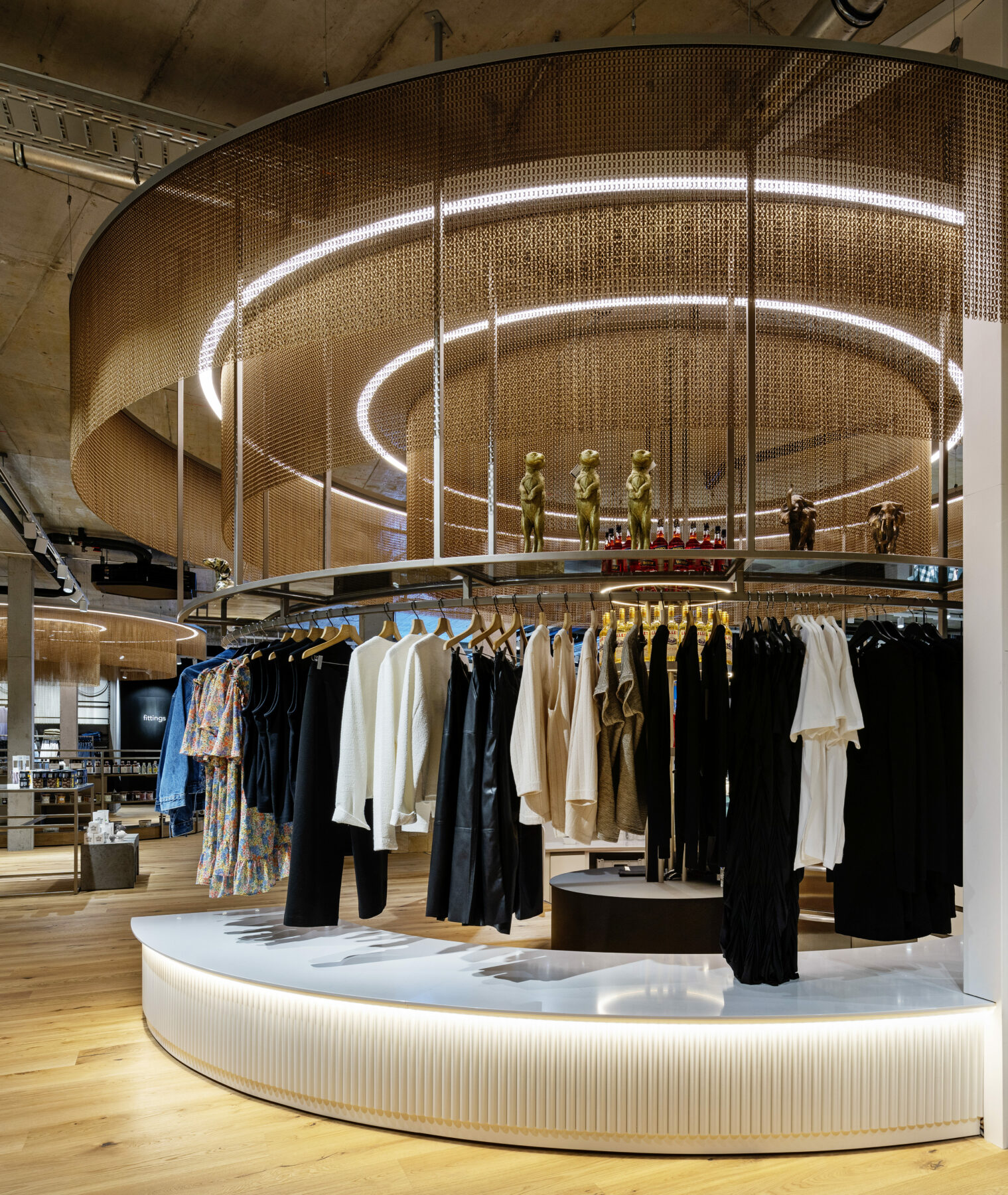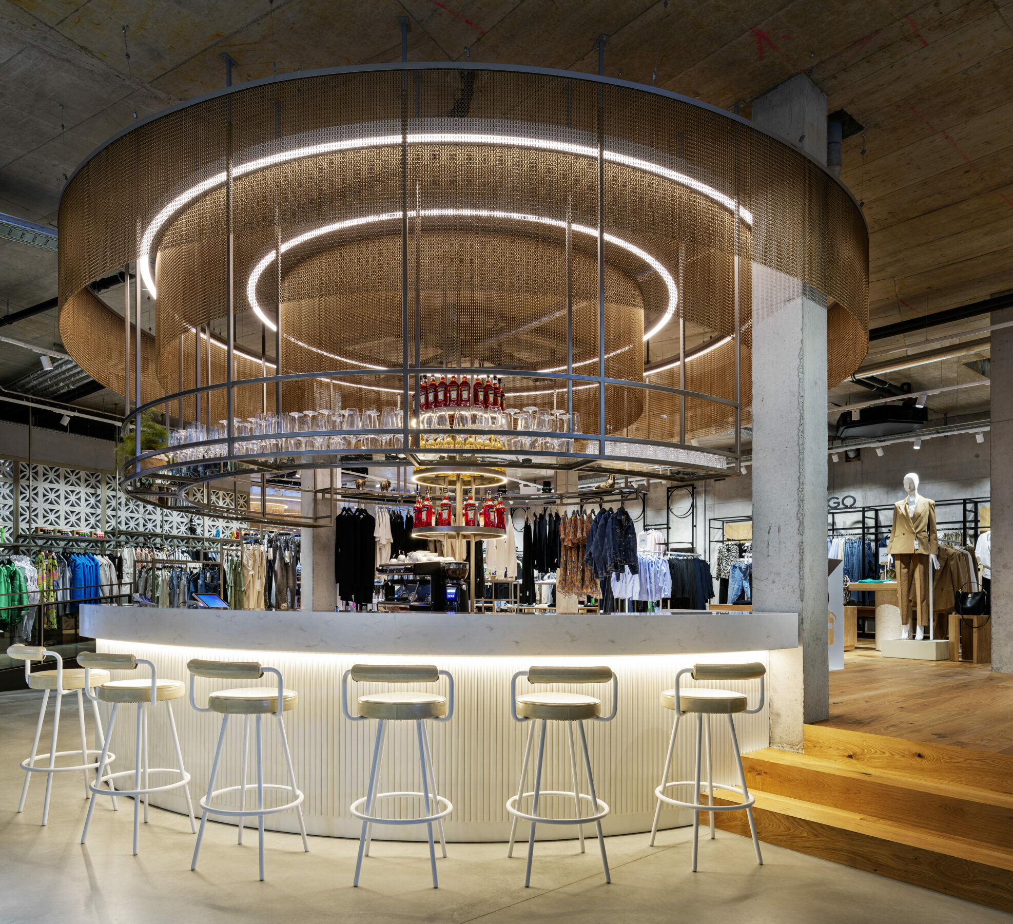Runde Inseln zum Stöbern sorgen für Struktur und bieten erlesenen Produkten eine Bühne. Überall verbergen sich charmante Schätze, die entdeckt werden wollen. Eine besondere Insel: Das DJ-Pult, von dem aus der Soundtrack zum Shopping-Erlebnis geliefert wird. Der Mittelpunkt des Concept Stores ist sicherlich die dekadente Bar. Über ihr triumphiert eine Lampe aus unzähligen Goldketten, die sich gekonnt vom puristisch urbanen Stil abhebt. Gäste genießen hier spritzige Gin-Kreationen oder frischen Kaffee. Schnell wird klar: Hier möchte man bleiben! Am liebsten ewig. Morgen wieder hier?