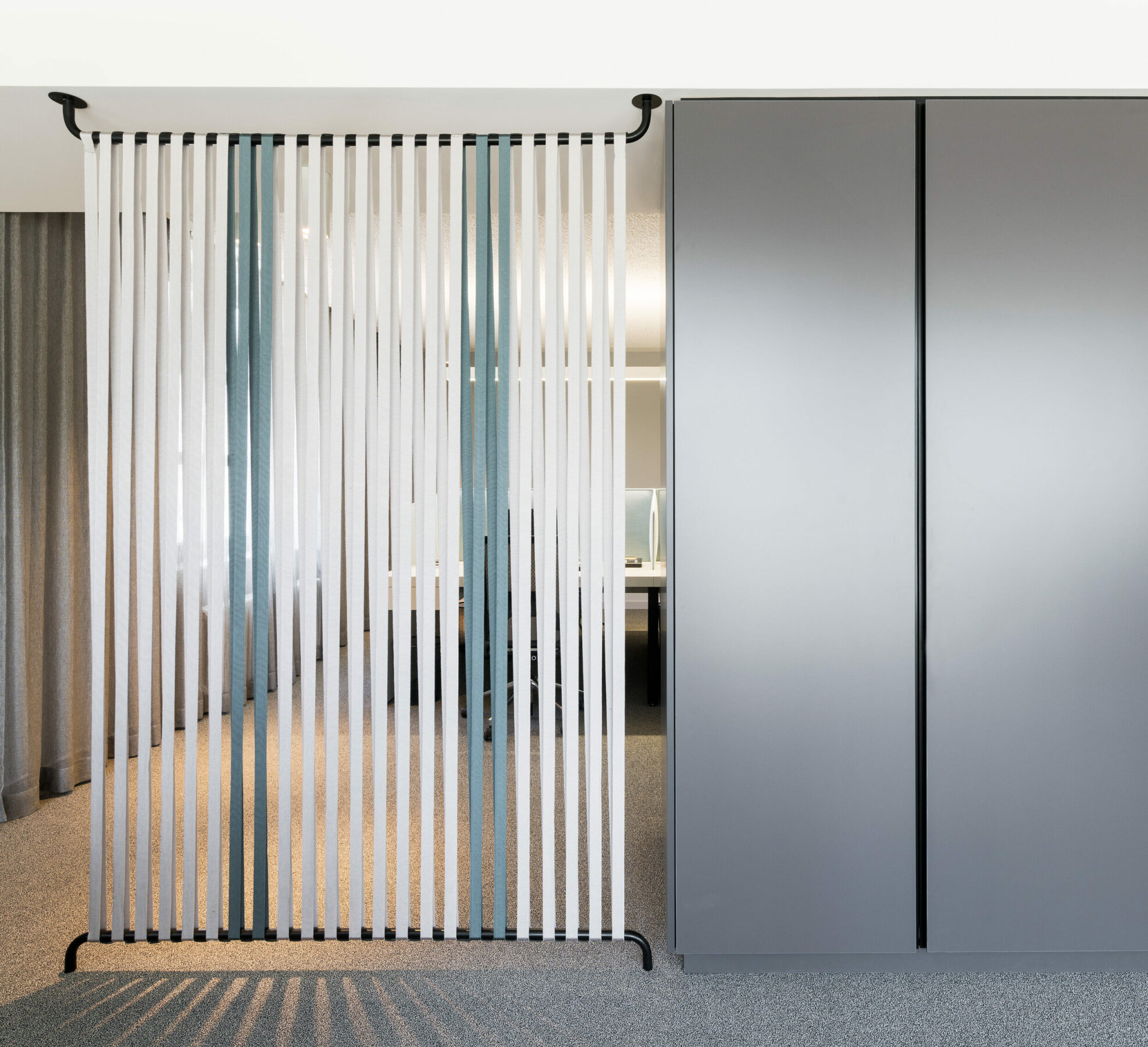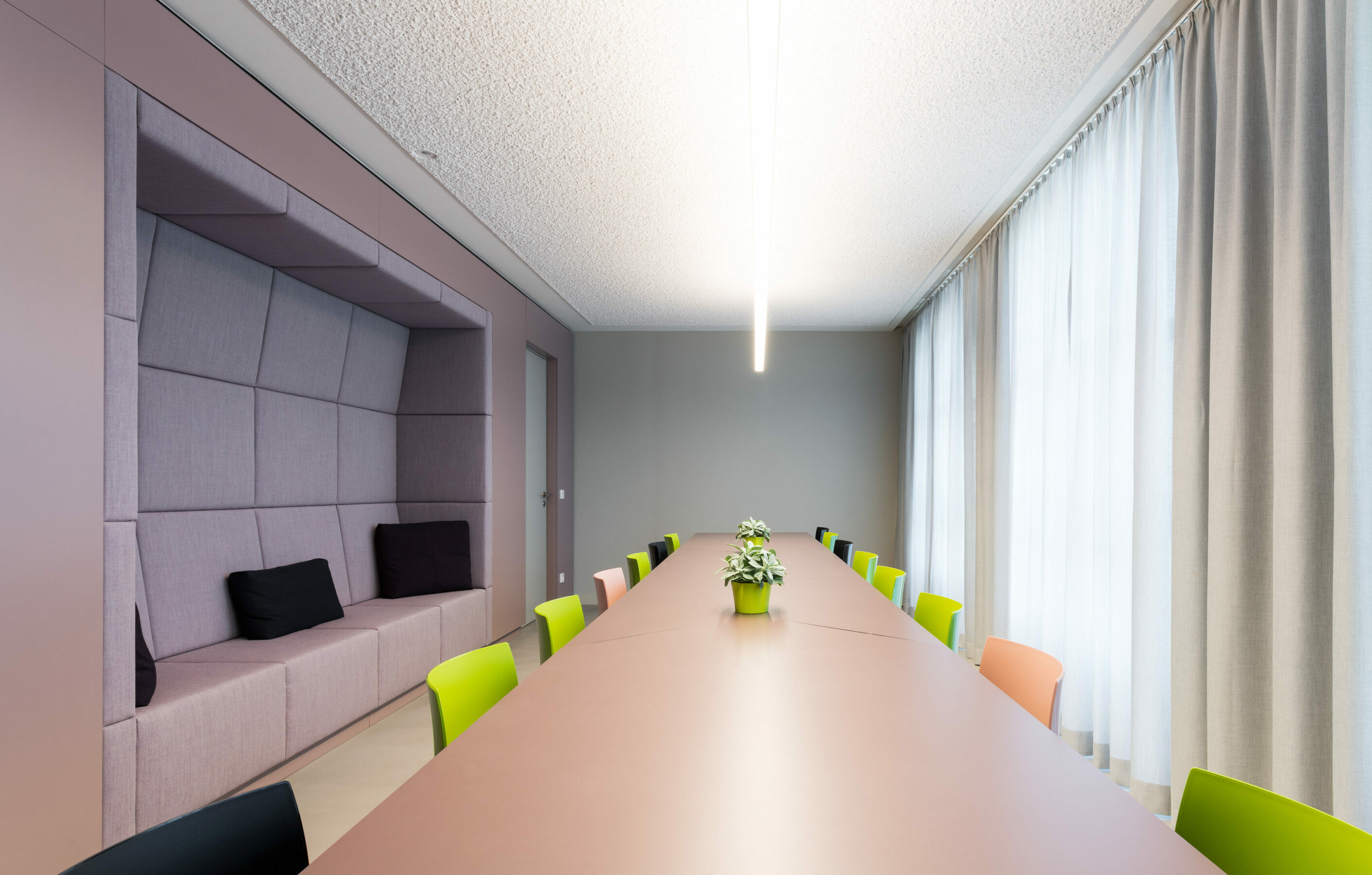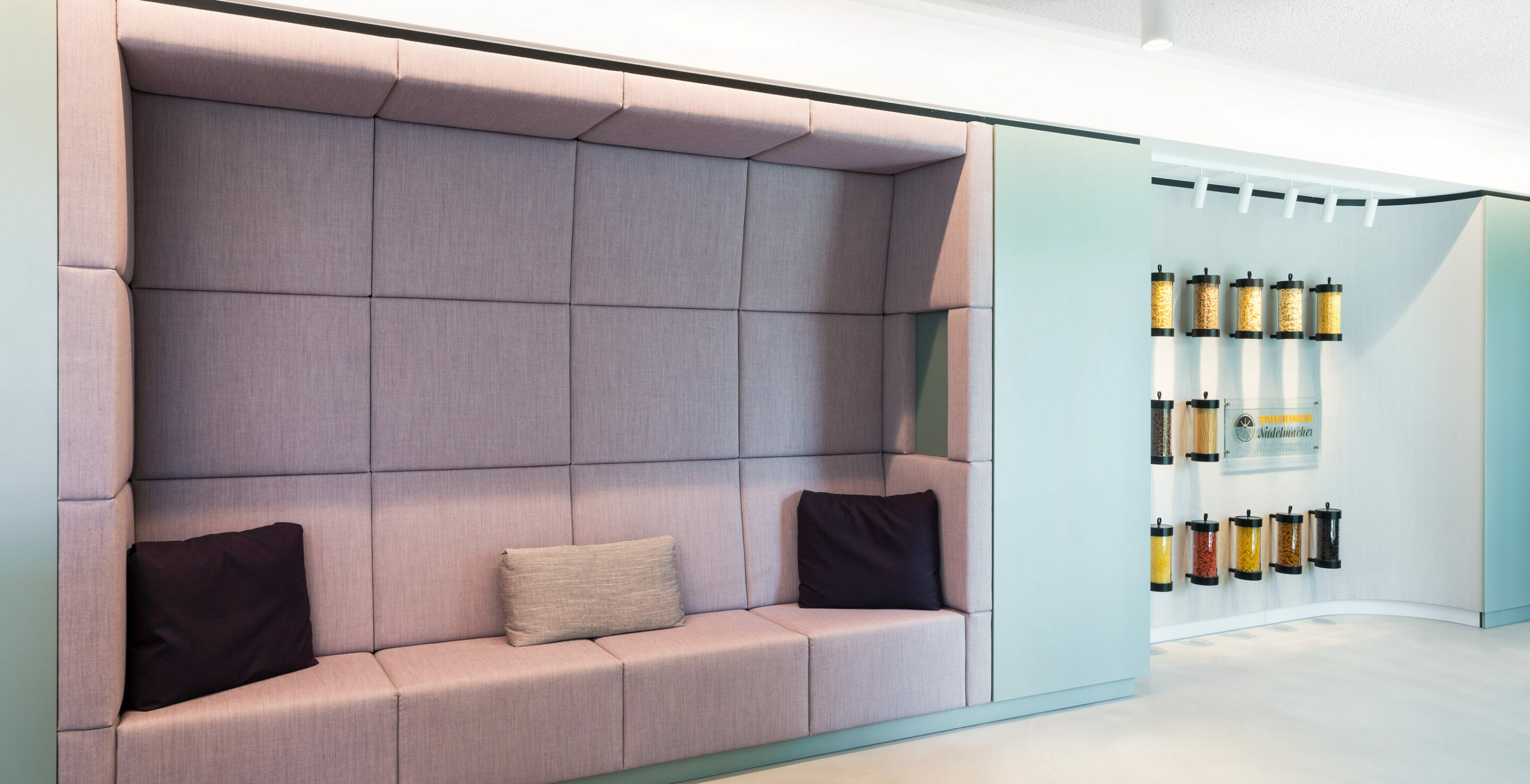 Wegen der Offenheit und Großzügigkeit der Büroräumlichkeiten wurde wo möglich mit schallabsorbierenden Elementen gearbeitet. Sitznischen mit dicken Polstern, sowie entsprechende Deckenmaterialien, partielle Teppichböden und Vorhänge vor den Fenstern tun ihr übriges. Lässig verspannte Gurte an mobilen Trägergestellen verschaffen Privatsphäre, ohne zu wuchtig zu sein oder komplett abzutrennen.