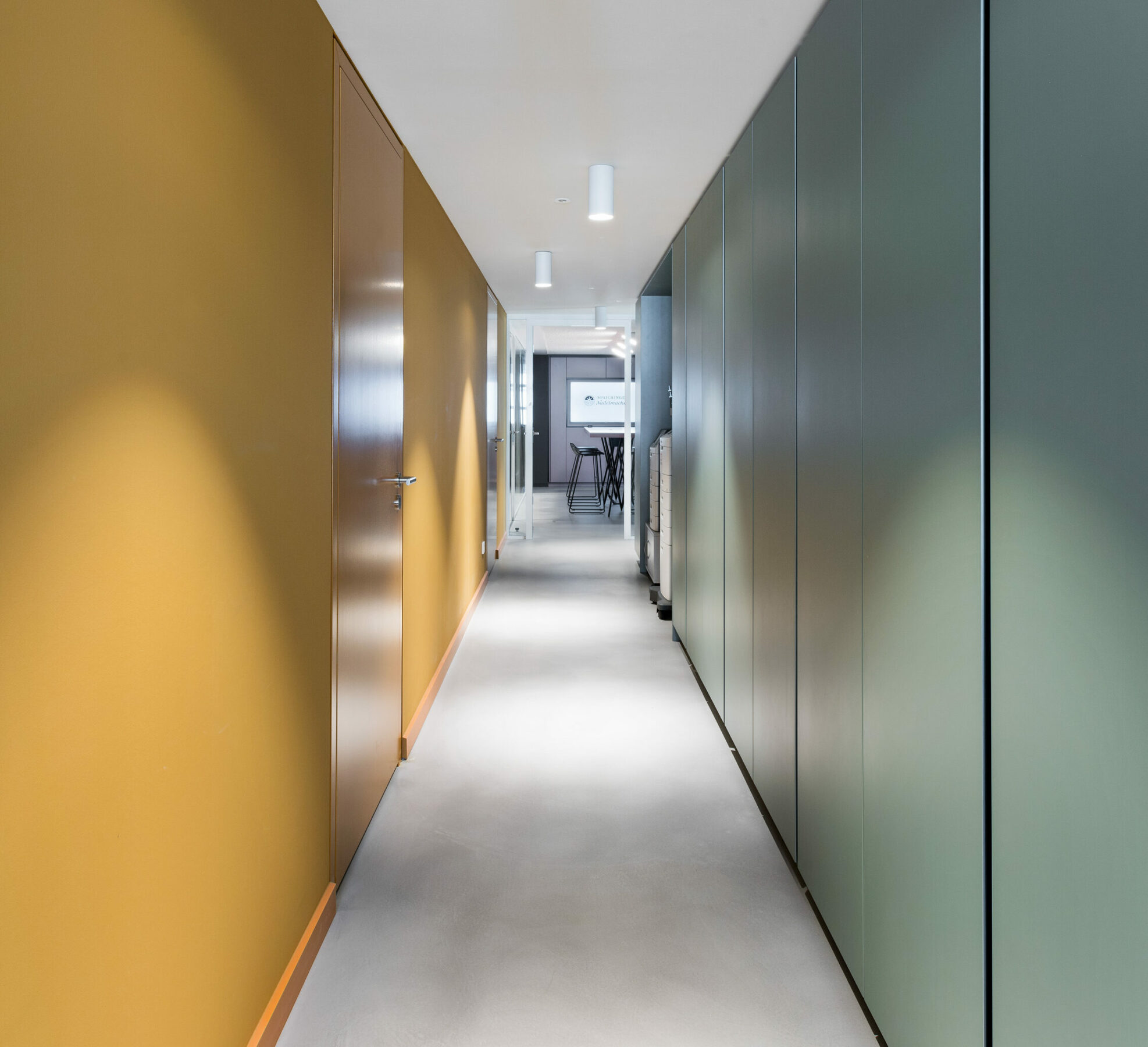 Entstanden ist ein Arbeitsumfeld, in dem man gern in den Tag startet. Die ursprünglichen Einzelbüros wurden zum größten Teil in offene Räume verwandelt. Im Erdgeschoss sind der Empfang, die Verwaltung und die Qualitätssicherung beheimatet. Im ersten Obergeschoss tümmeln sich Vertrieb und Marketing. Außerdem gibt hier noch eine große Gemeinschaftsküche mit echter Aufenthaltsqualität. Im Stockwerk darüber befinden sich die Buchhaltung und die Büros der Geschäftsleitung.