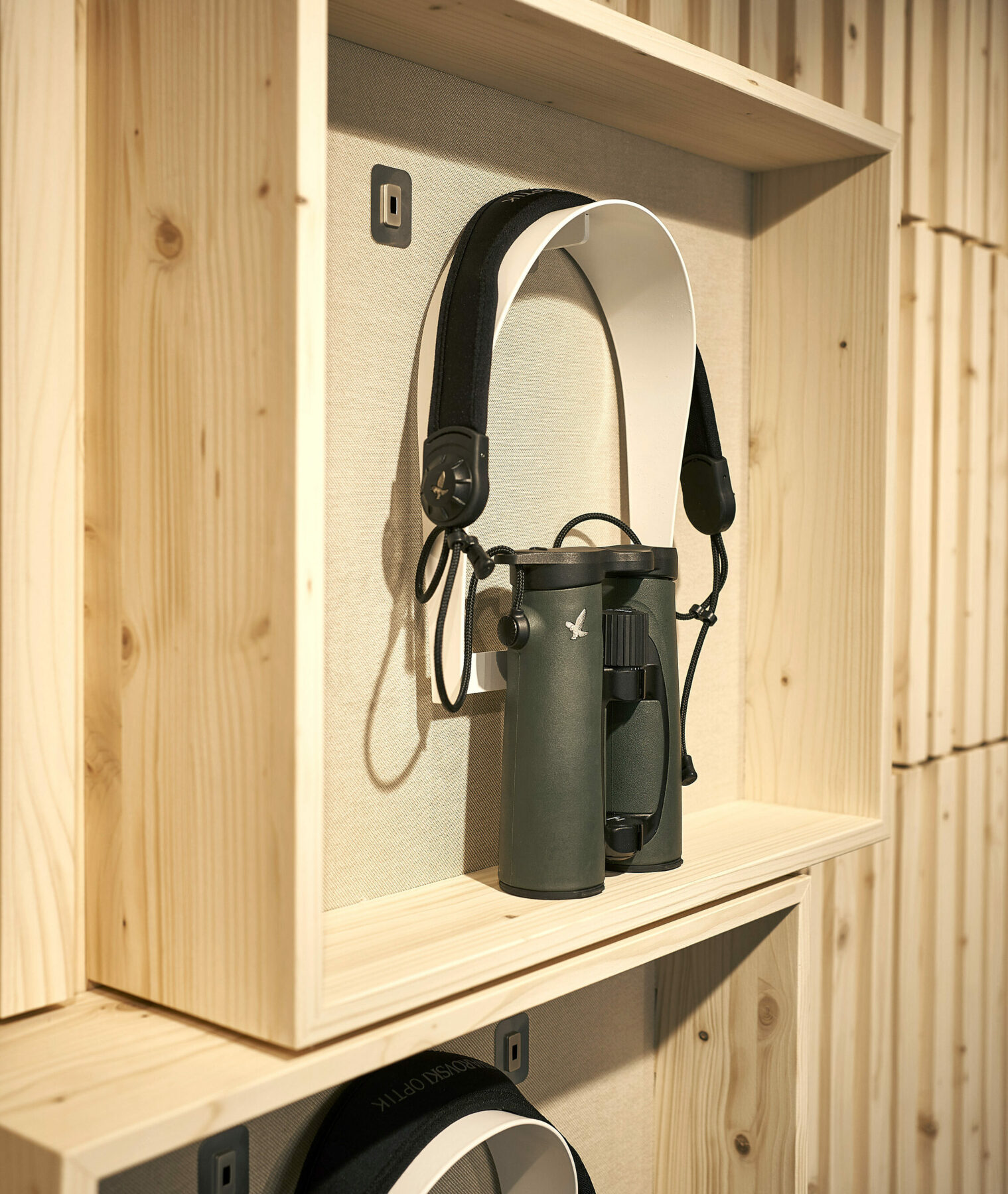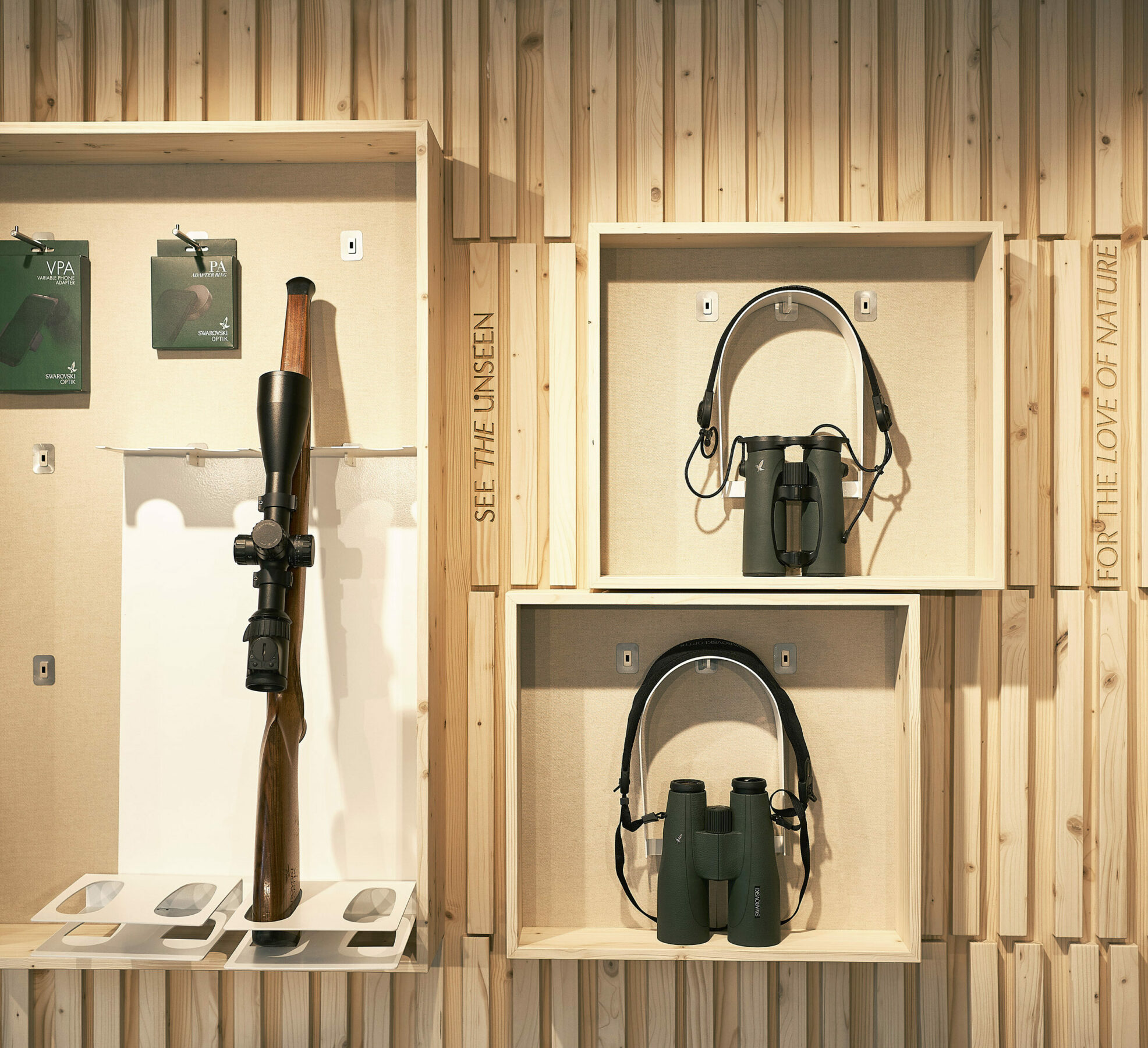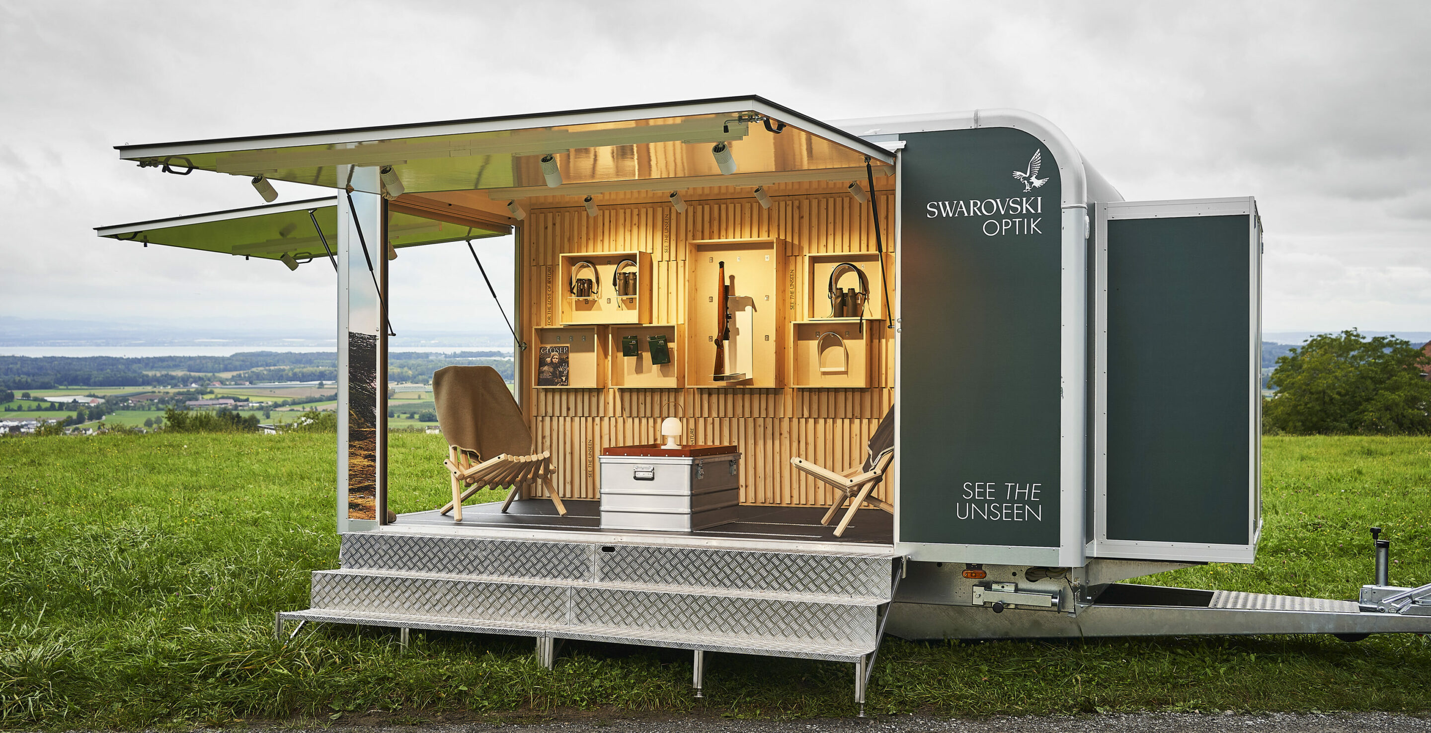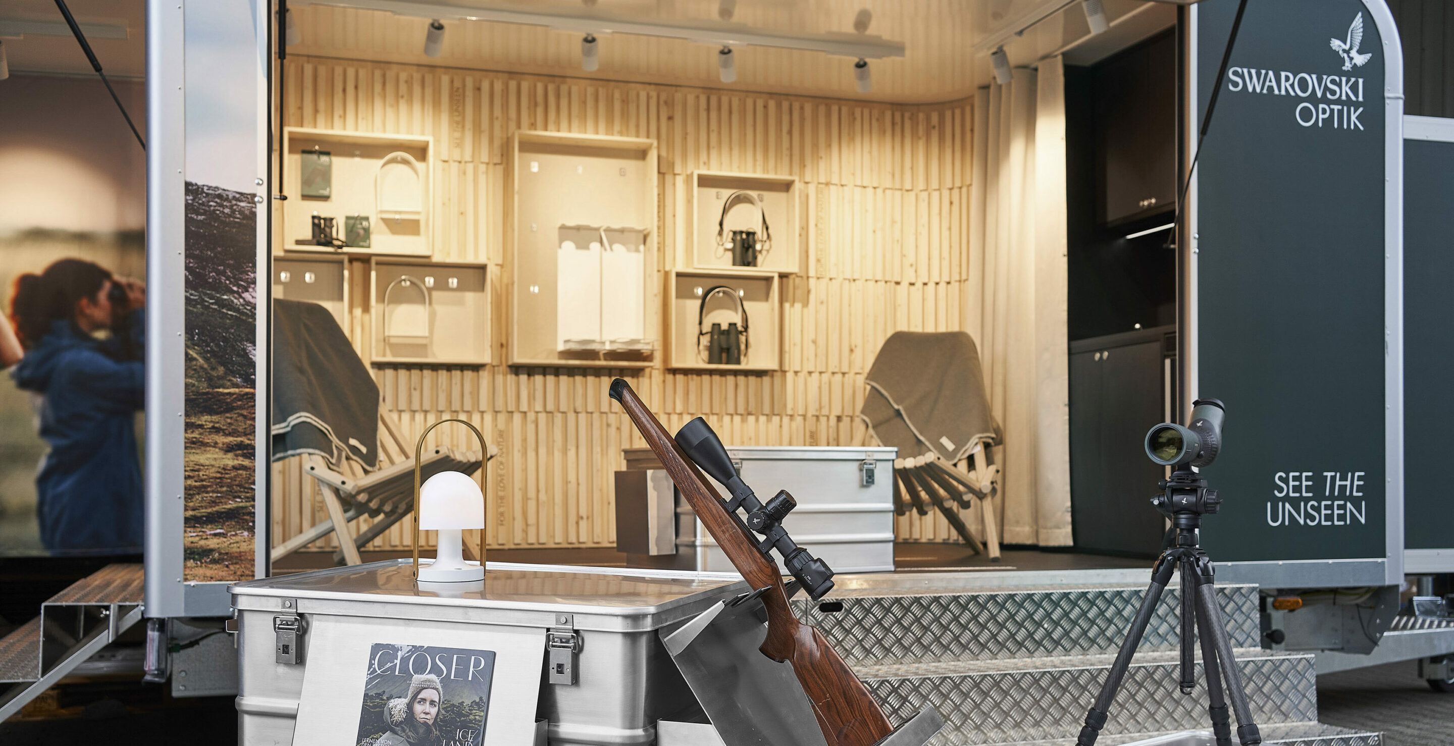 Damit geht das Unternehmen aus Tirol einen neuen Weg und zeigt die Ferngläser, Teleskope, Stative & Co. dort, wo sie auch zum Einsatz kommen: in der Natur. Und die skandinavischen Länder bieten dafür eine gigantische Kulisse. Der Trailer selbst öffnet sich einladend in das Szenario. Das Nadelholz, die Naturtextilien und die warme Lichtstimmung erinnern eher an eine heimelige Hütte als an einen Verkaufsstand. Wie selbstverständlich fügen sich die Swarovski Produkte in das Interieur ein und wirken in den eigens entwickelten Wandkuben fast wie Kunstwerke. Da möchte man sich einfach in den Sessel schmiegen und – mit einem Jägertee in der Hand – den Blick per Fernglas in die Weite der Landschaft schweifen lassen.