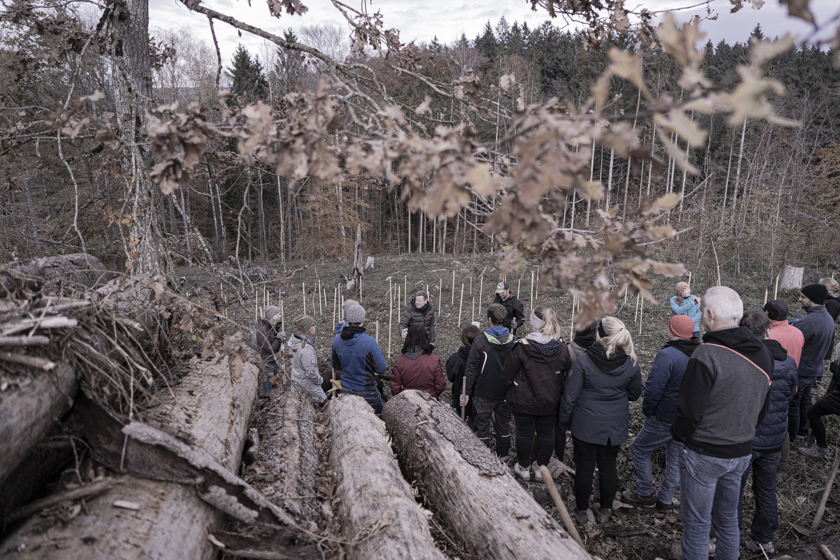 Als wir so vor uns hin grübelten, erzählte unser Andi Reschtle in der Mittagspause, dass seine Bäume gestorben sind – vom Borkenkäfer befallen. Da dachten wir: Warum machen wir es nicht beim Andi? Hier in unserer Region am Bodensee und alle packen mit an.