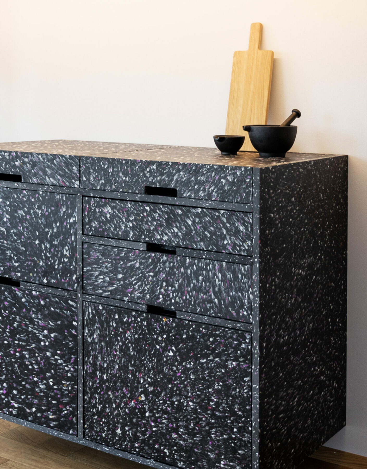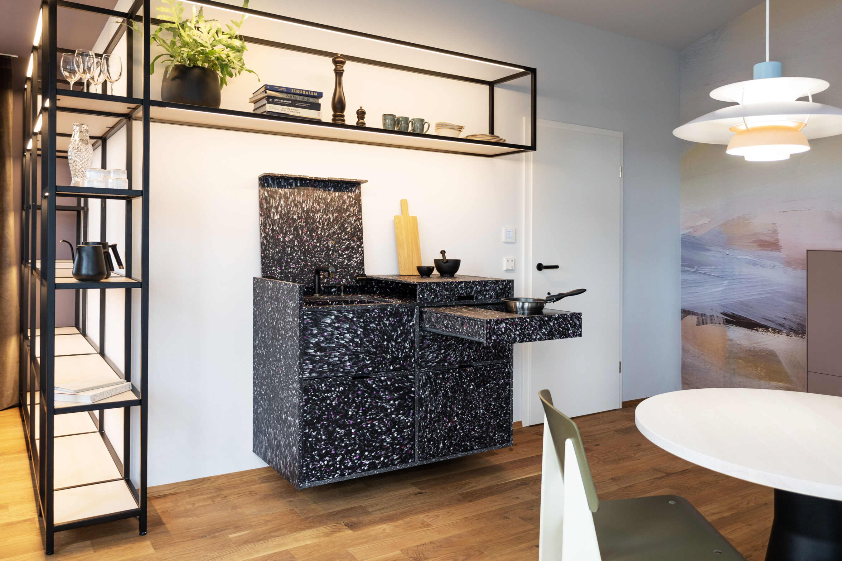 Unsere Küchenplaner:innen haben sich einiges überlegt. Die fancy PET-Pantry ist nicht nur ein Hingucker, sondern auch ein echtes Raumwunder: mit ausziehbarem Kochfeld, PET-Spülbecken, integriertem Kühlschrank und Stauraum. Durch die absenkbare Armatur kann man den „Deckel“ der Küche schließen – Küche wird zu Kommode.